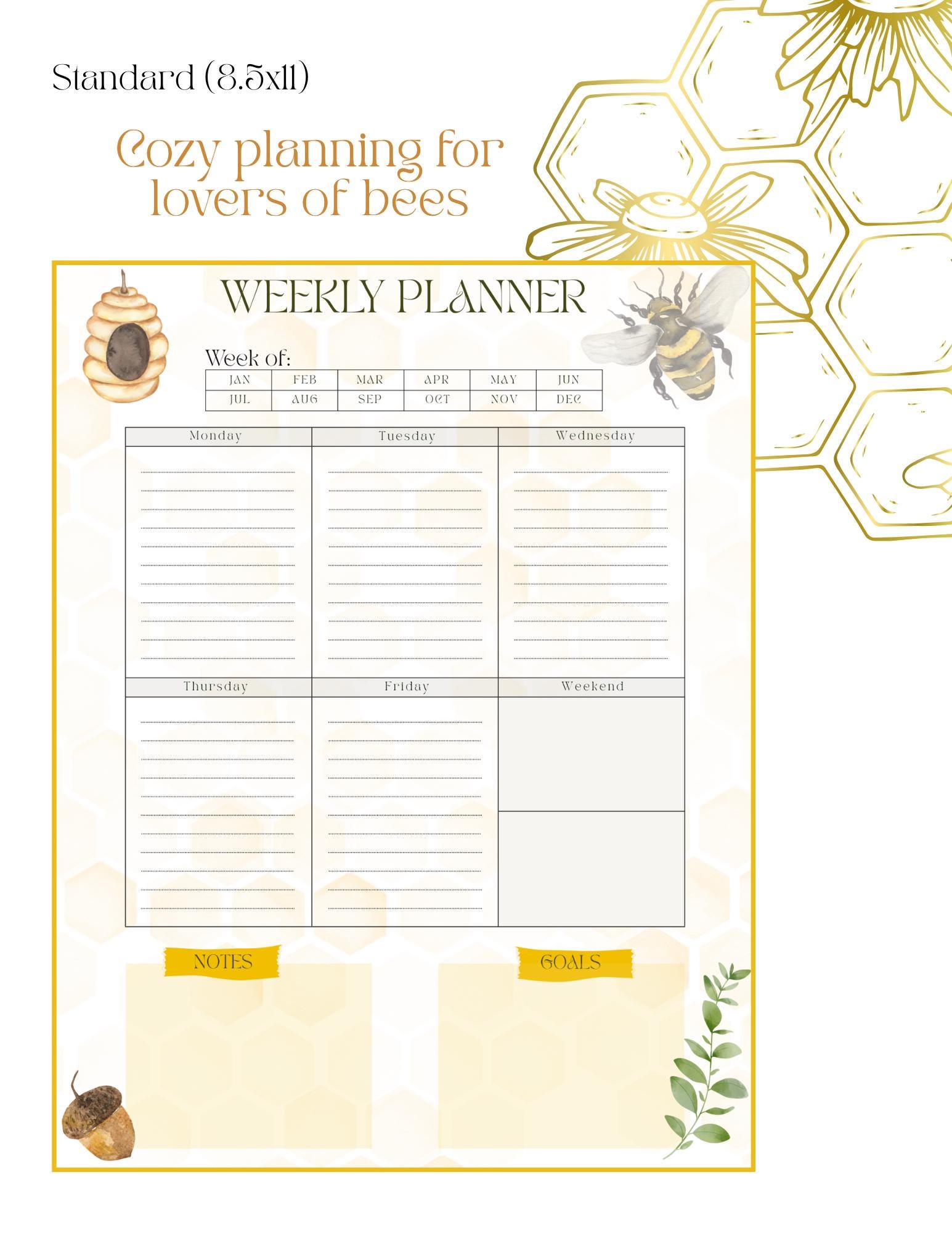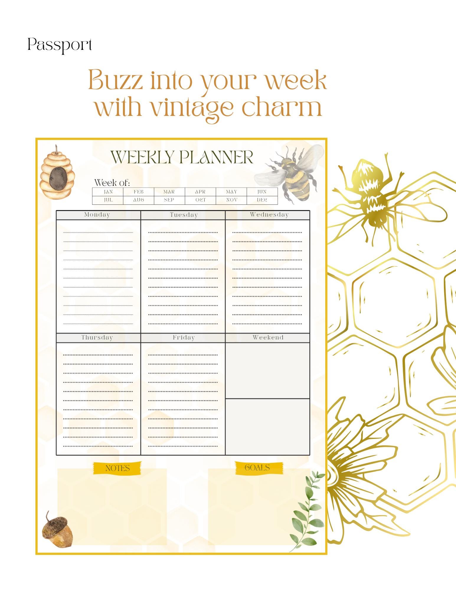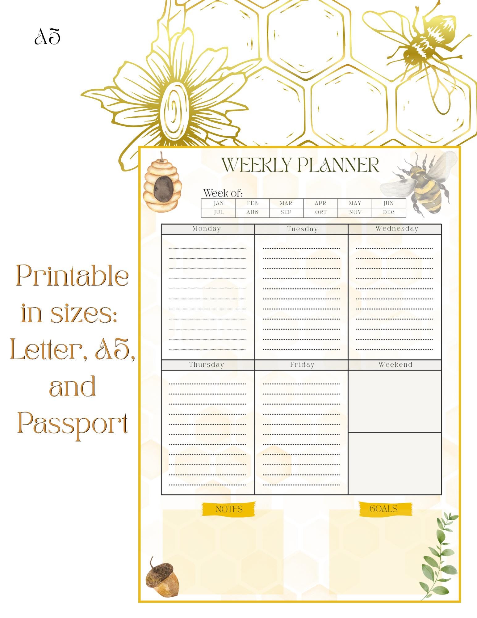Layout Overview: “Week Of” header with monthly boxes to mark your chosen month Six main sections for Monday through Friday and a combined Weekend space Separate Goals and Notes sections for clear weekly focus