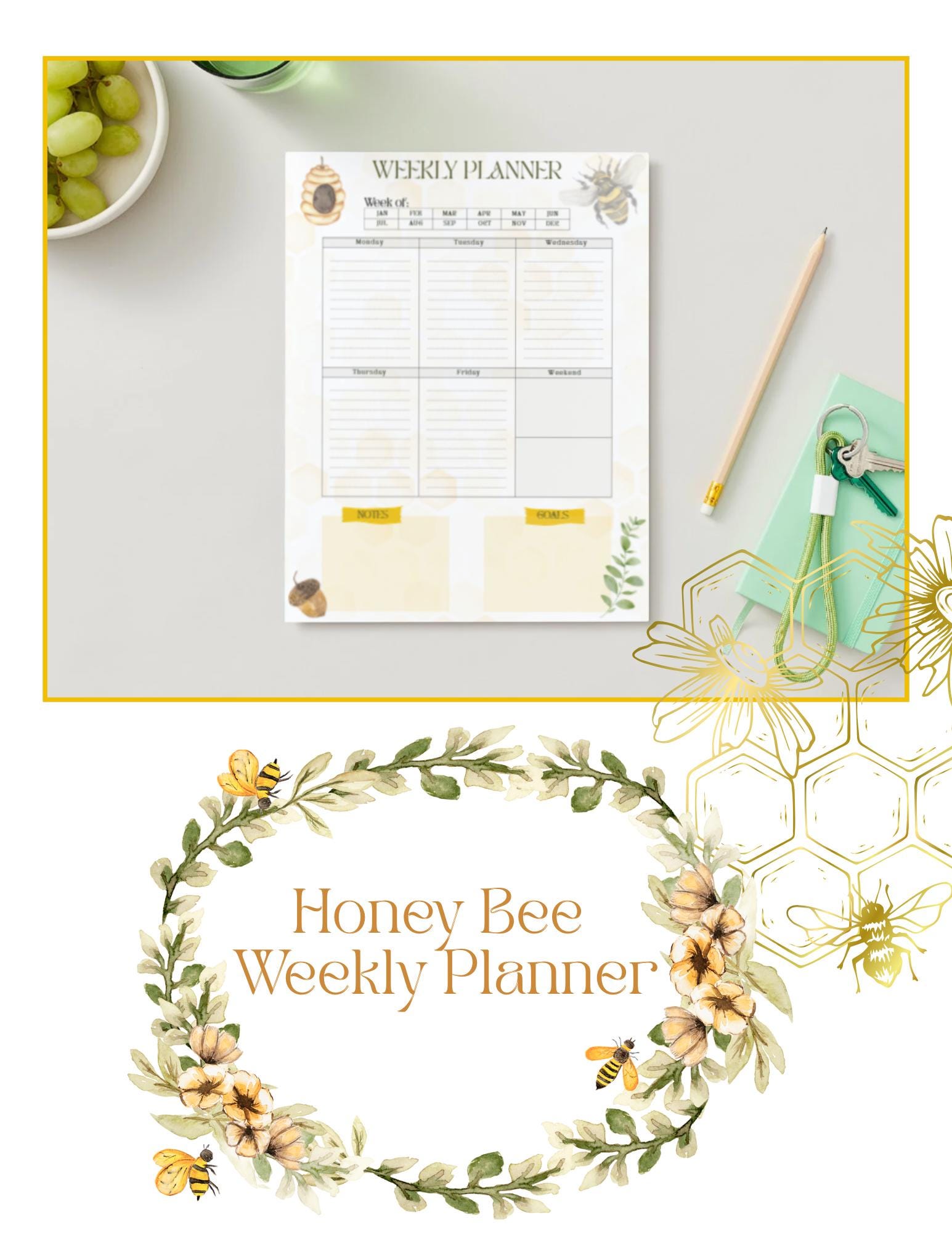 Stay organized with vintage charm. This bee-themed weekly planner combines gentle watercolor art and practical structure for a cozy, balanced week. Bring warmth and focus to your week with our Bee Weekly Planner Printable. Designed to pair seamlessly with the matching daily planner, this layout blends function with natural beauty — perfect for those who love vintage stationery and nature-inspired design.