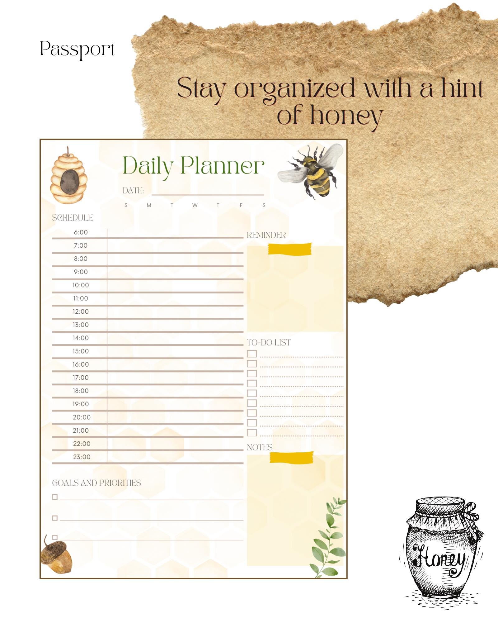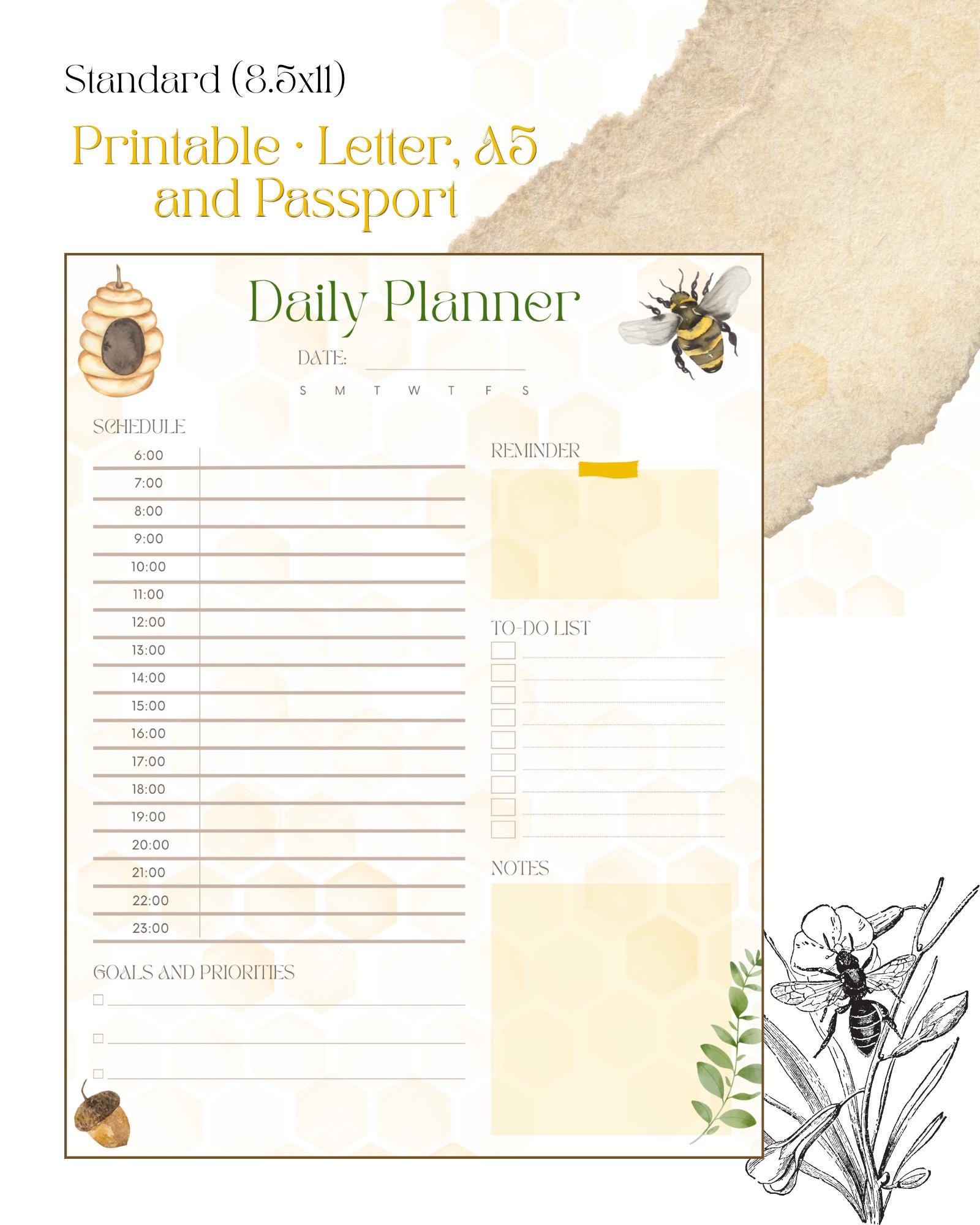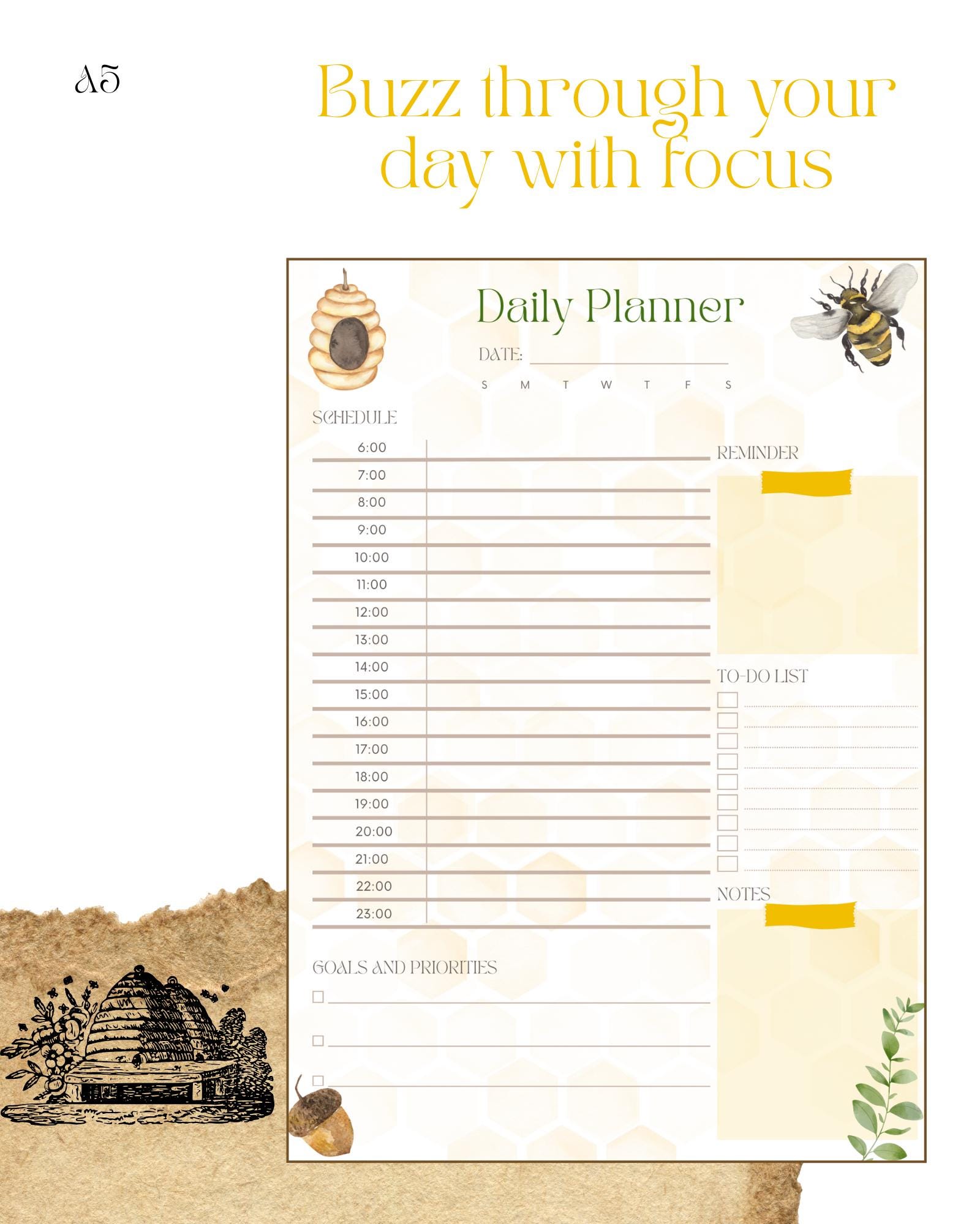 Design Details: This planner features soft watercolor artwork with a beehive in the top left corner, a bee in the top right, an acorn in the bottom left, and ivy in the bottom right. Subtle honeycomb accents along each side of the page complete the design, giving it a gentle, vintage look that feels warm and natural.