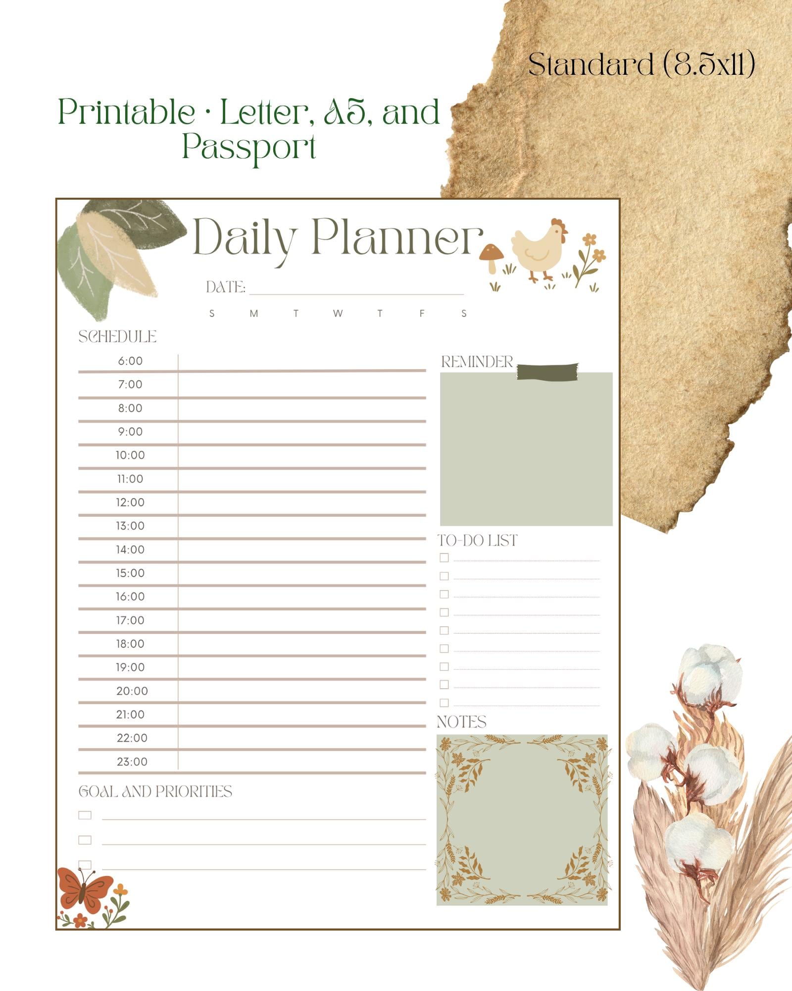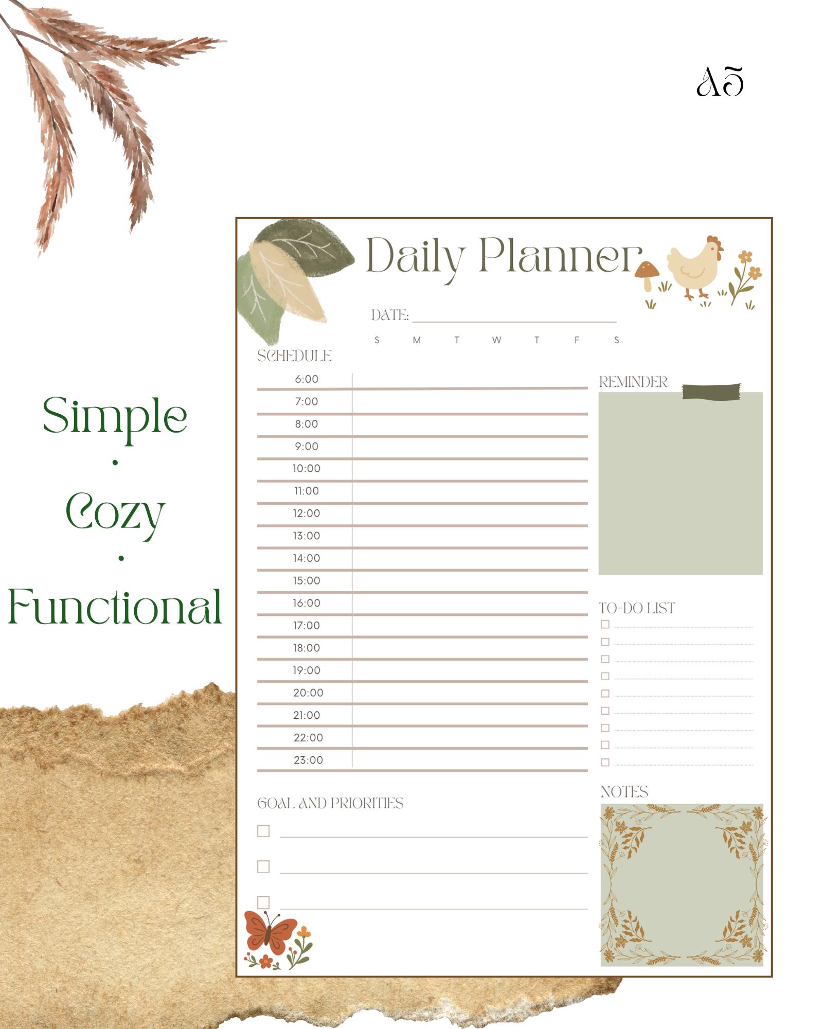 Design Details: This planner has a soft, rustic charm with a whimsical watercolor chicken in the top right corner and a matching butterfly in the bottom left, both illustrated in a cozy, storybook style. The top left corner features three softly painted leaves, and the Notes section is framed by a delicate border of sketched leaves in dark red pencil, adding a handcrafted feel without overwhelming the page.