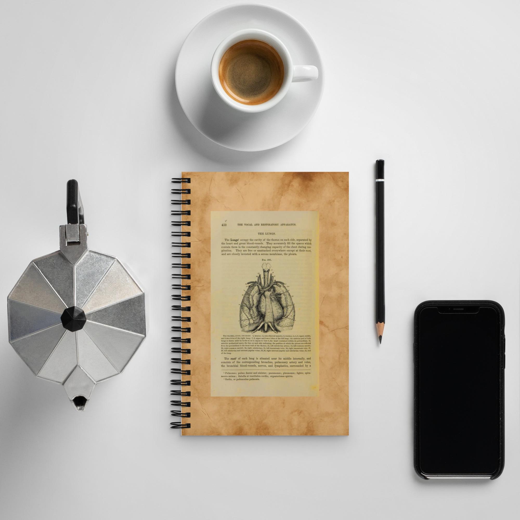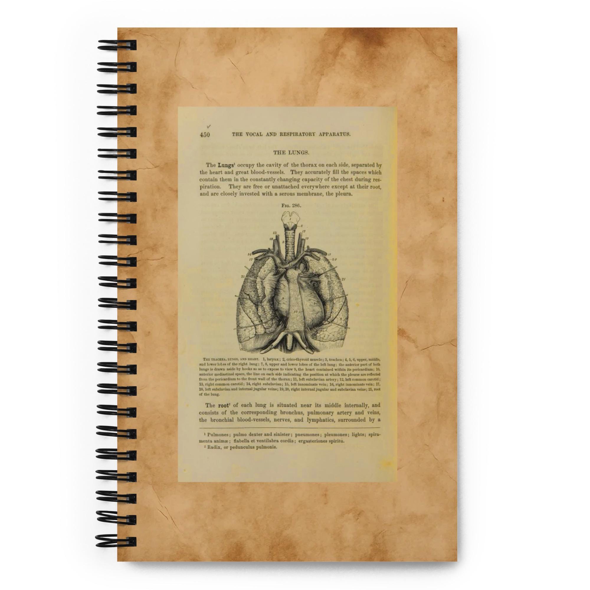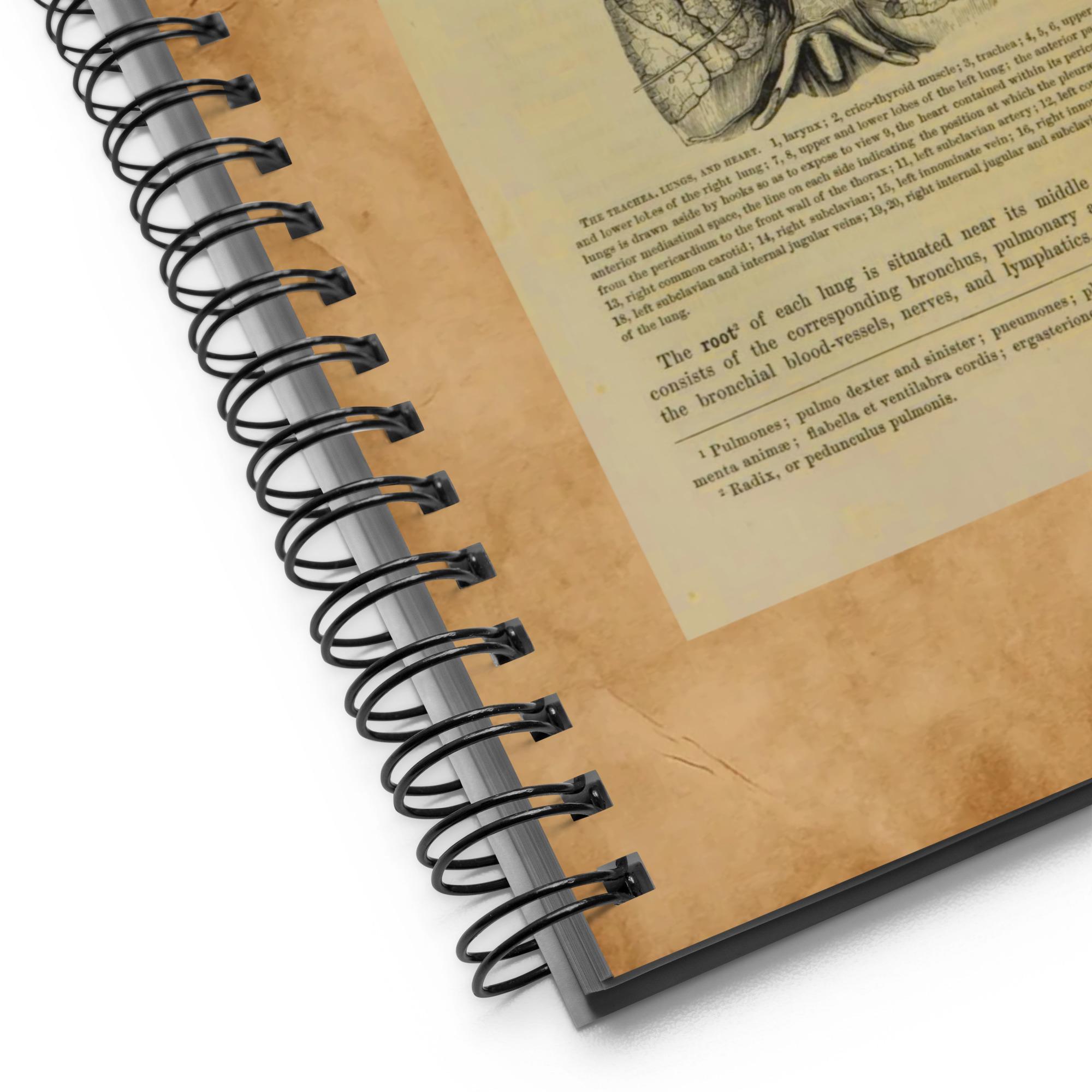 Embrace the charm of old libraries and anatomy studies — a 140-page spiral notebook featuring a genuine antique medical book page cover.