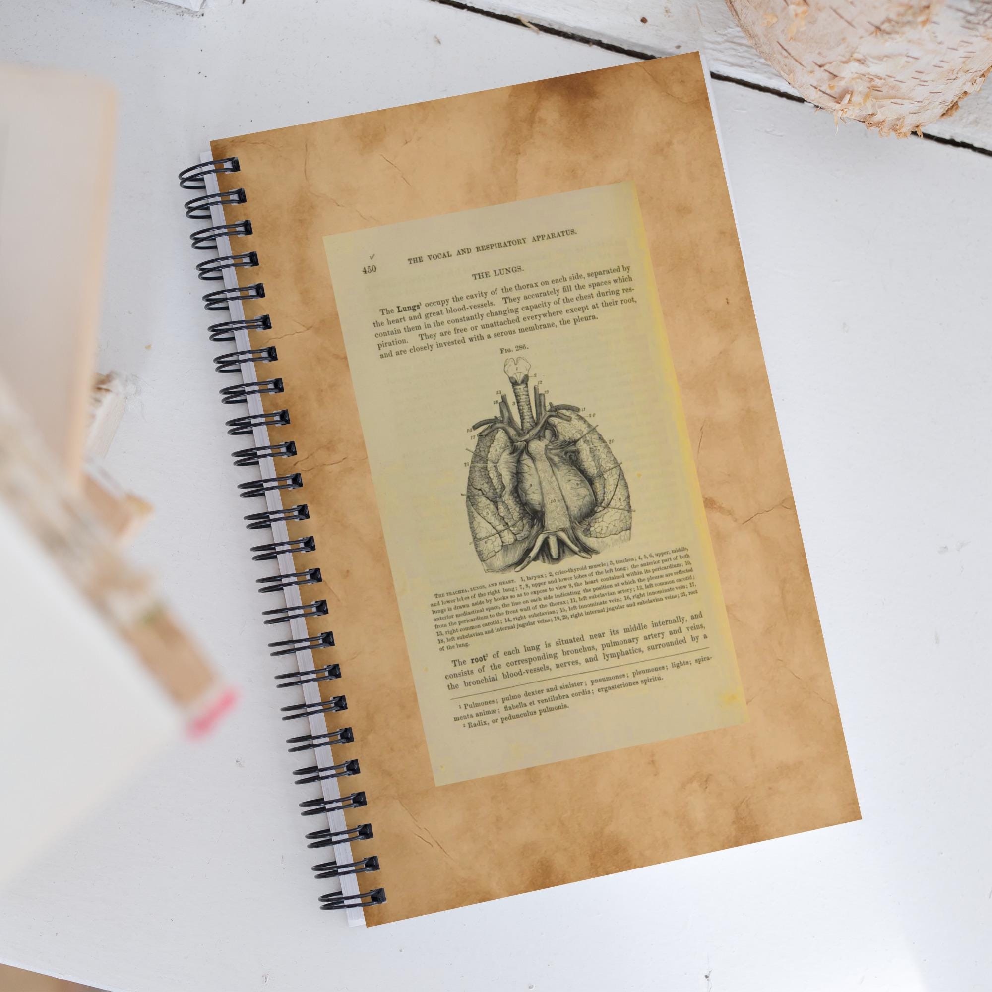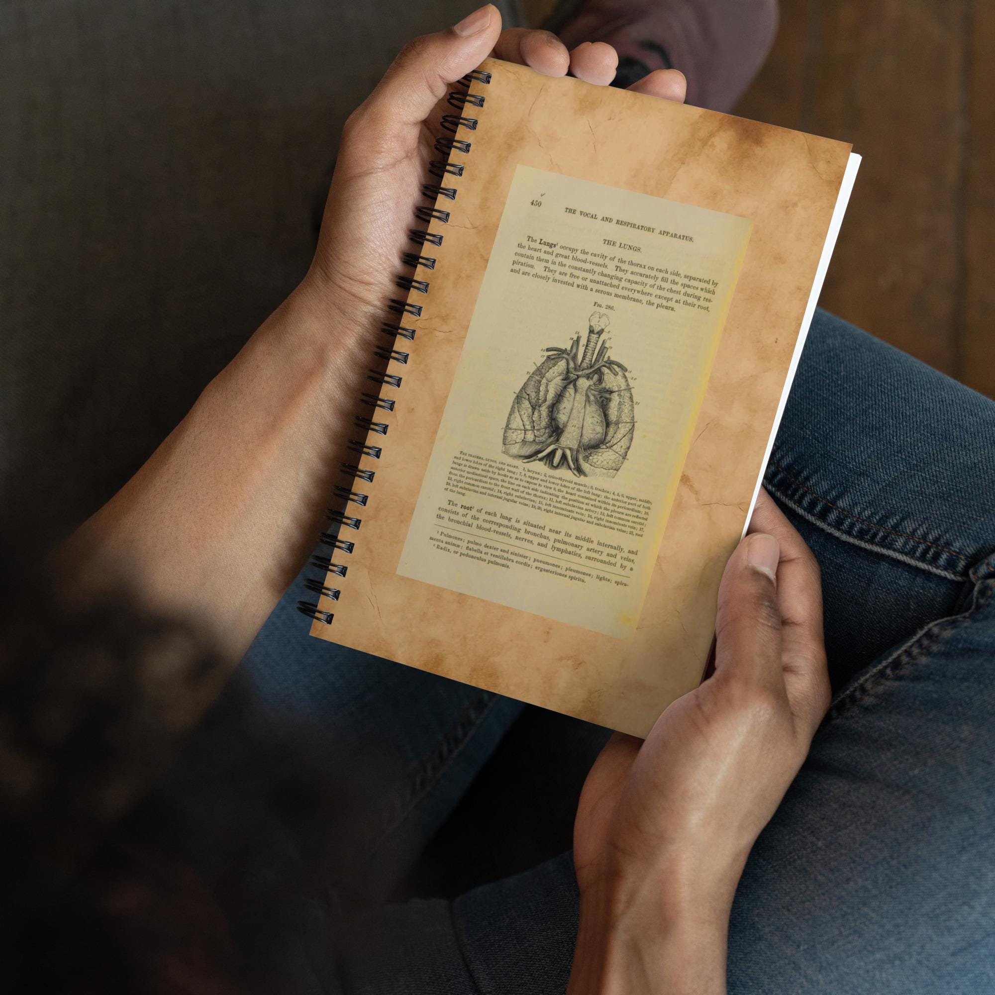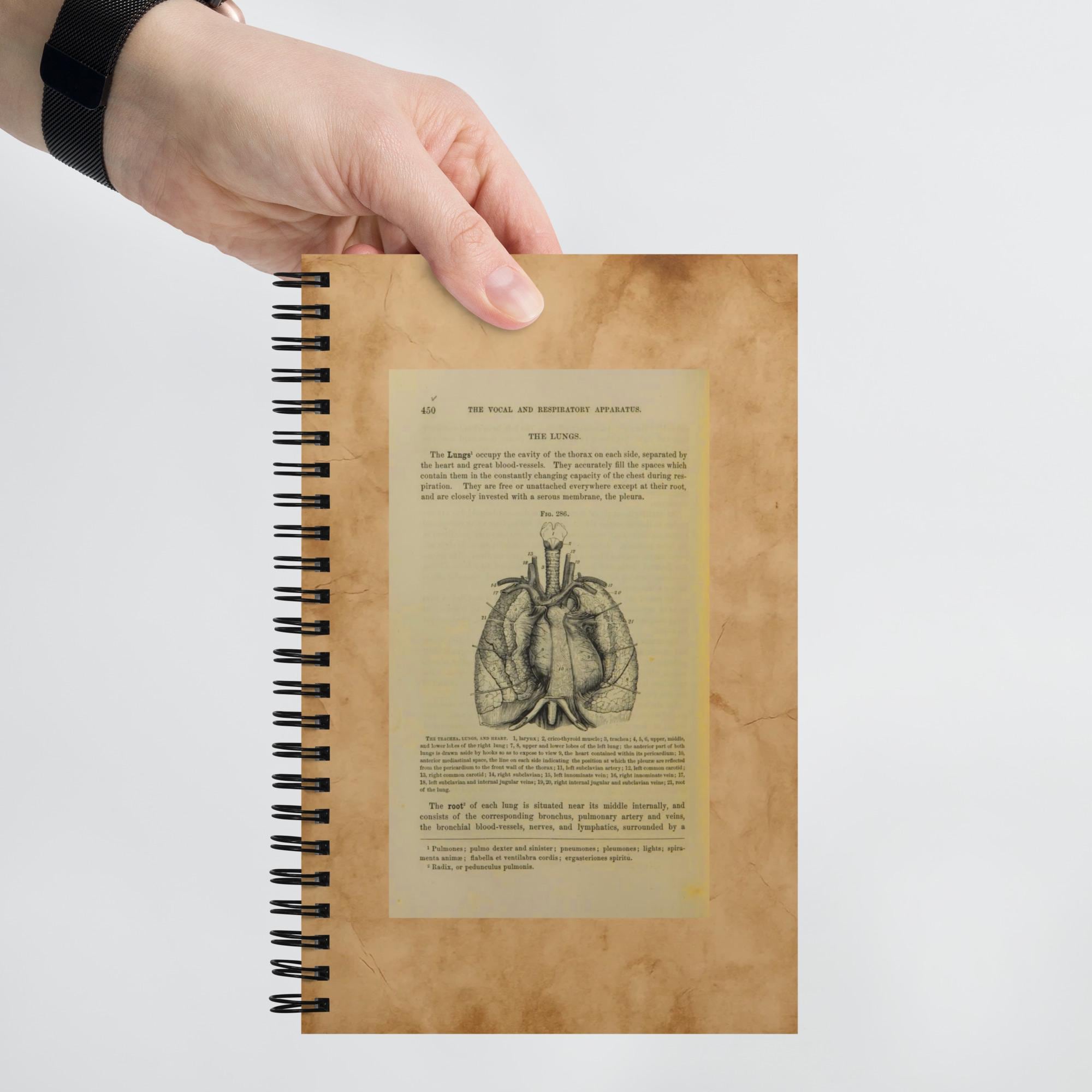 Embrace the charm of old libraries and anatomy studies — a 140-page spiral notebook featuring a genuine antique medical book page cover.