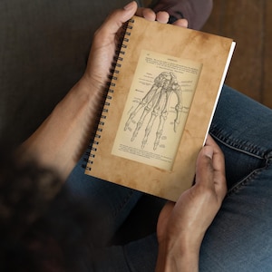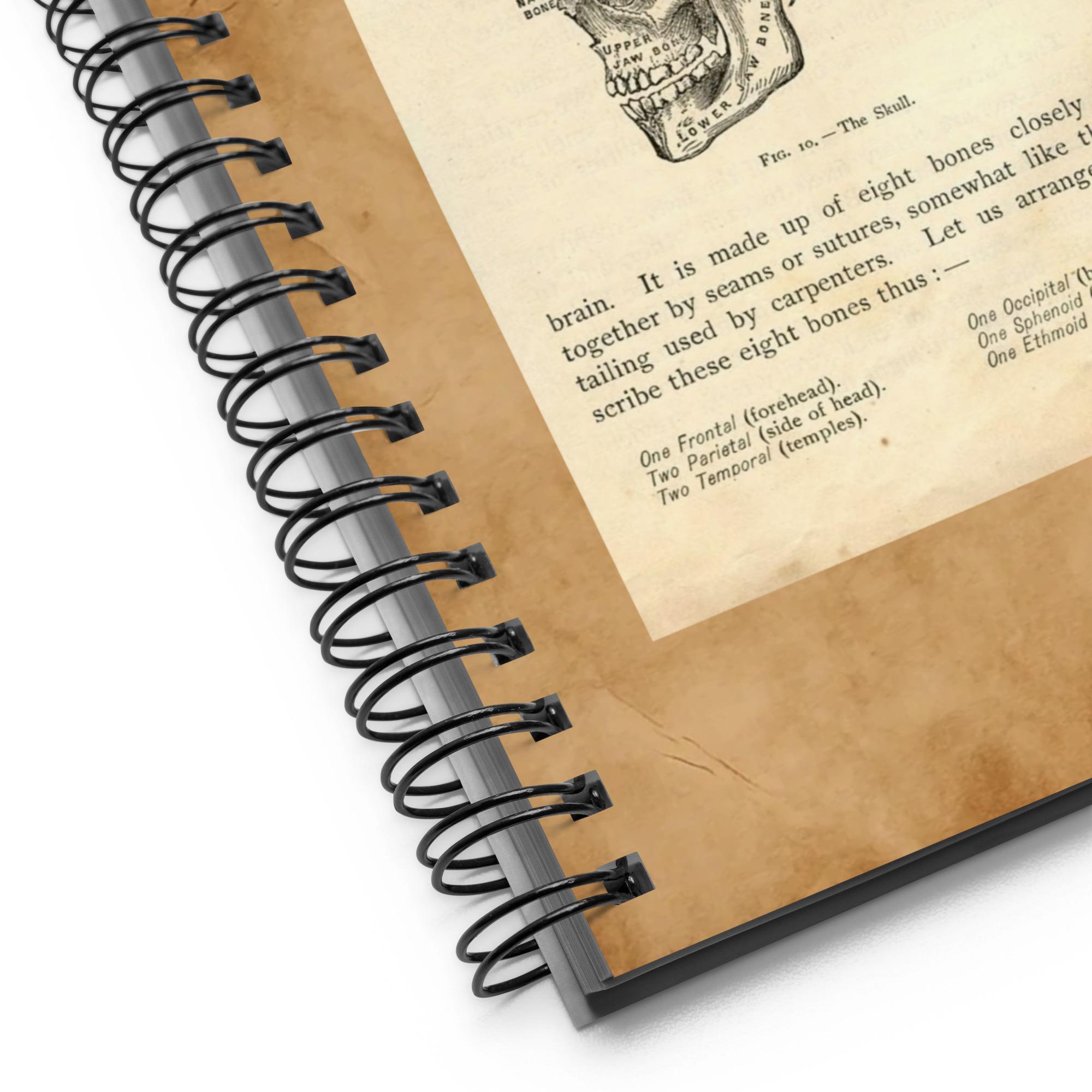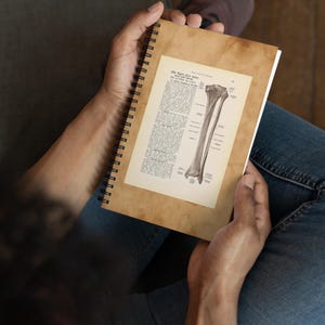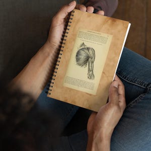 Embrace the charm of old libraries and anatomy studies — a 140-page spiral notebook featuring a genuine antique medical book page cover.