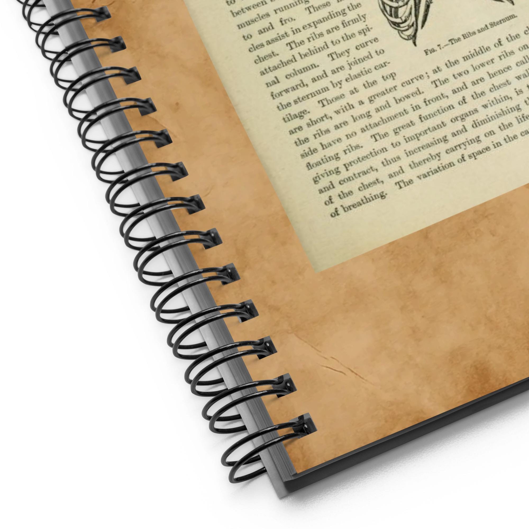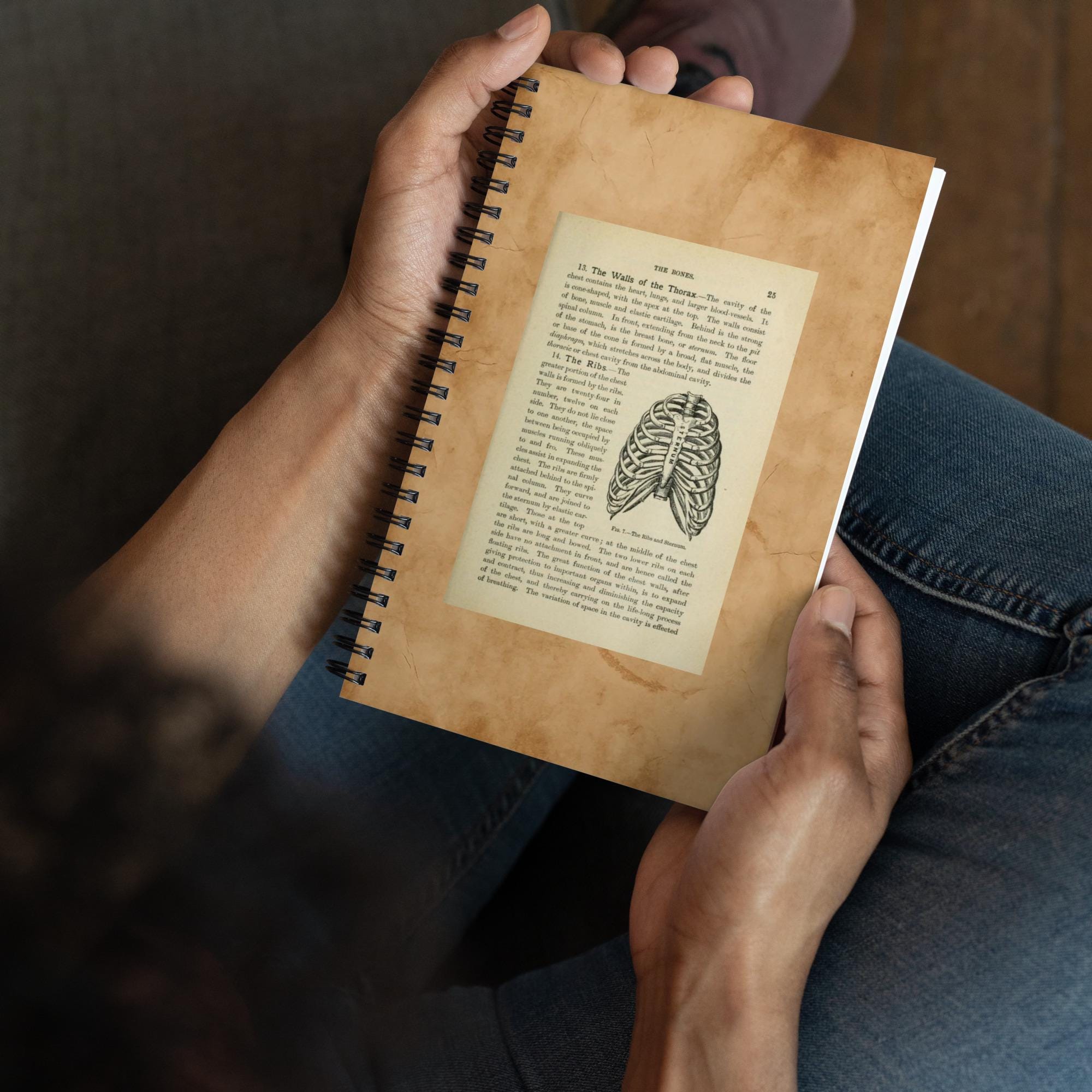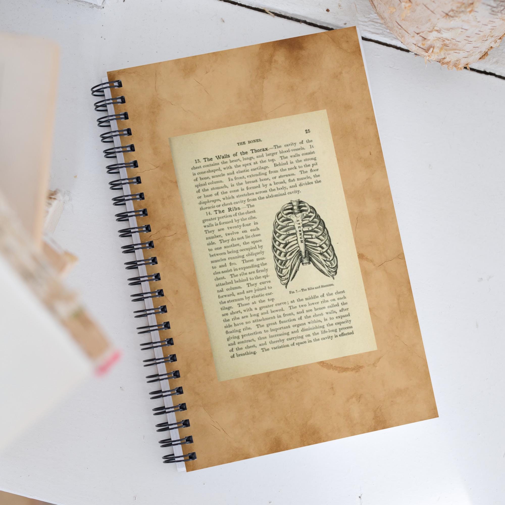 Embrace the charm of old libraries and anatomy studies — a 140-page spiral notebook featuring a genuine antique medical book page cover.