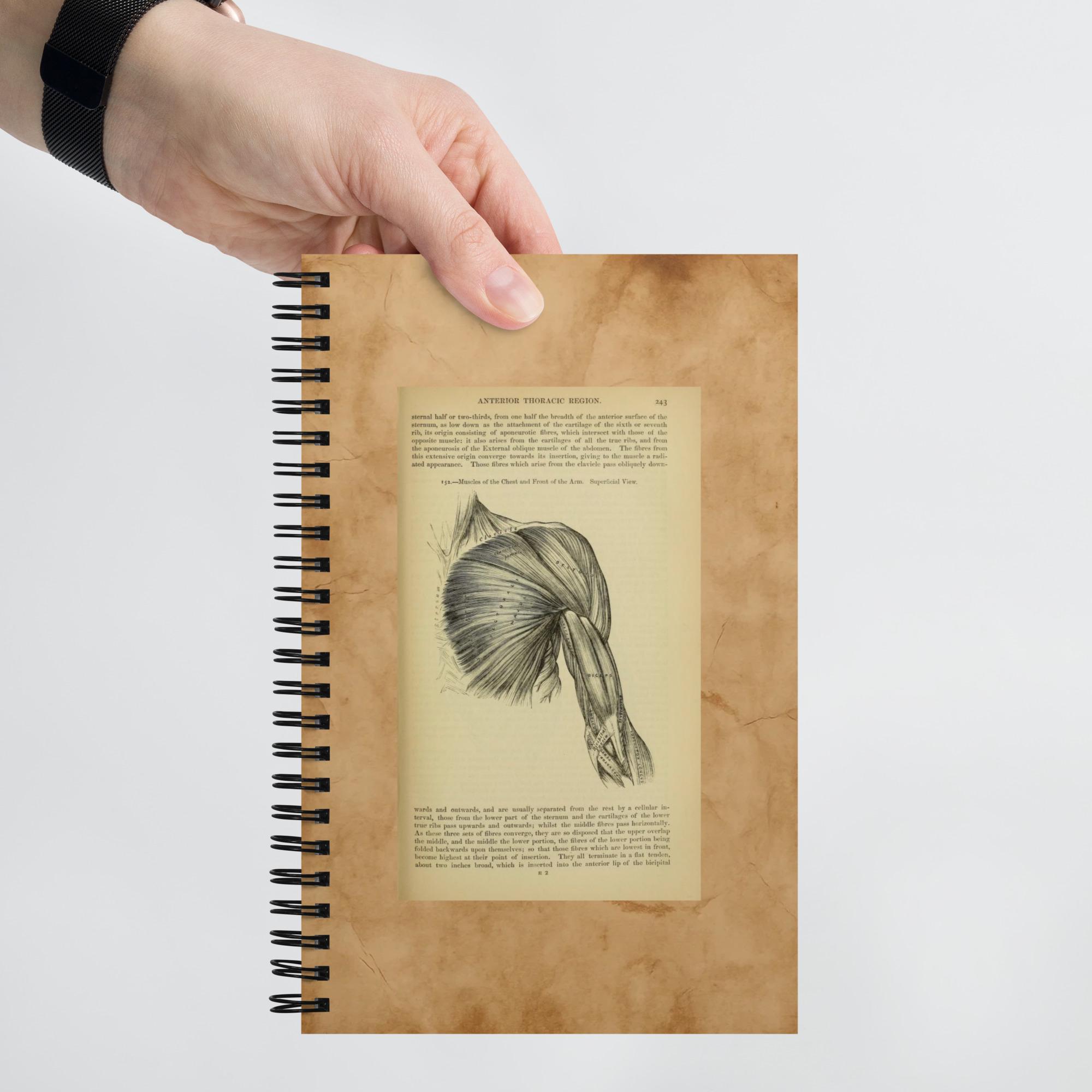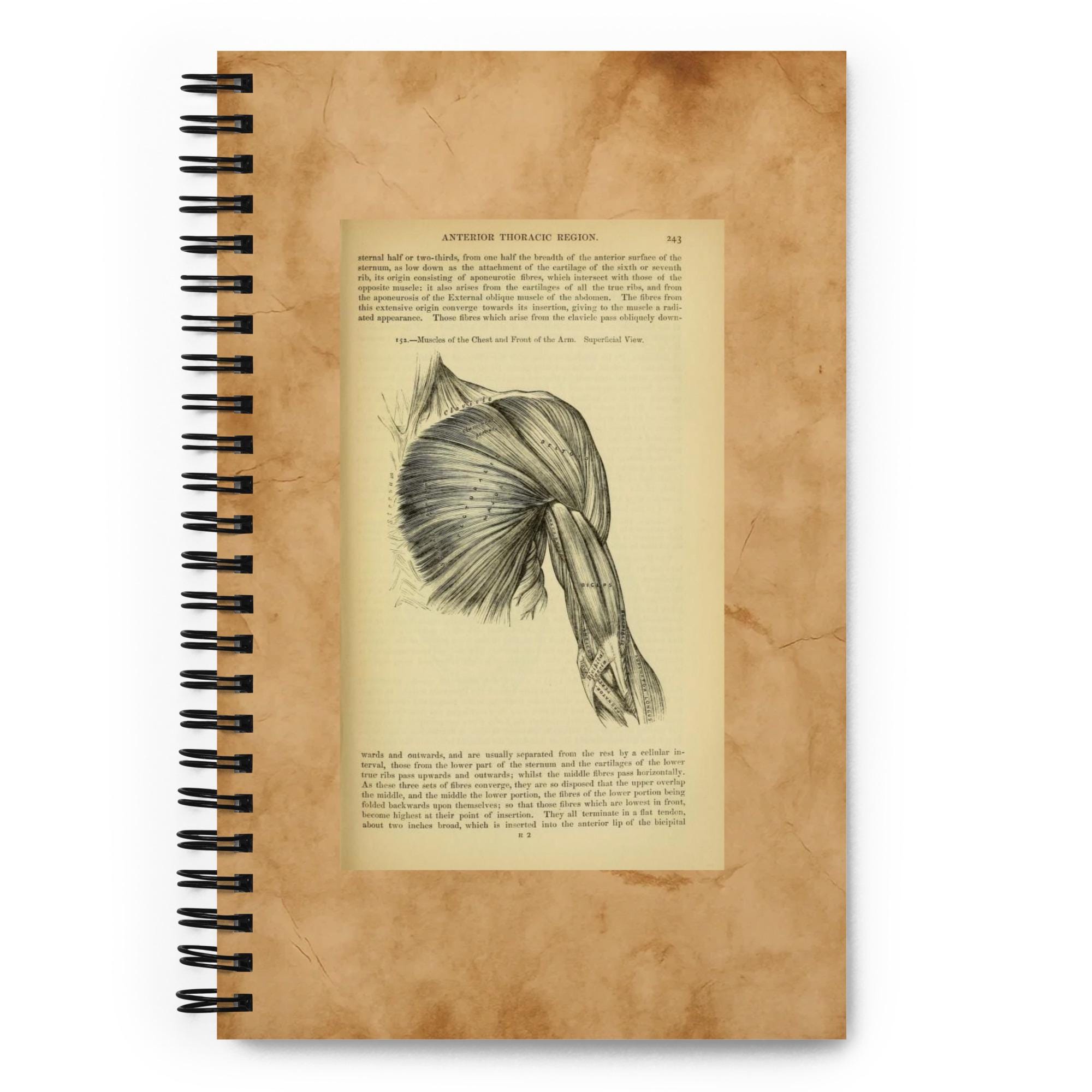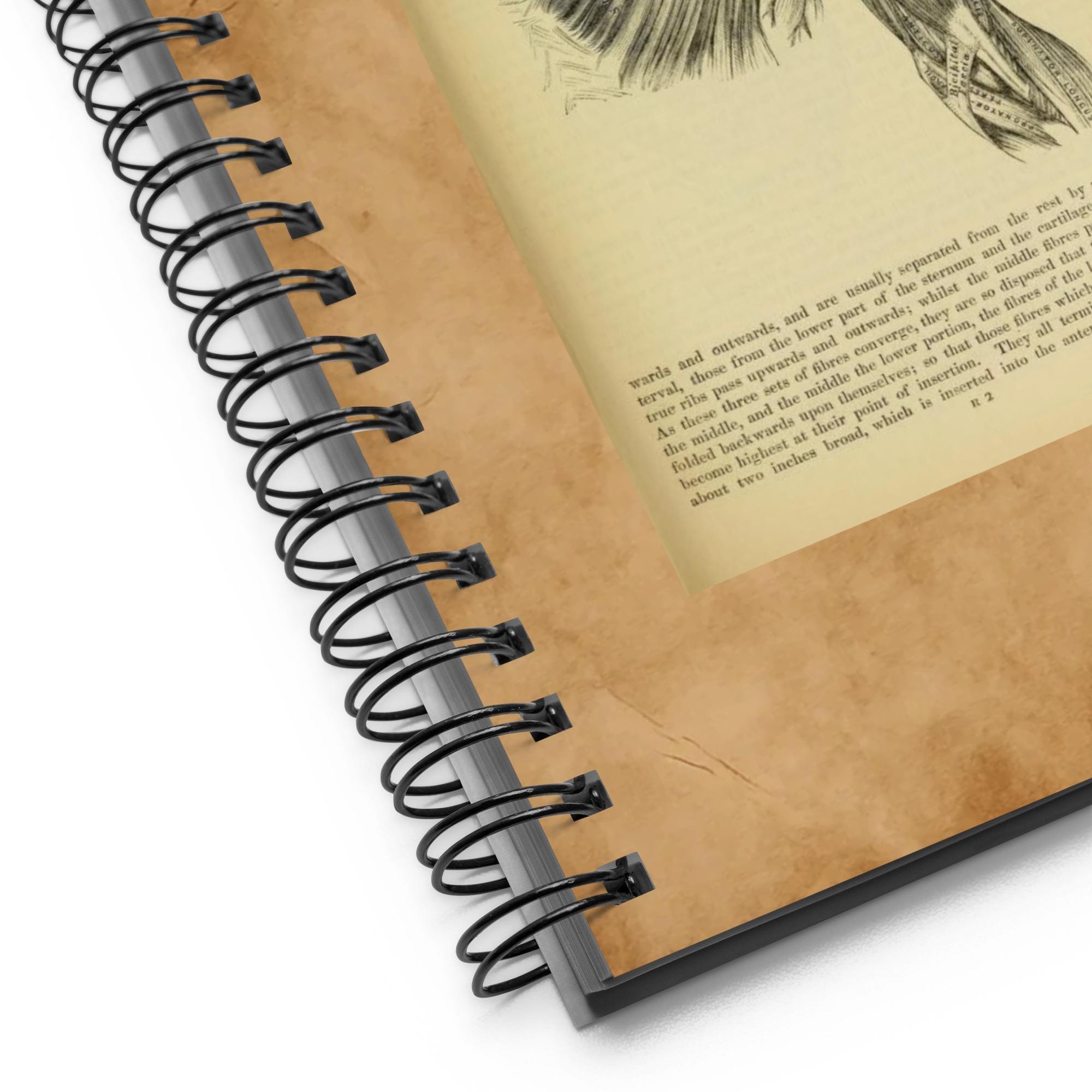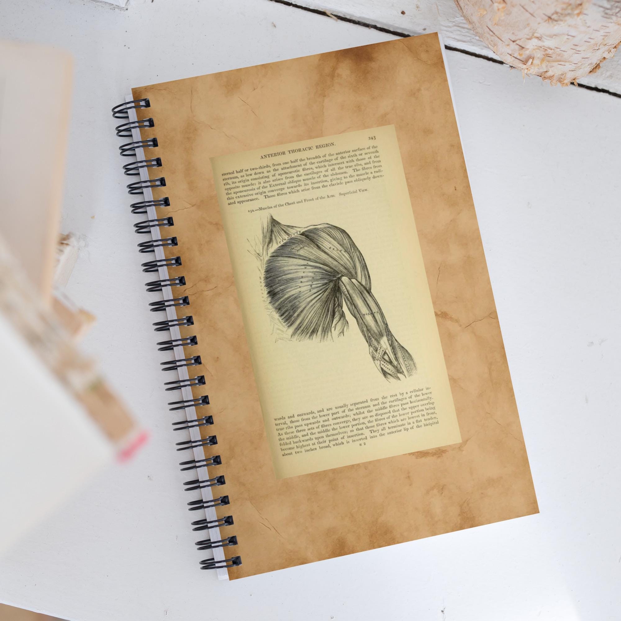 Embrace the charm of old libraries and anatomy studies — a 140-page spiral notebook featuring a genuine antique medical book page cover.
