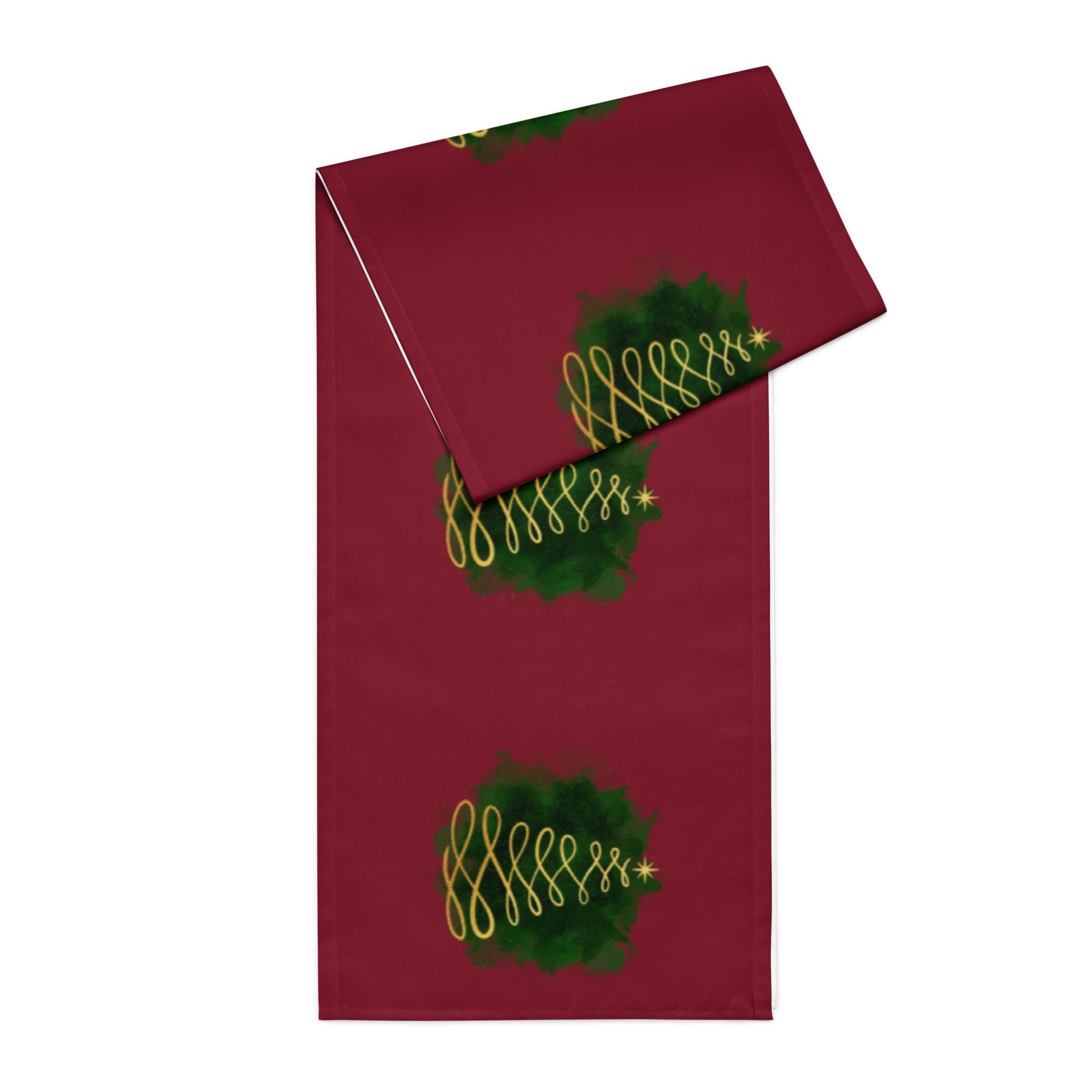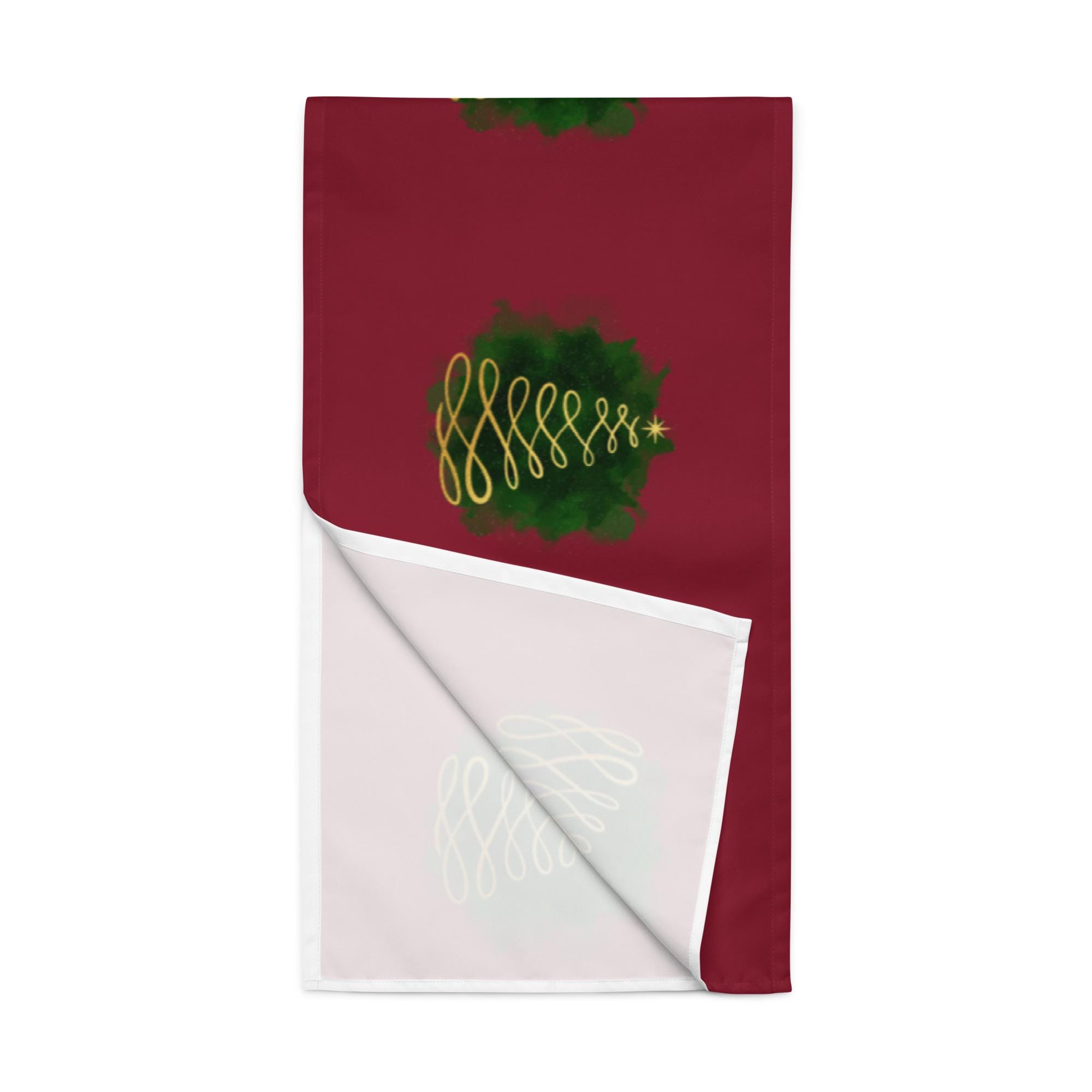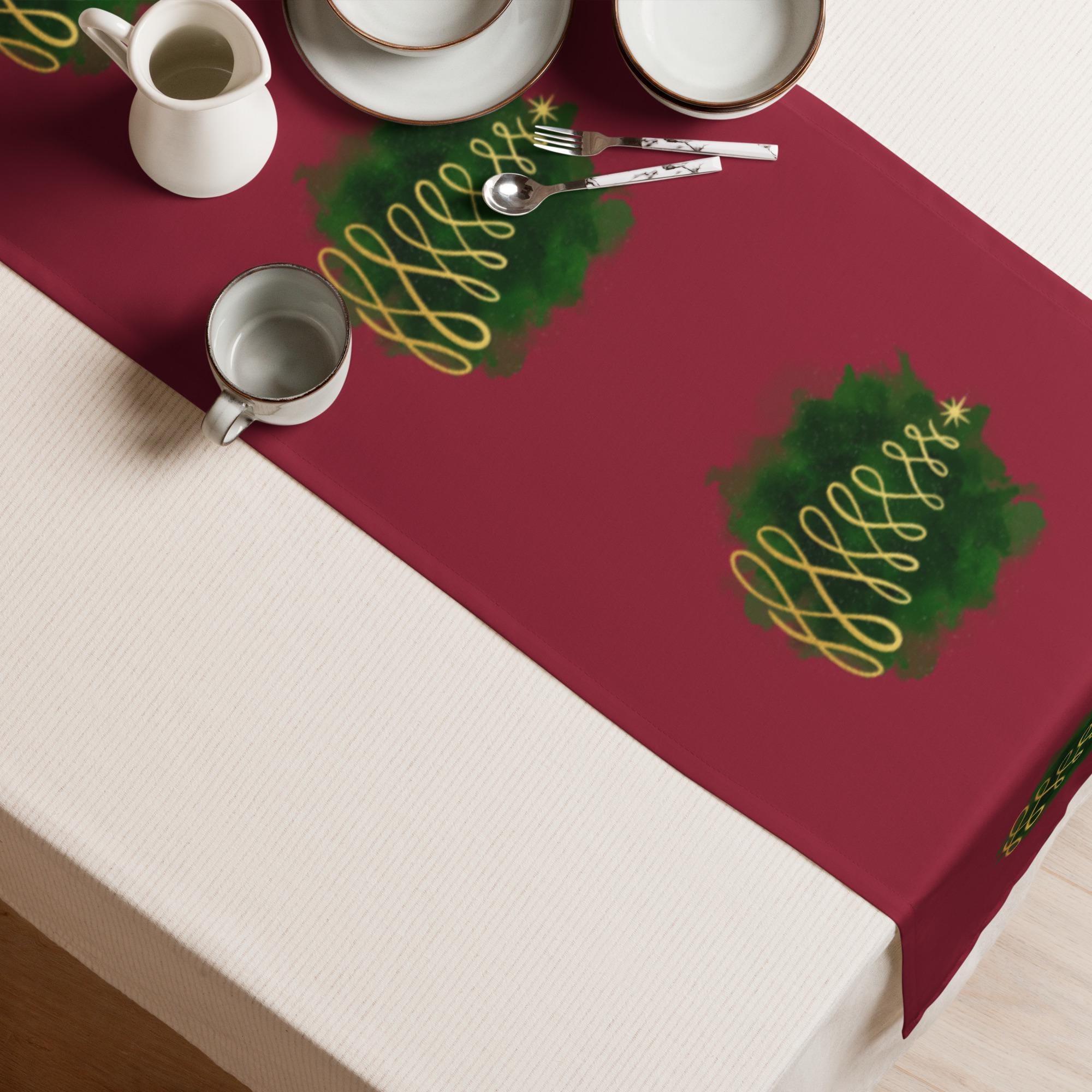 🌲 Design: Minimalist gold Christmas tree, repeated pattern 🎨 Color: Deep dark red front, off-white reverse 📏 Size: 90" L x 16" W 🧵 Material: 100% soft polyester with a linen-feel texture 🔁 Reversible: Dark red with design on front, off-white on back 🧼 Care: Machine wash cold, gentle cycle; tumble dry low or hang dry 🎁 Perfect for: Christmas dinners, holiday décor, or festive hosting