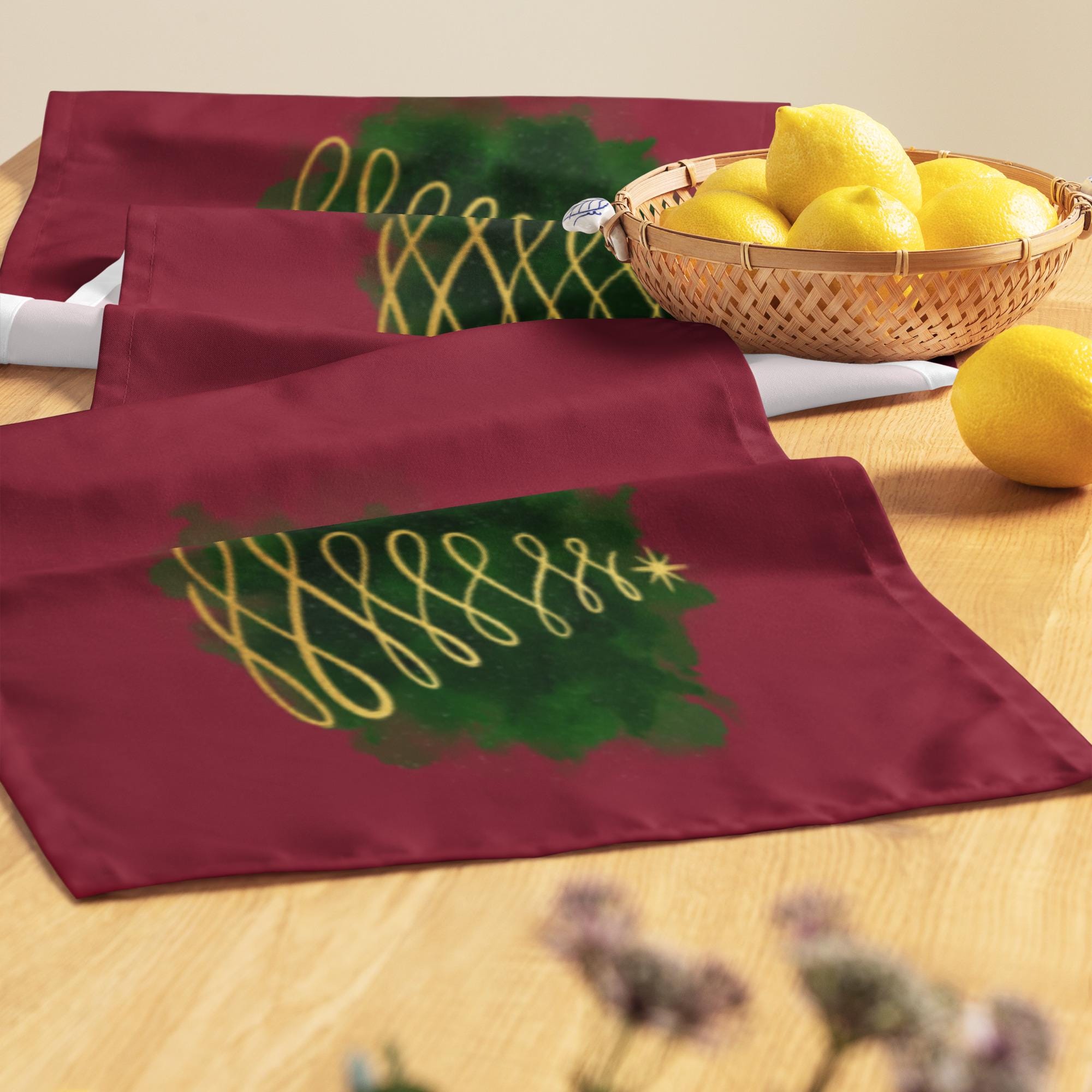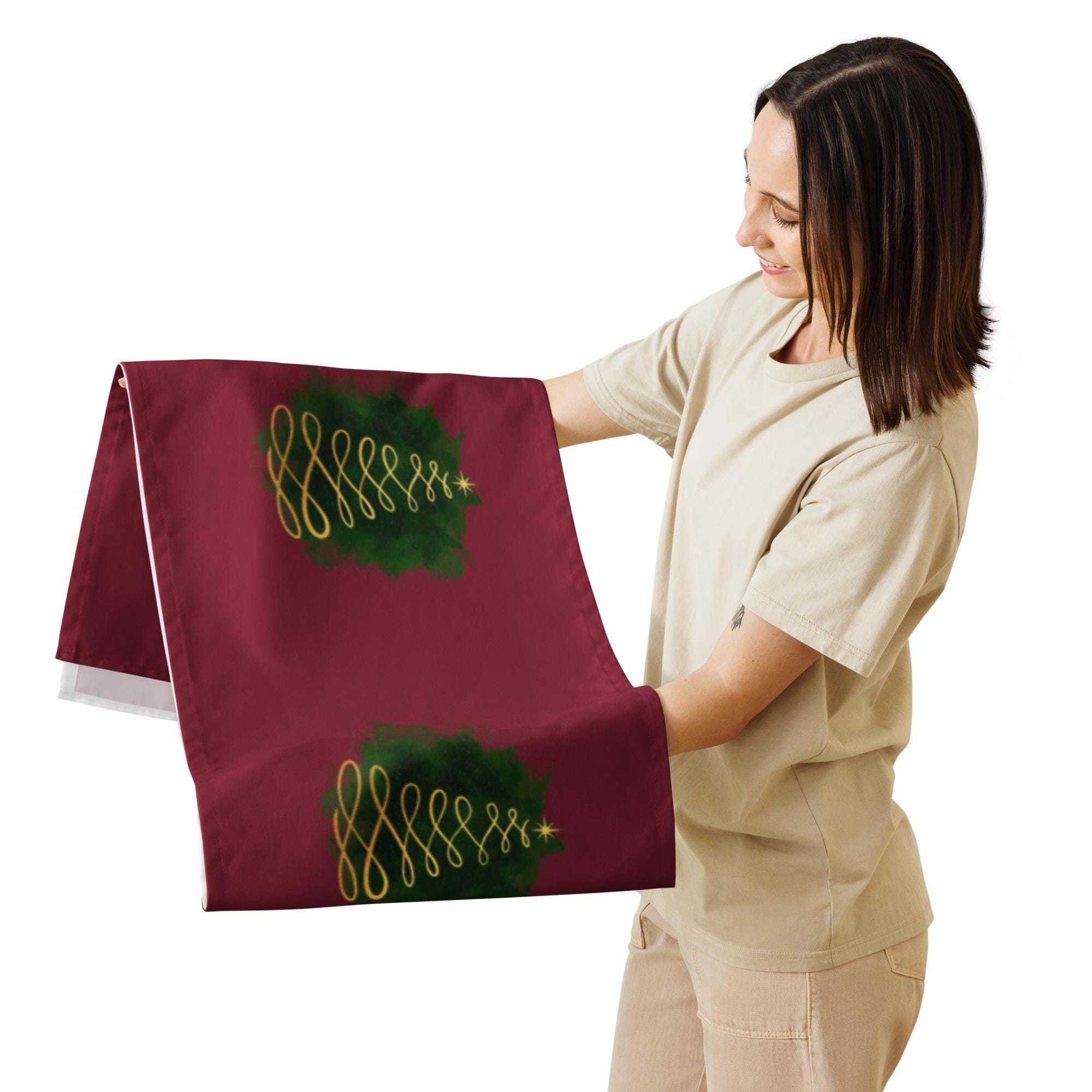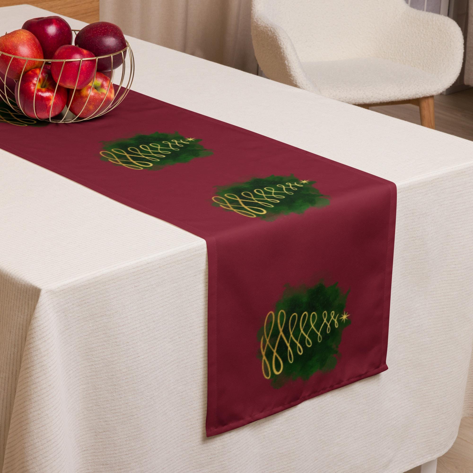 🌲 Design: Minimalist gold Christmas tree, repeated pattern 🎨 Color: Deep dark red front, off-white reverse 📏 Size: 90" L x 16" W 🧵 Material: 100% soft polyester with a linen-feel texture 🔁 Reversible: Dark red with design on front, off-white on back 🧼 Care: Machine wash cold, gentle cycle; tumble dry low or hang dry 🎁 Perfect for: Christmas dinners, holiday décor, or festive hosting