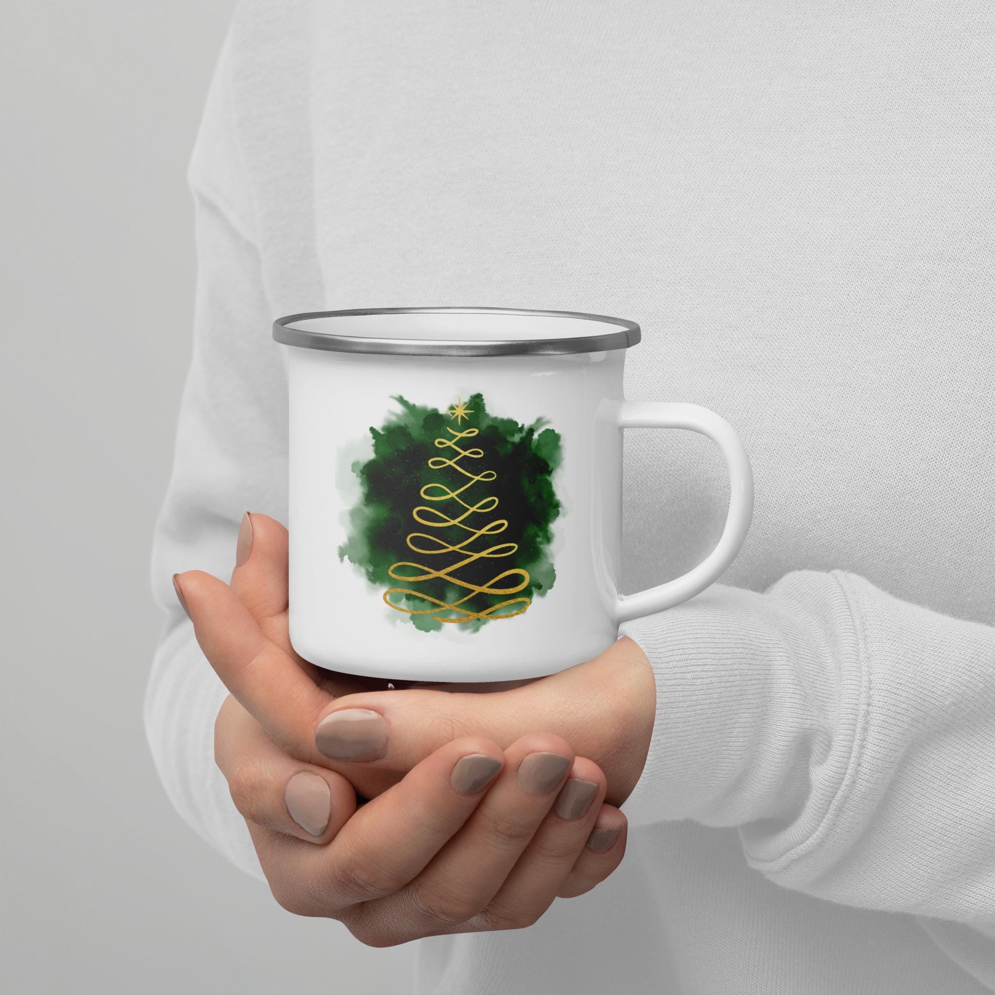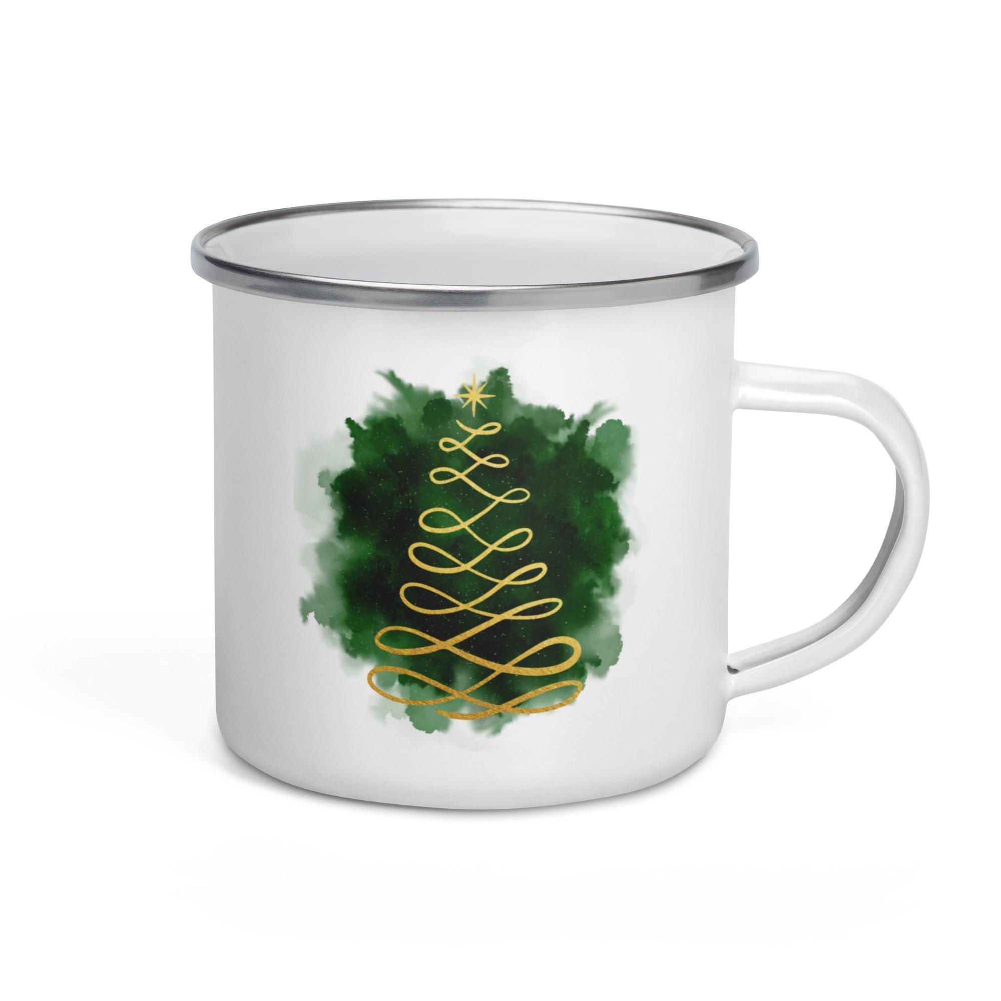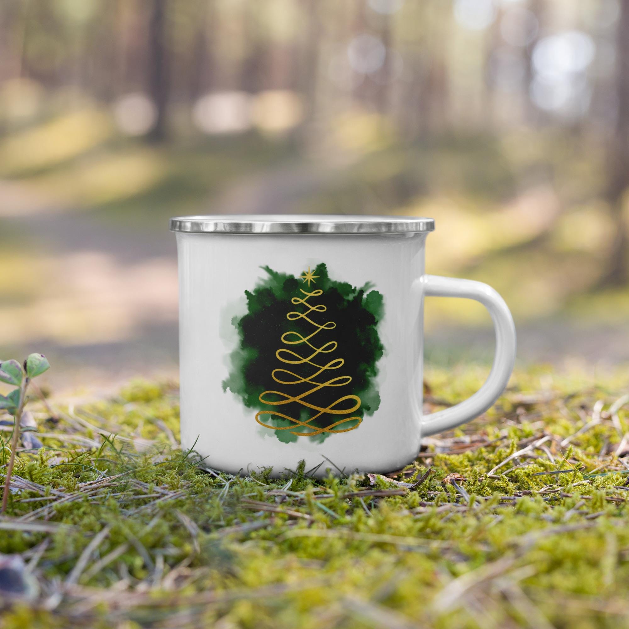 🎄 Design: Gold Christmas tree with dark green watercolor background 🏕️ Material: Enamel-coated steel (lightweight & durable) 📏 Capacity: 12 oz (approx.) 💧 Care: Hand wash only; not microwave safe ✨ Perfect for: Holiday camping trips, winter decor, and seasonal gifts