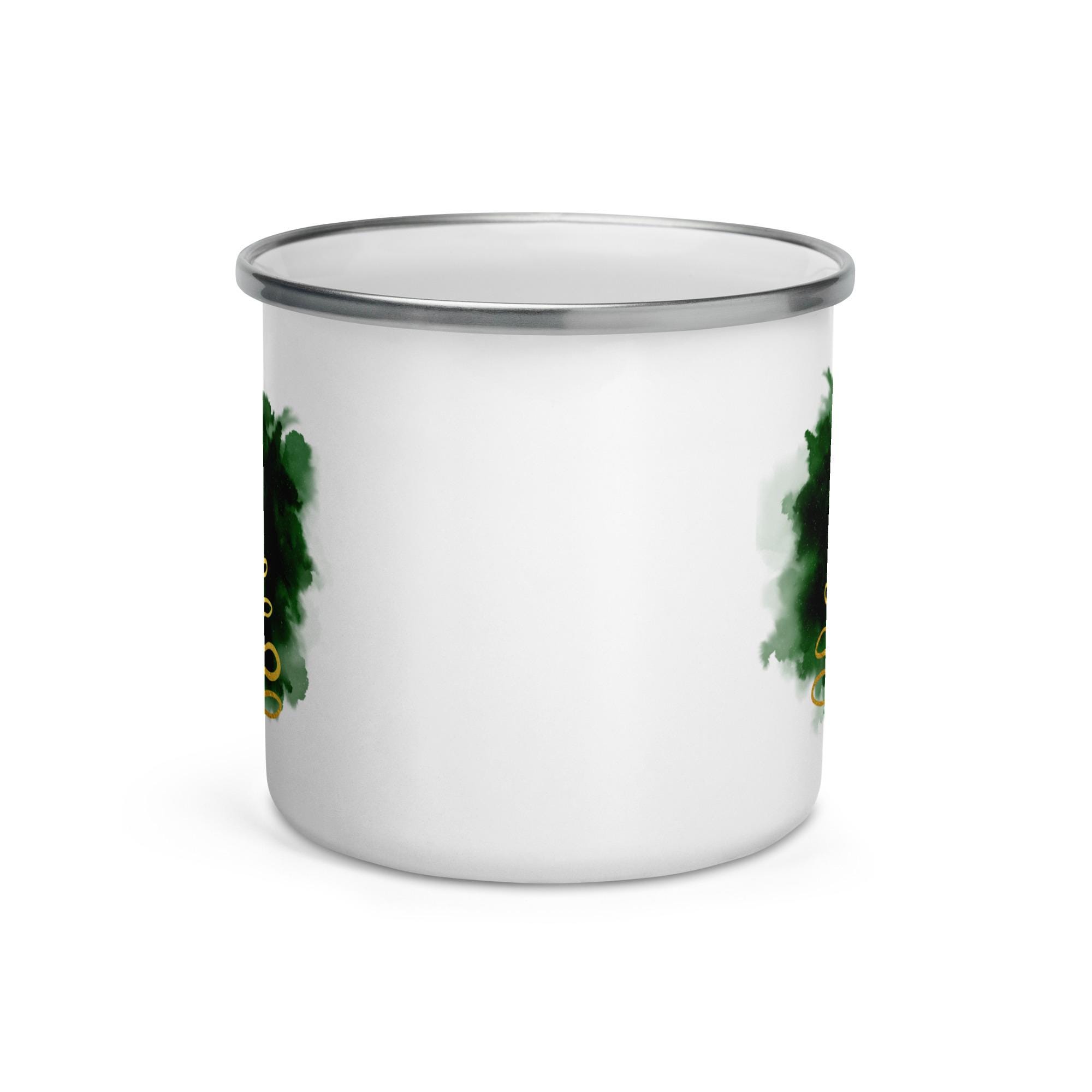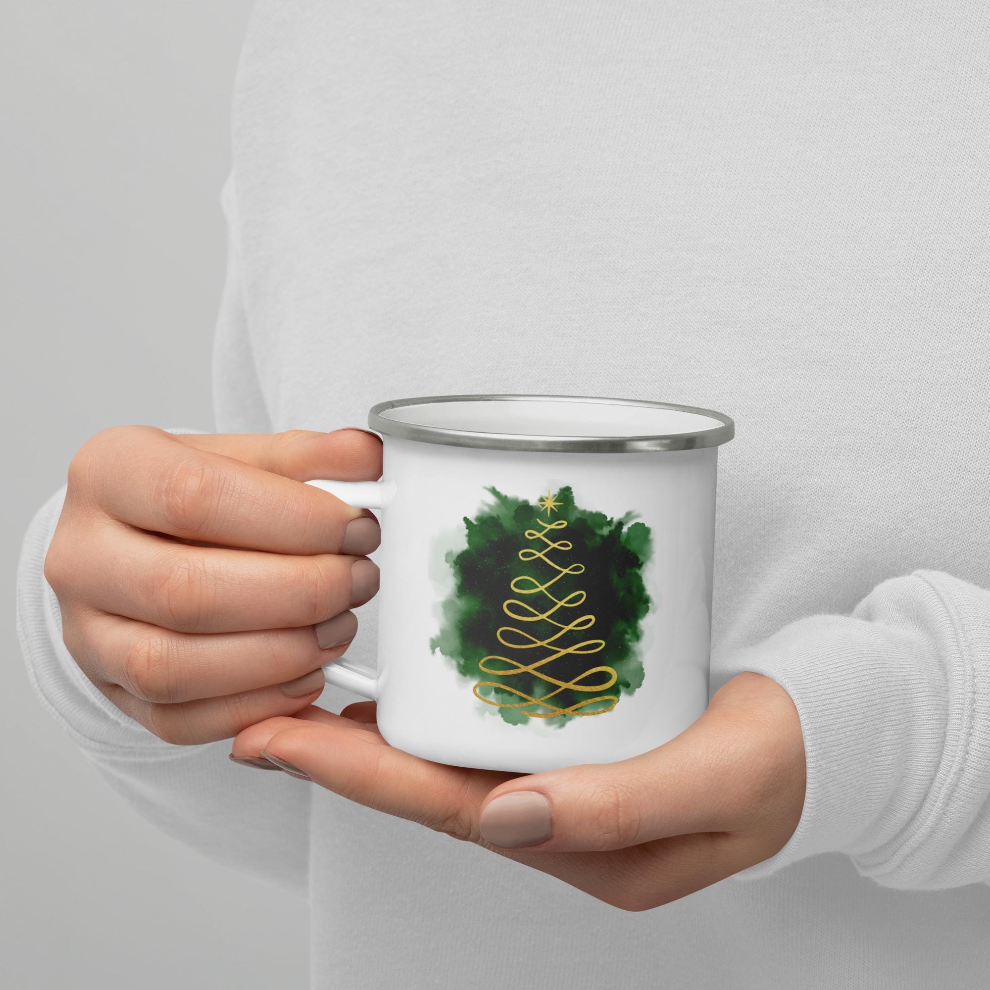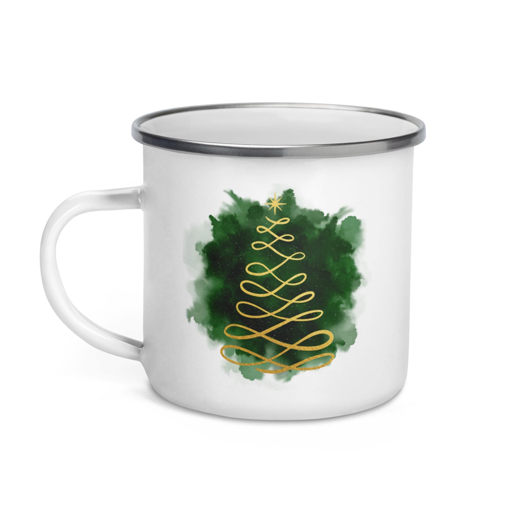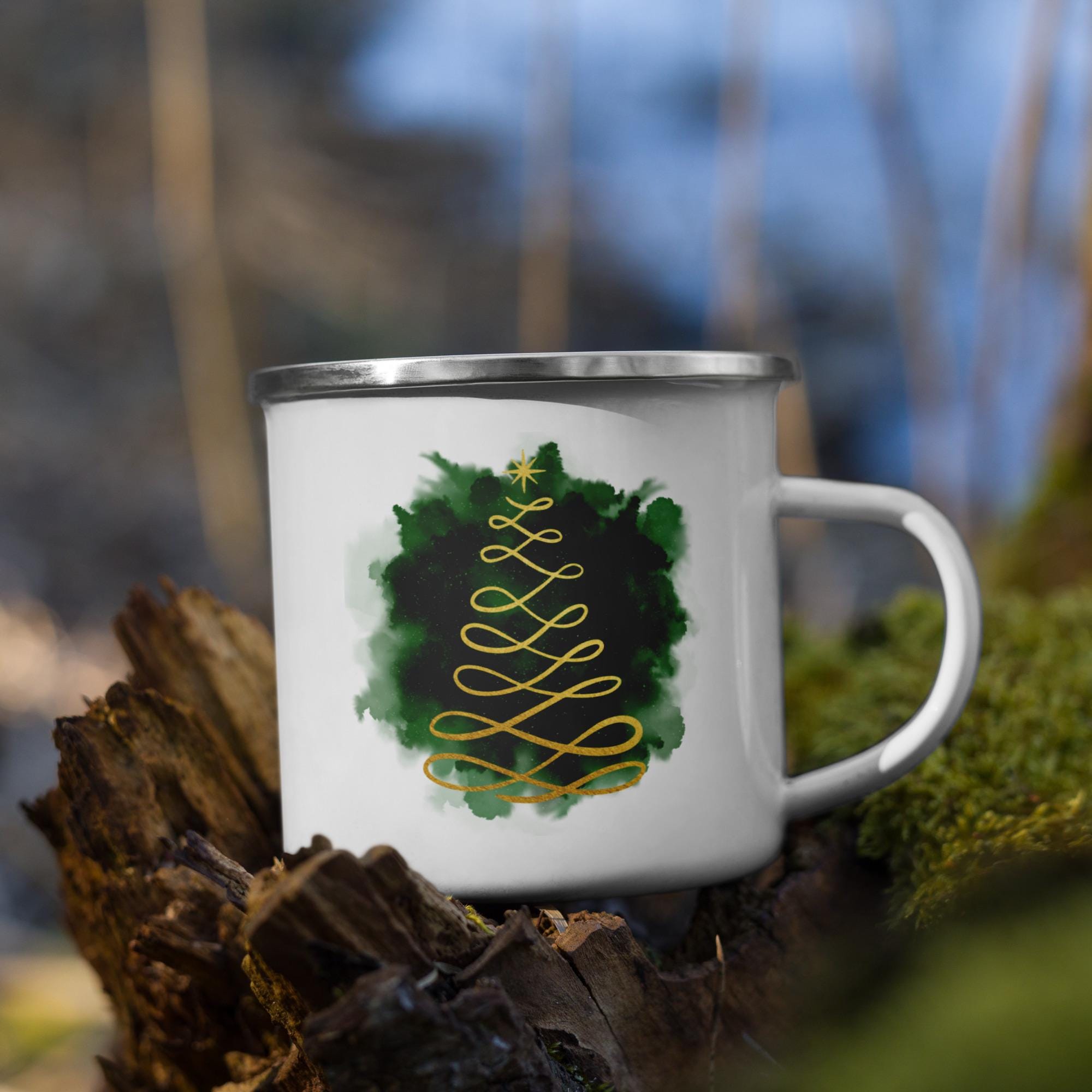 🎄 Design: Gold Christmas tree with dark green watercolor background 🏕️ Material: Enamel-coated steel (lightweight & durable) 📏 Capacity: 12 oz (approx.) 💧 Care: Hand wash only; not microwave safe ✨ Perfect for: Holiday camping trips, winter decor, and seasonal gifts