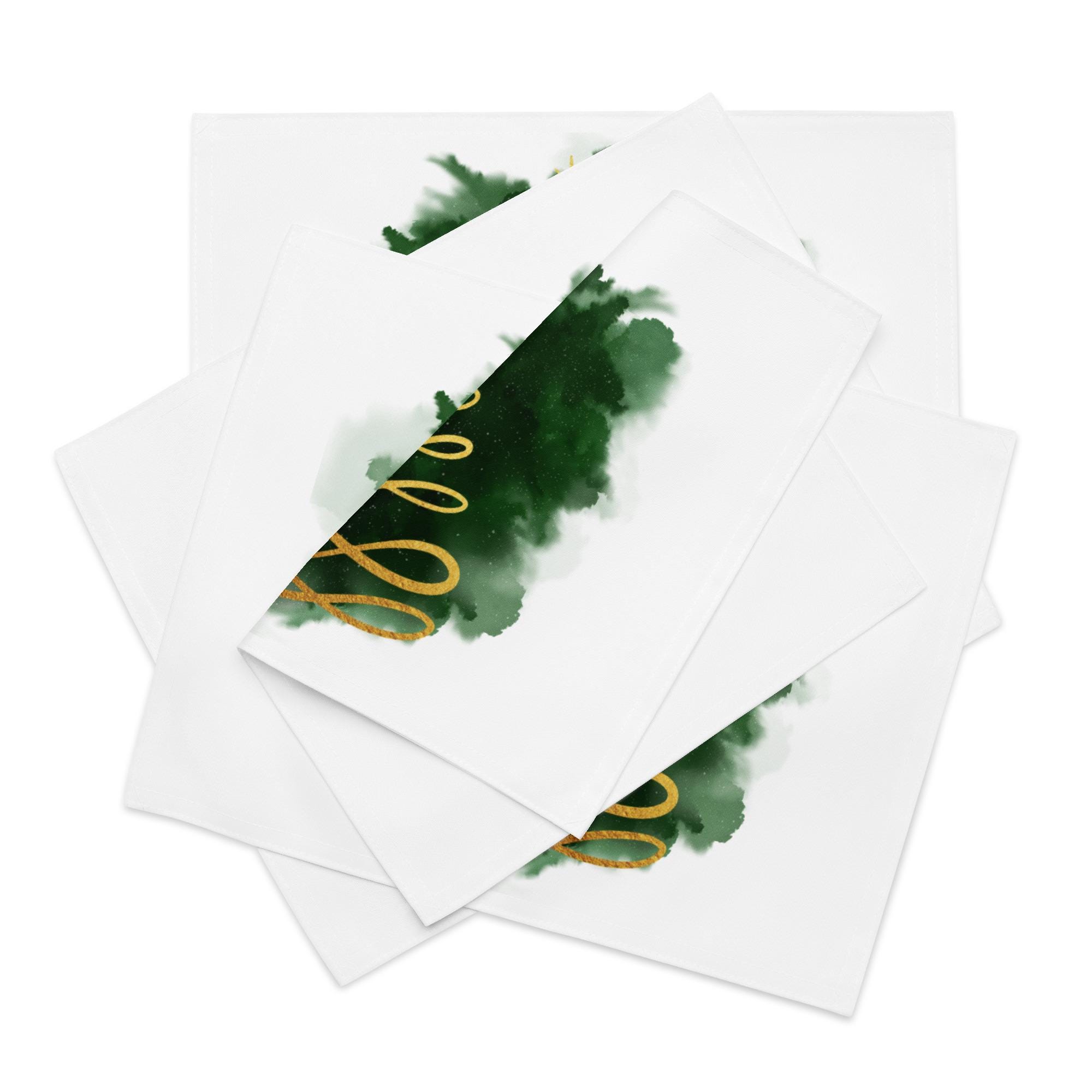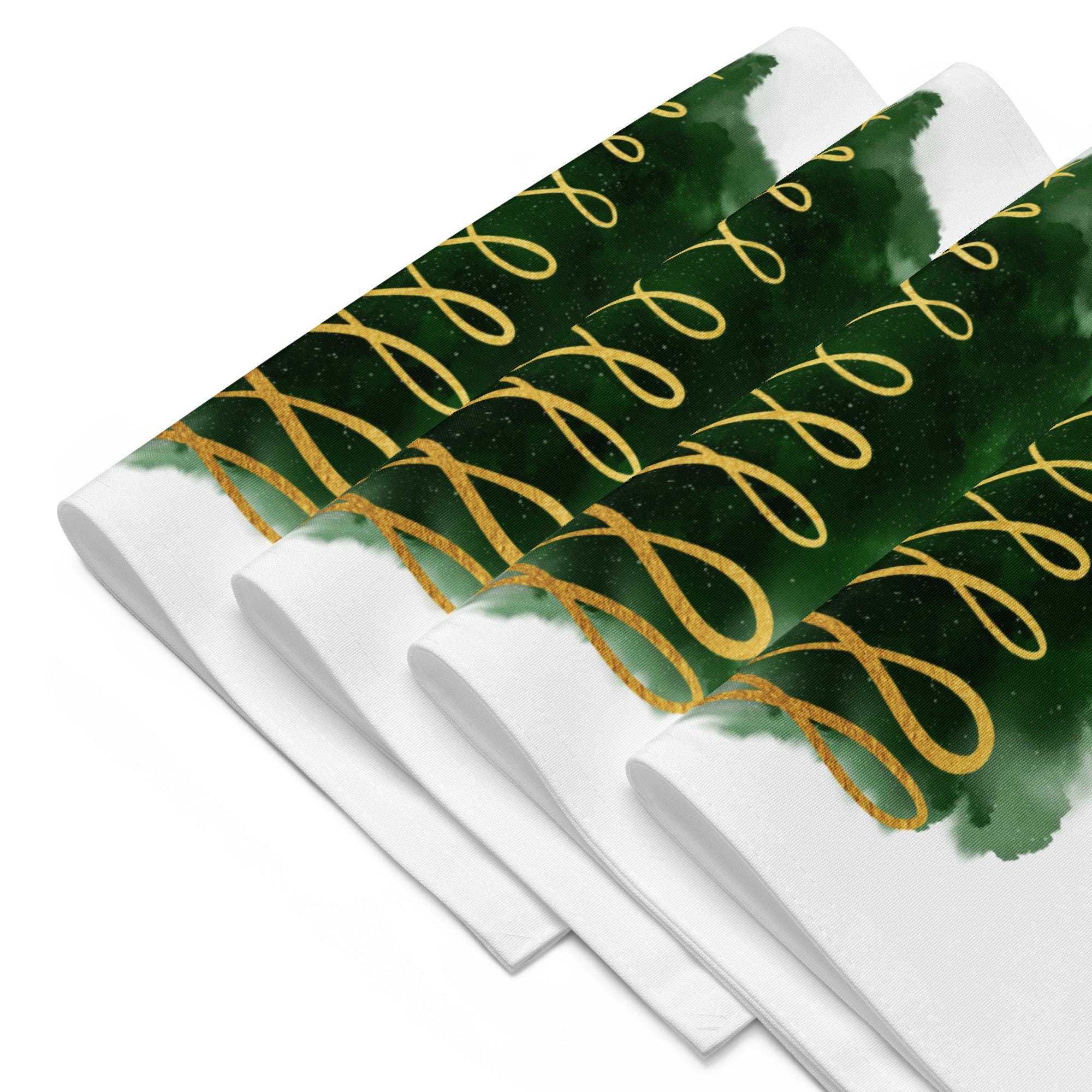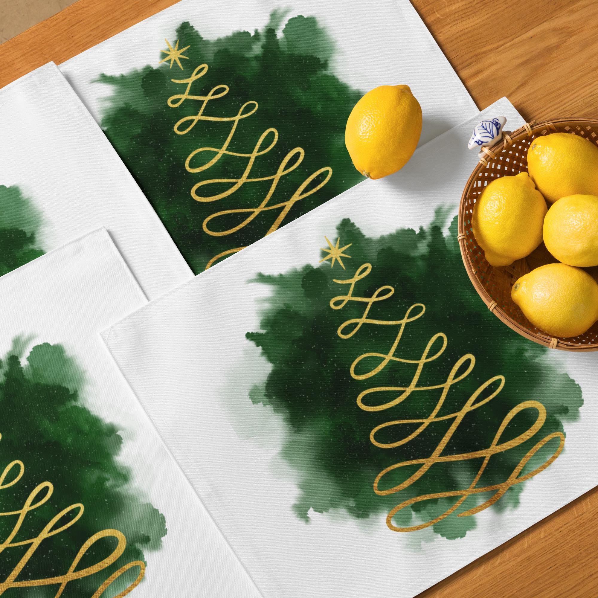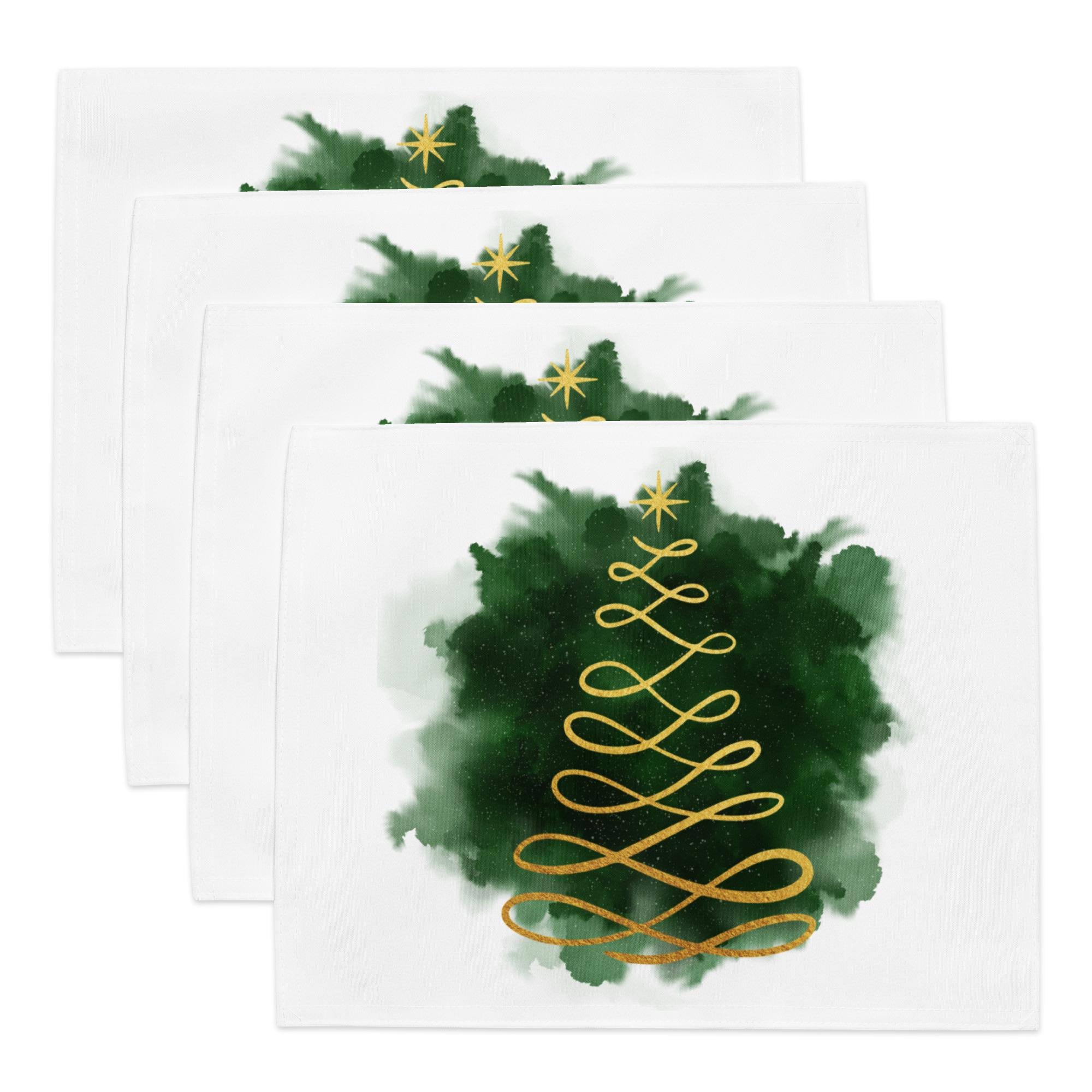 Set a festive yet elegant table this holiday season with this set of four minimalist gold Christmas tree placemats. Each placemat features the same gold tree design on a crisp white background, accented by a subtle modern touch that complements any Christmas tablescape. Crafted from 100% polyester fabric, these placemats are sewn two-ply for a high-quality finish and water resistant for easy cleanup. Perfect for both everyday winter dining and special holiday gatherings, they combine timeless design with practical durability.