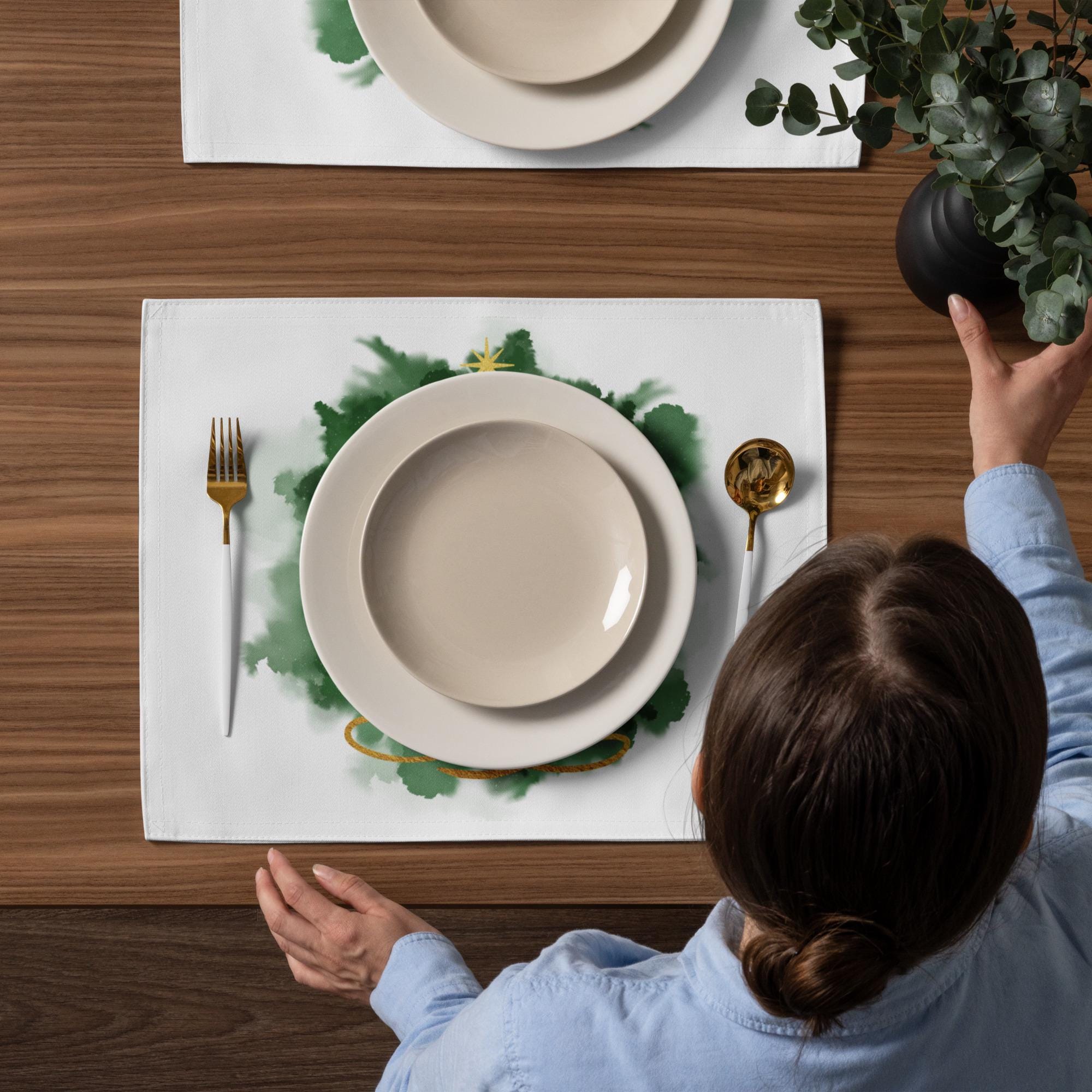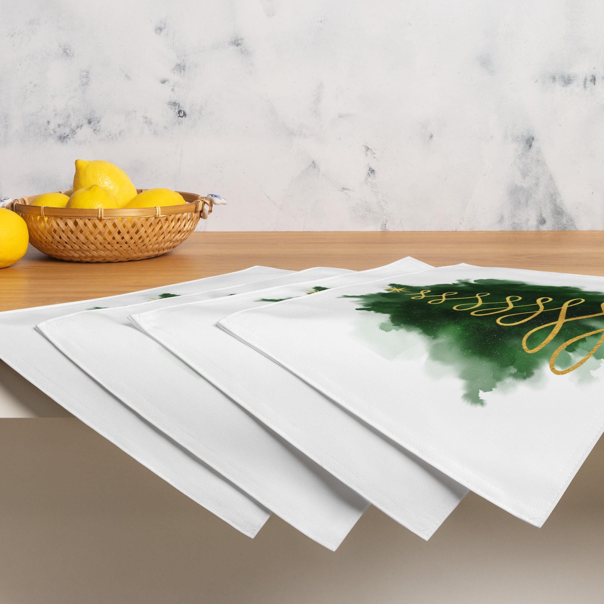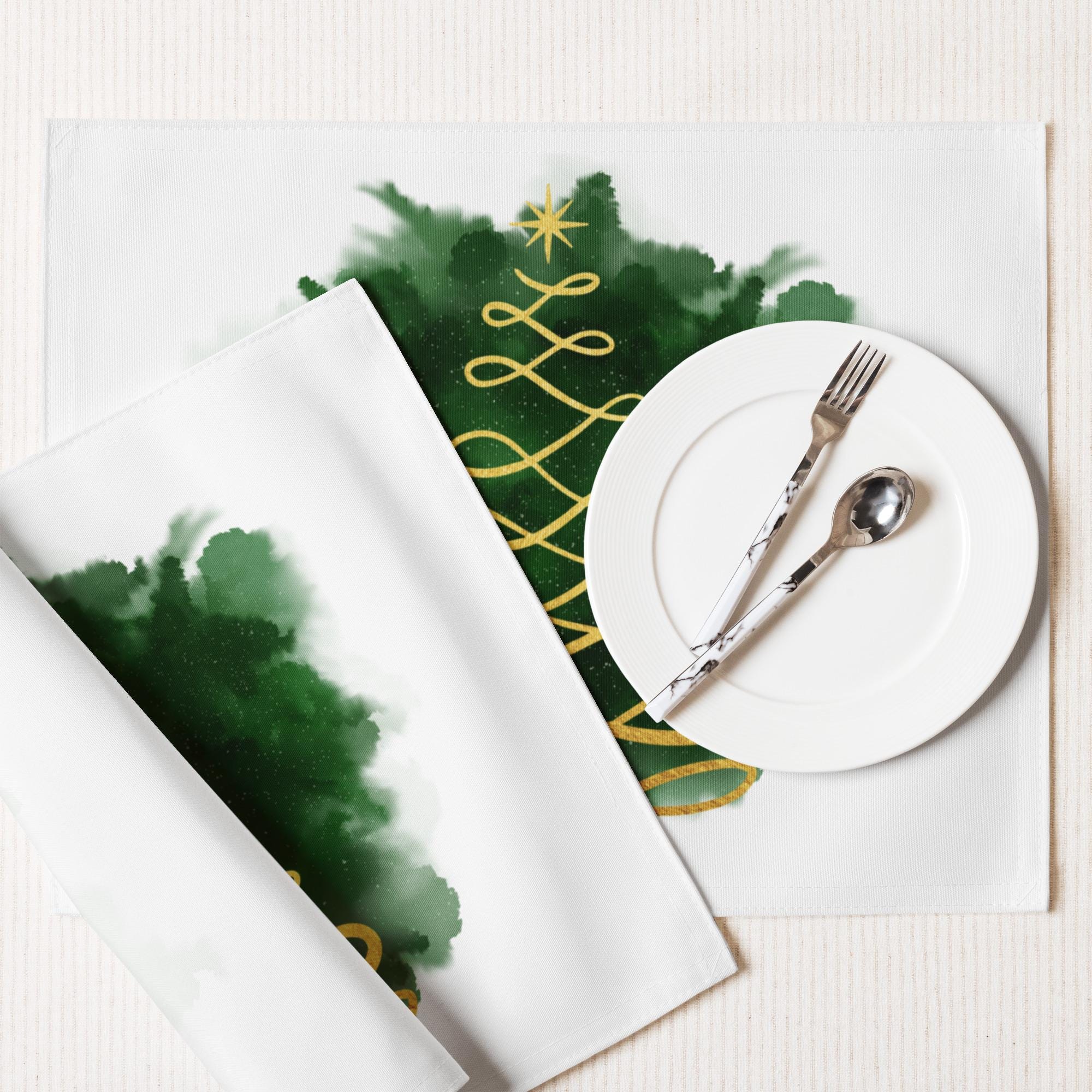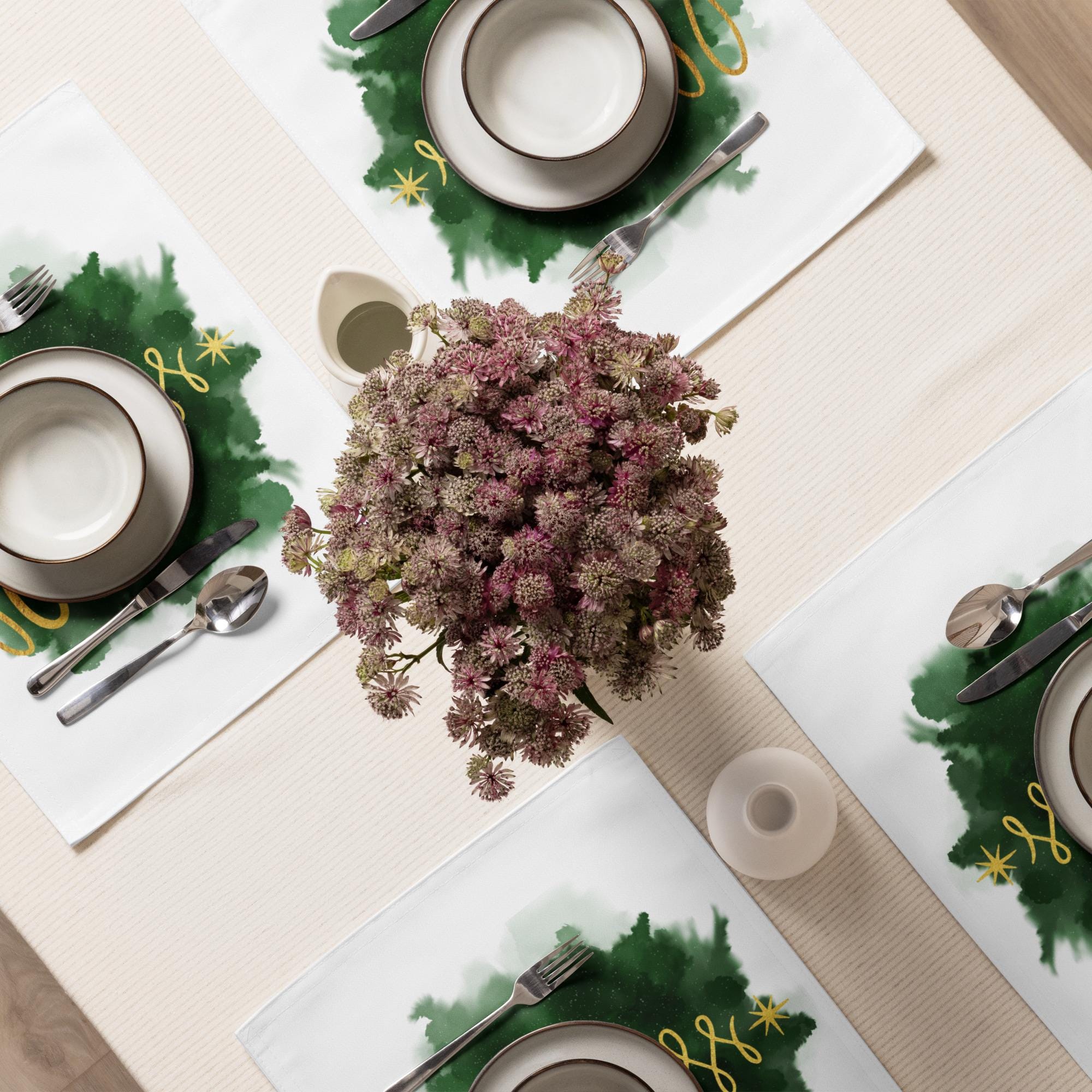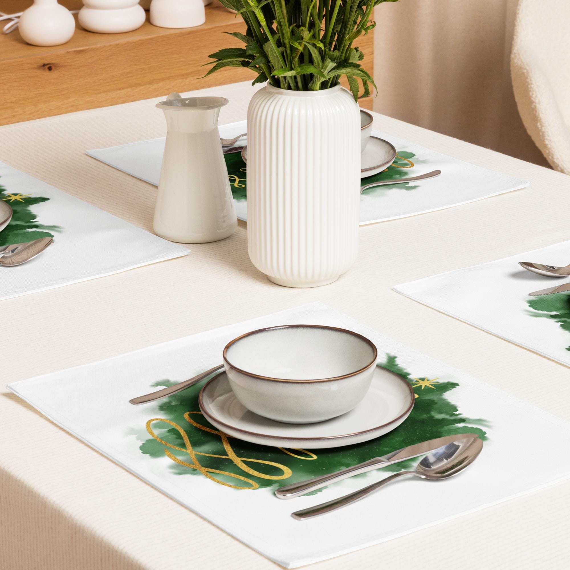 🌲 Set of 4 matching placemats 📏 Size: 18" x 14" each 💧 Material: 100% polyester, water resistant 🧵 Construction: Sewn two-ply for a refined, durable finish ⚪ Color: White background with minimalist gold Christmas tree design 🧼 Care: Spot clean or wipe with a damp cloth; air dry 🎁 Perfect for: Christmas dinners, winter gatherings, or cozy holiday décor