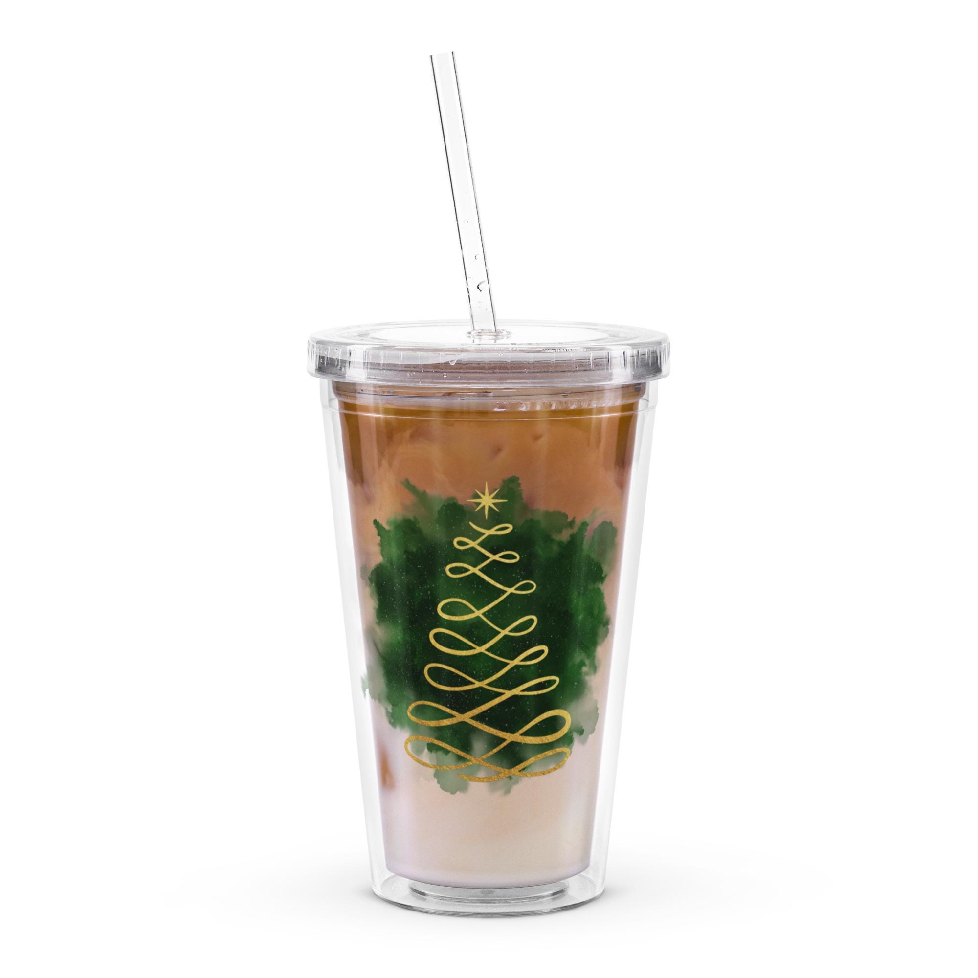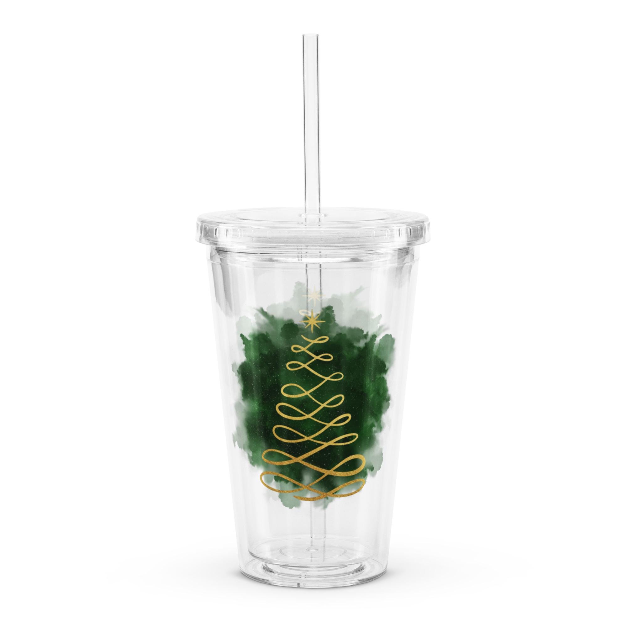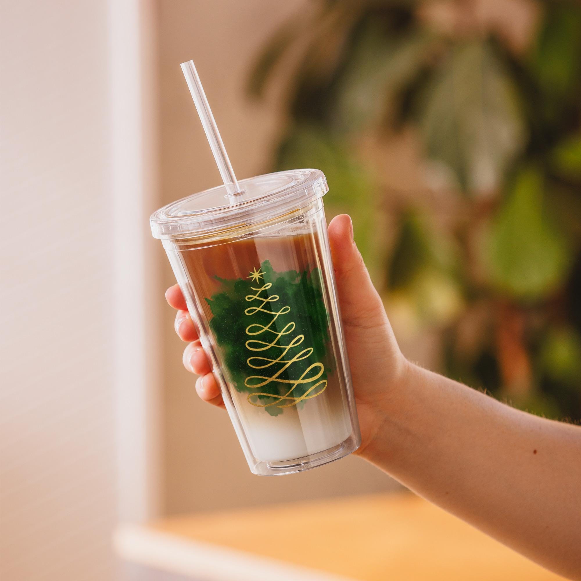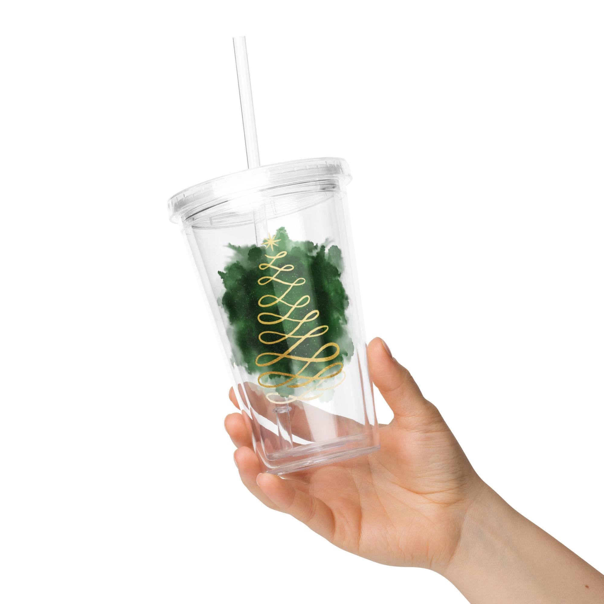 Sip in seasonal style with this 16-ounce clear double-wall tumbler, featuring a minimalist gold Christmas tree set against a dark green watercolor background. The festive yet modern design brings subtle holiday elegance to your everyday routine — perfect for iced coffee, sparkling water, or cold holiday cocktails. Made from durable, insulated plastic, this tumbler keeps your drinks cool longer while preventing condensation. It comes with a matching clear lid and reusable straw, making it both practical and gift-worthy.