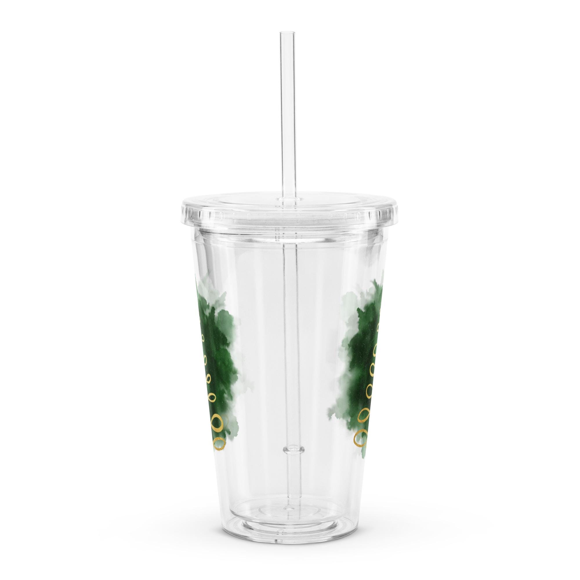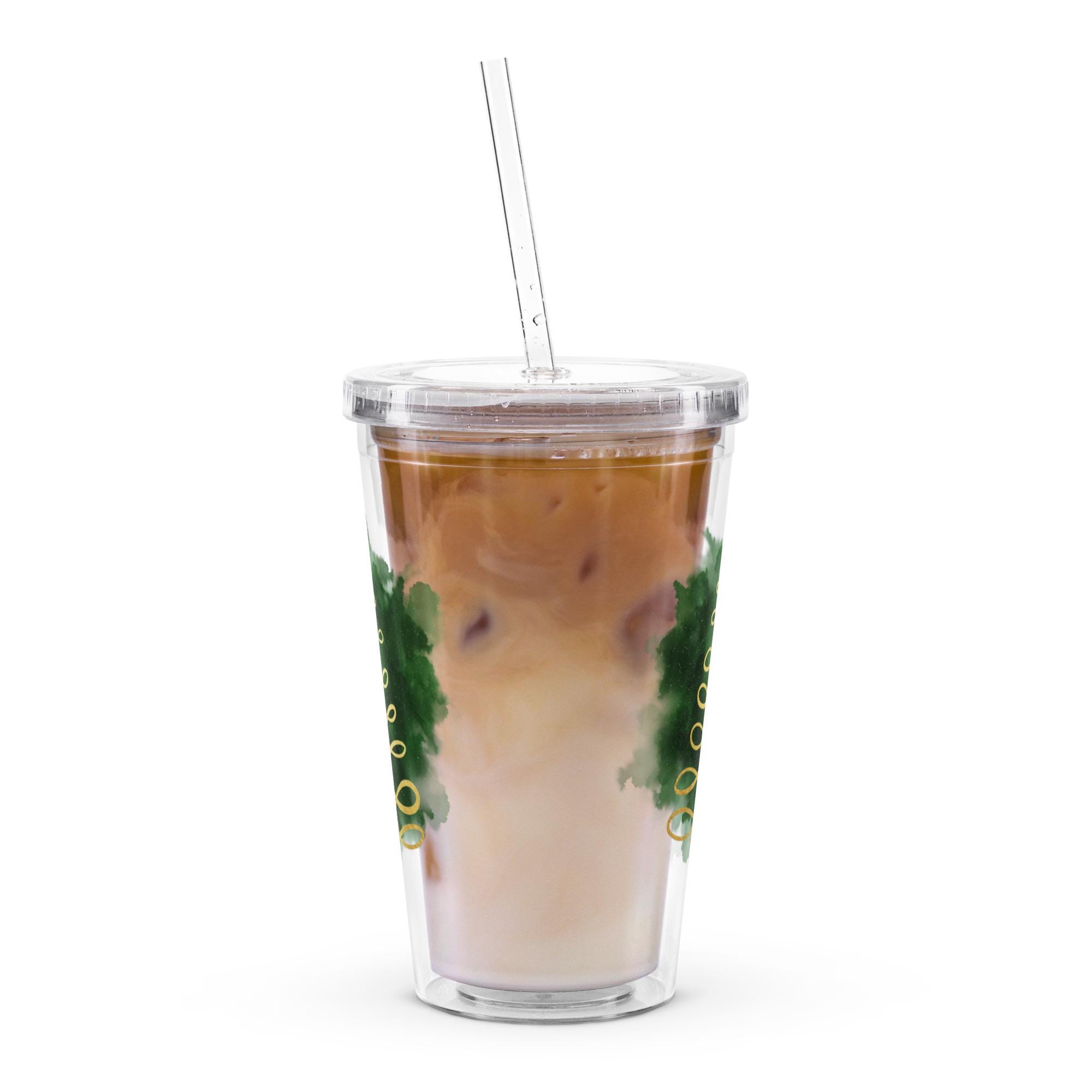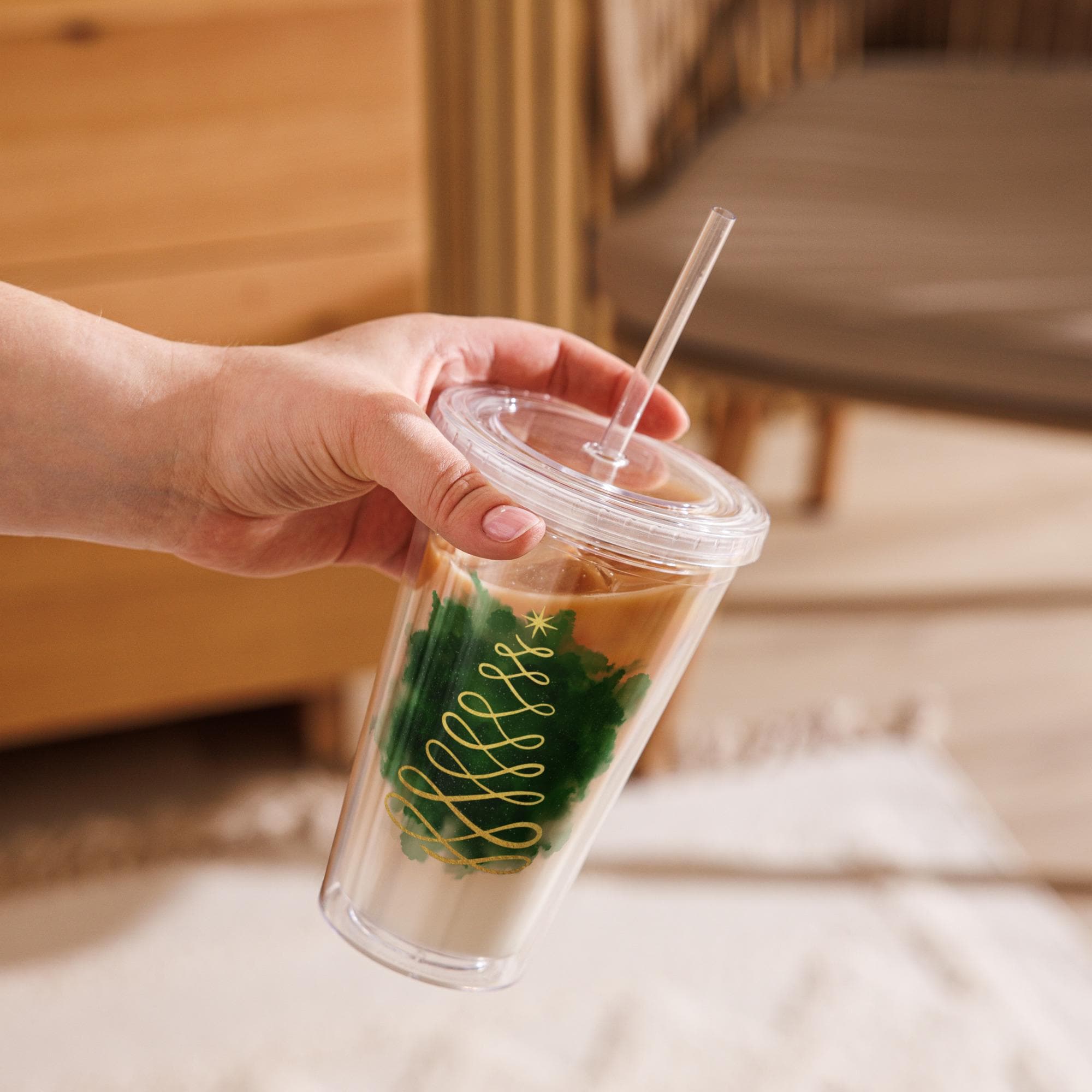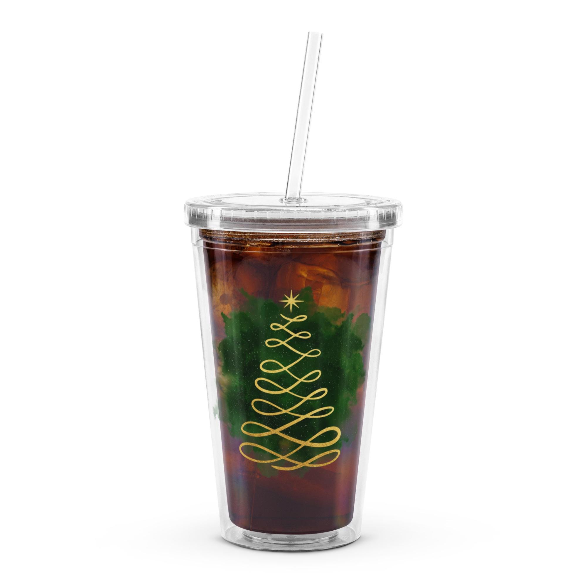 Sip in seasonal style with this 16-ounce clear double-wall tumbler, featuring a minimalist gold Christmas tree set against a dark green watercolor background. The festive yet modern design brings subtle holiday elegance to your everyday routine — perfect for iced coffee, sparkling water, or cold holiday cocktails. Made from durable, insulated plastic, this tumbler keeps your drinks cool longer while preventing condensation. It comes with a matching clear lid and reusable straw, making it both practical and gift-worthy.