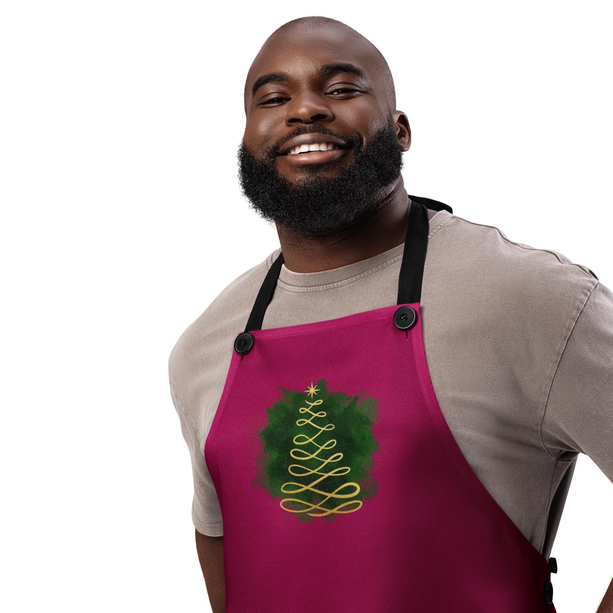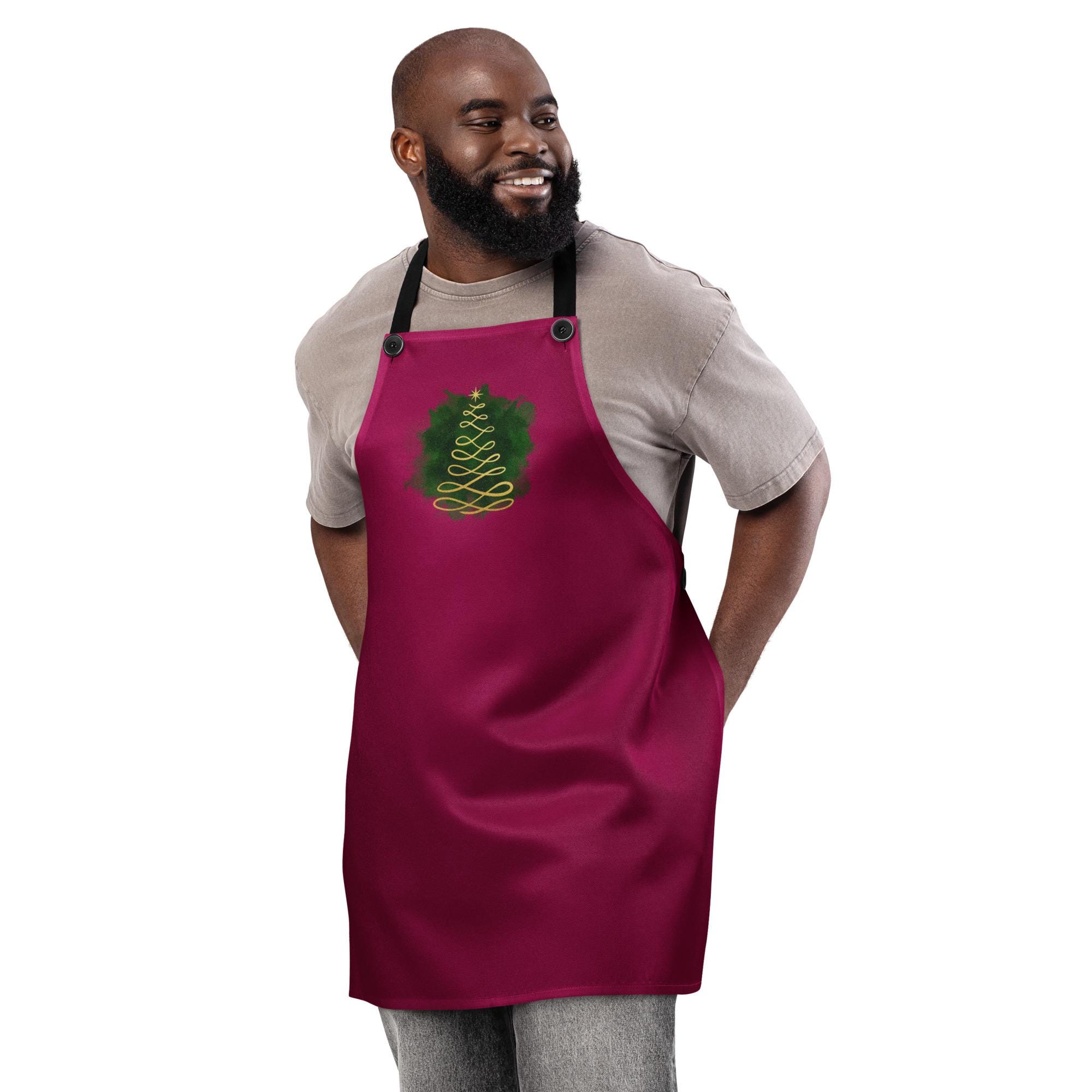 Cook, bake, and celebrate the holidays in style with this dark red apron featuring a minimalist gold Christmas tree — the perfect blend of festive elegance and everyday practicality. Designed for both men and women, this unisex apron offers a warm, modern holiday look that’s ideal for Christmas cooking, entertaining, and gift giving. Made from 100% durable polyester, it’s built to withstand spills and splashes while keeping you comfortable. The button-adjustable neck straps ensure the perfect fit, and the 27.6" x 30.3" size provides great coverage for all your holiday kitchen adventures.