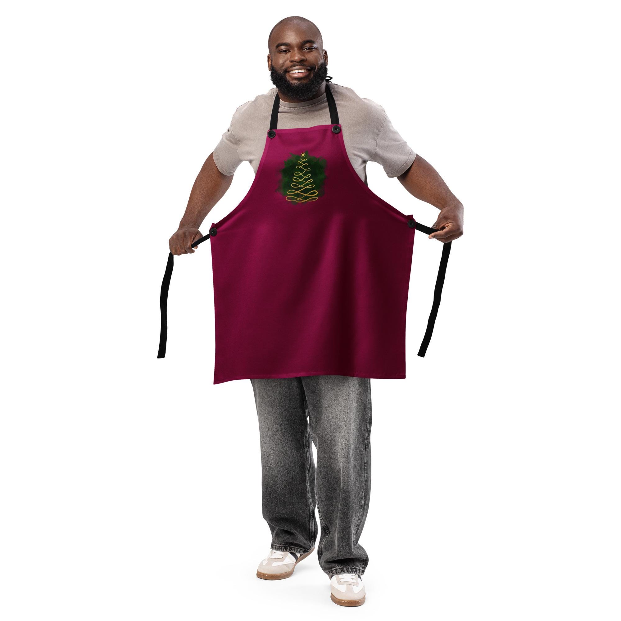 🌲 Design: Minimalist gold Christmas tree on rich dark red fabric 📏 Size: 27.6" W x 30.3" H (one size fits most) 🧵 Material: 100% polyester – durable, easy to clean, spill-resistant 🔘 Adjustable: Button-adjustable neck straps for a custom fit 👩🍳 Fit: Unisex – suitable for all cooks and bakers 🧼 Care: Machine wash cold, gentle cycle; tumble dry low or hang dry 🎁 Perfect for: Holiday cooking, baking, grilling, and festive gatherings