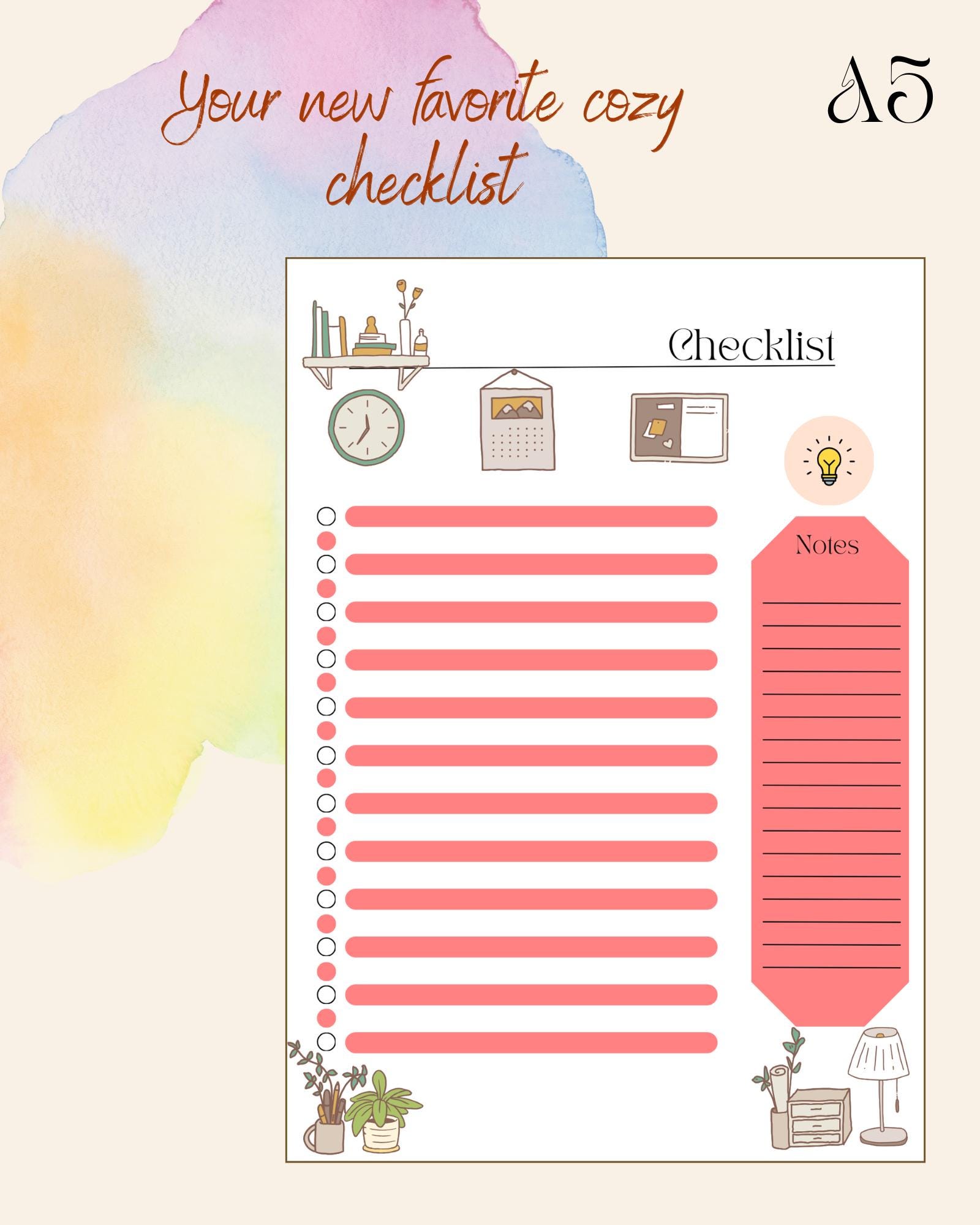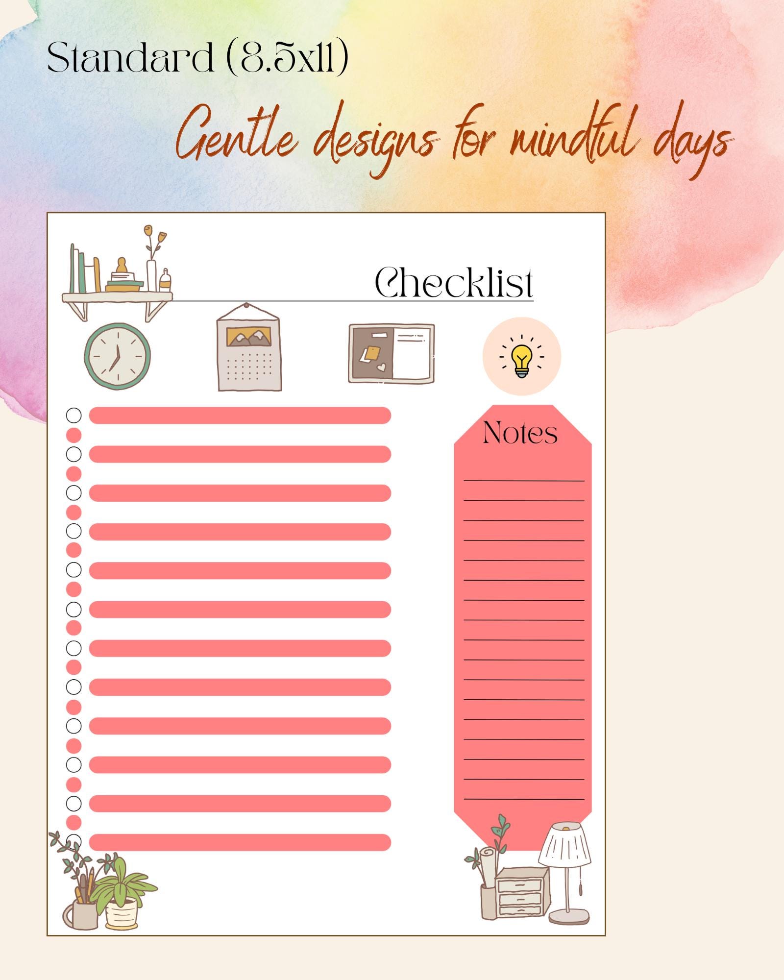 Each checklist features: 🌿 A title space to name your list or project ✅ 23 lines with matching check dots to track daily tasks ✏️ Notes section on the right side for quick reminders or extra details 🕯️ Comfort-inspired graphics — books, plants, a clock, and desk essentials in muted tones, creating a peaceful workspace feel