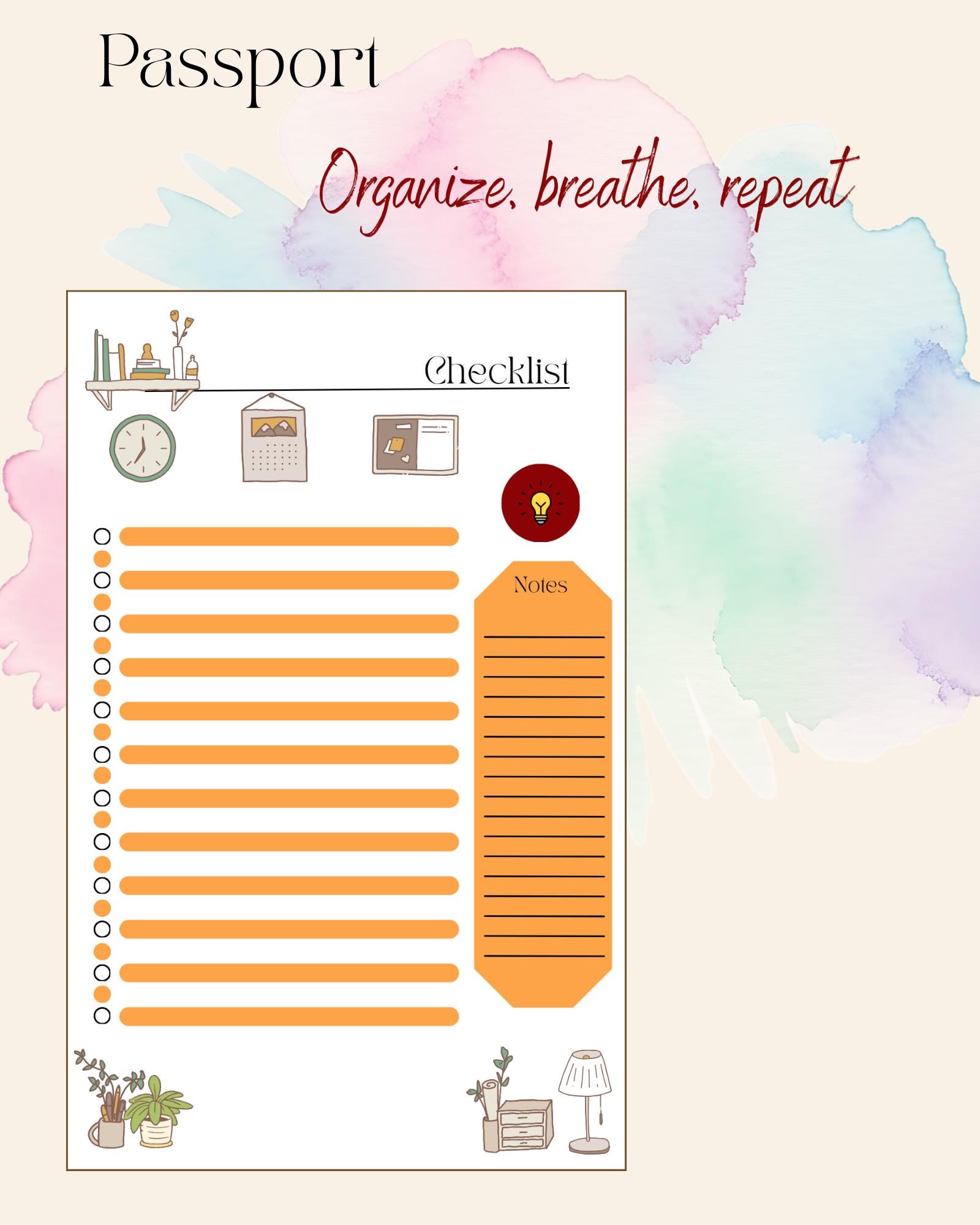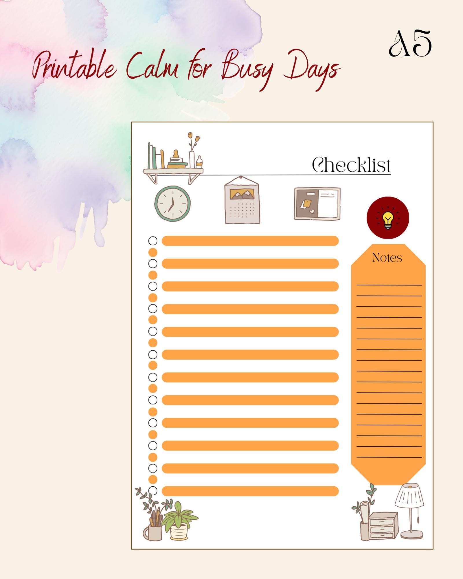 Each checklist features: 🌿 A title space to name your list or project ✅ 23 lines with matching check dots to track daily tasks ✏️ Notes section on the right side for quick reminders or extra details 🕯️ Comfort-inspired graphics — books, plants, a clock, and desk essentials in muted tones, creating a peaceful workspace feel