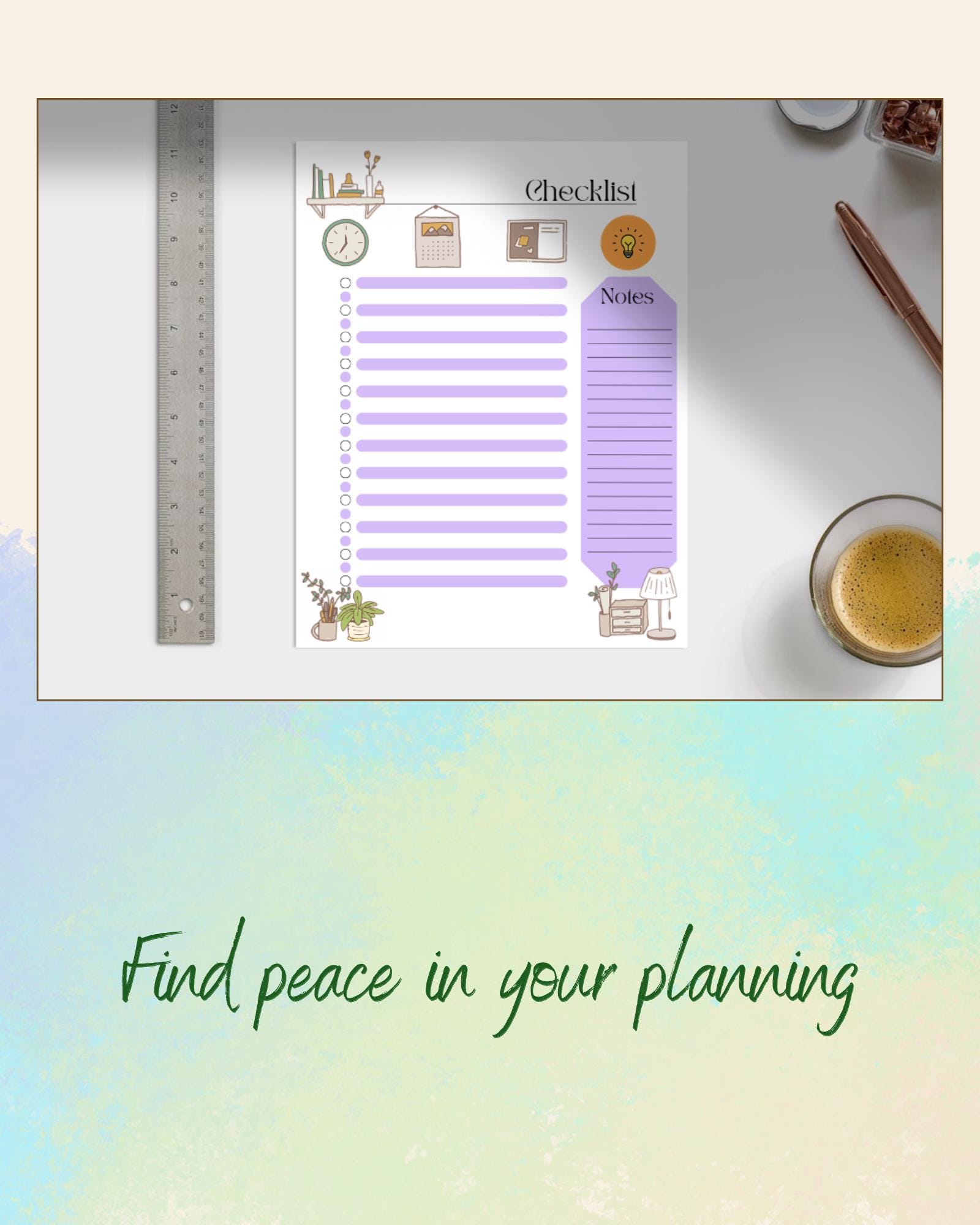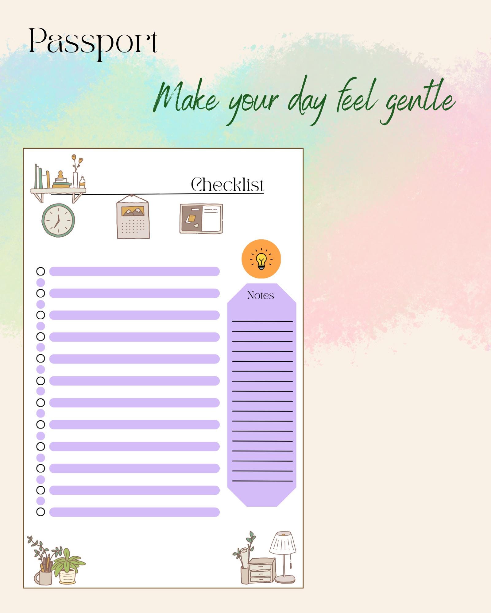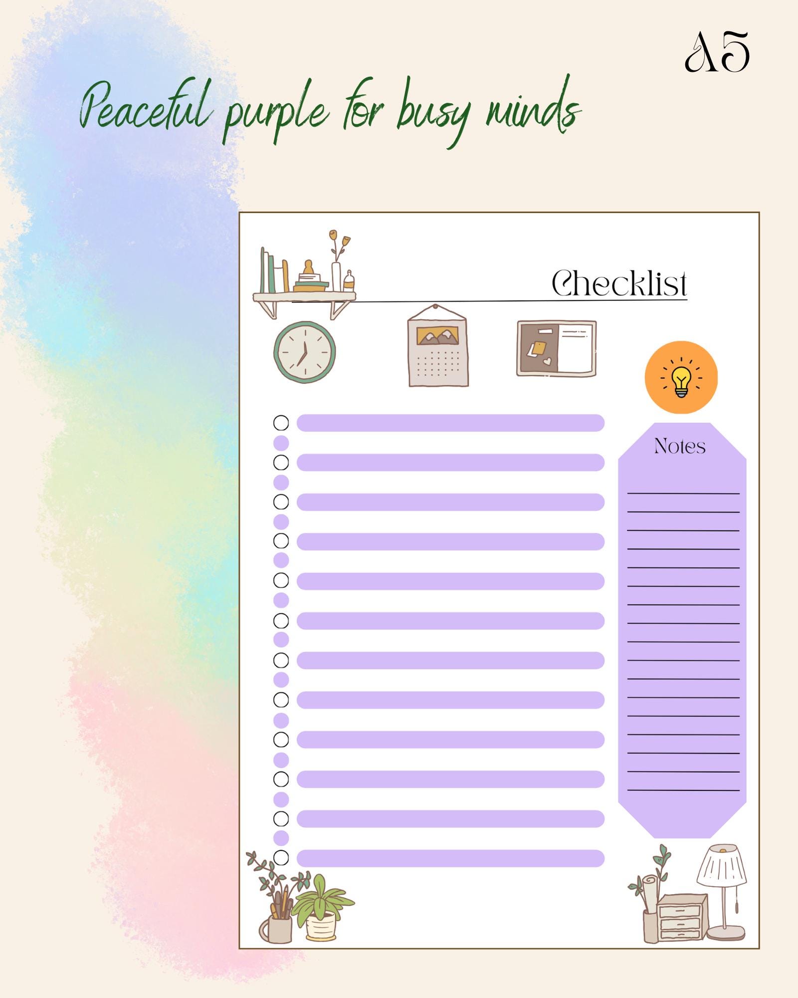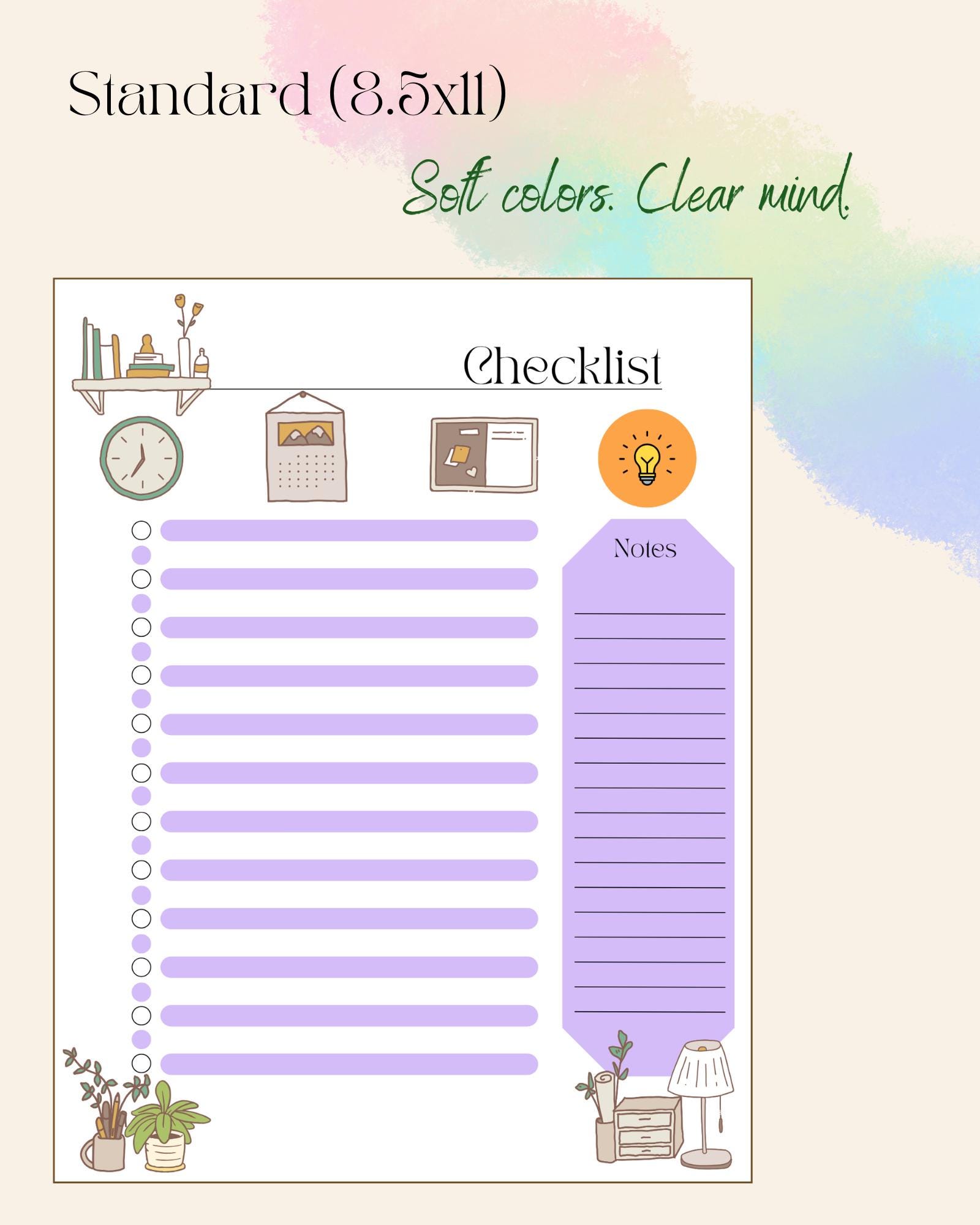 Each checklist features: 🌿 A title space to name your list or project ✅ 23 lines with matching check dots to track daily tasks ✏️ Notes section on the right side for quick reminders or extra details 🕯️ Comfort-inspired graphics — books, plants, a clock, and desk essentials in muted tones, creating a peaceful workspace feel