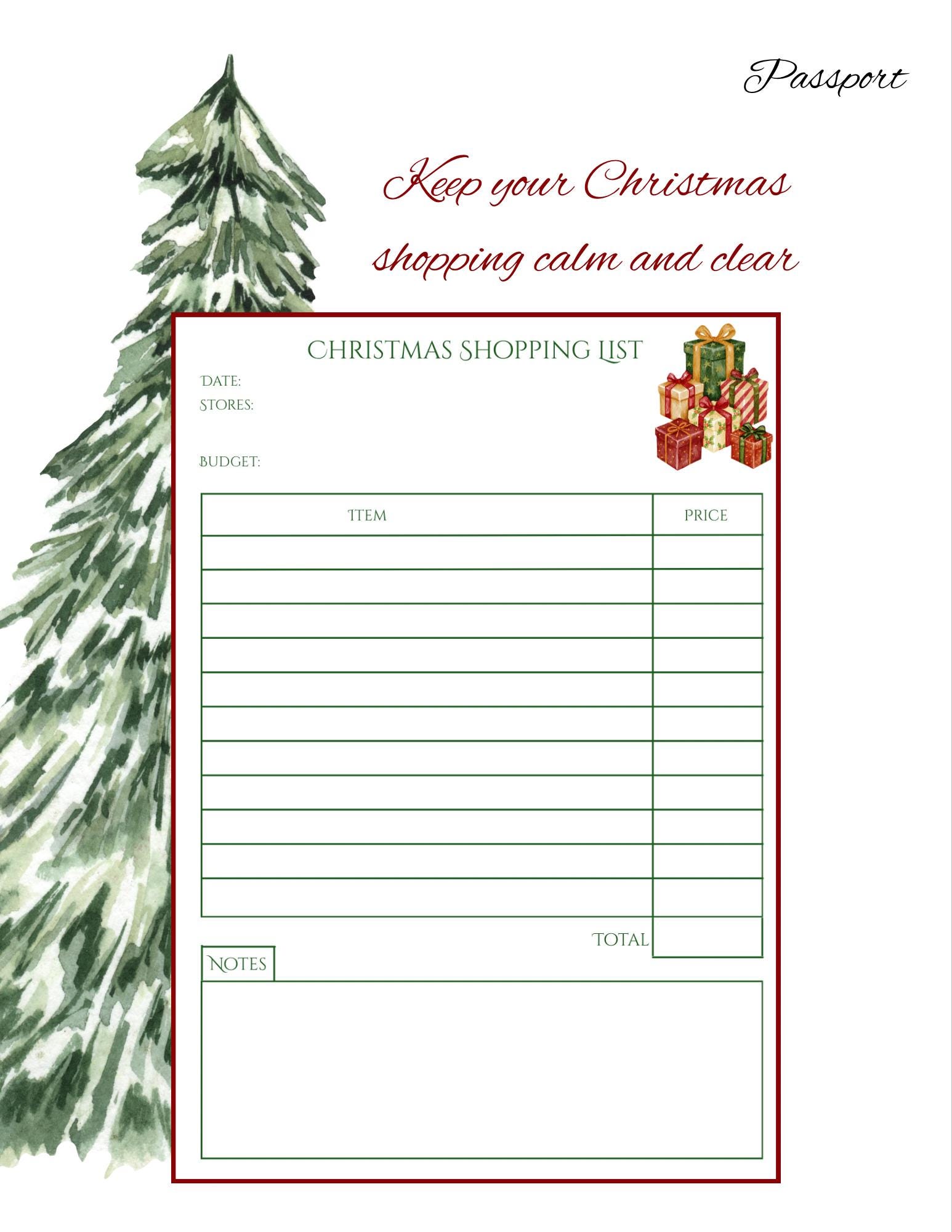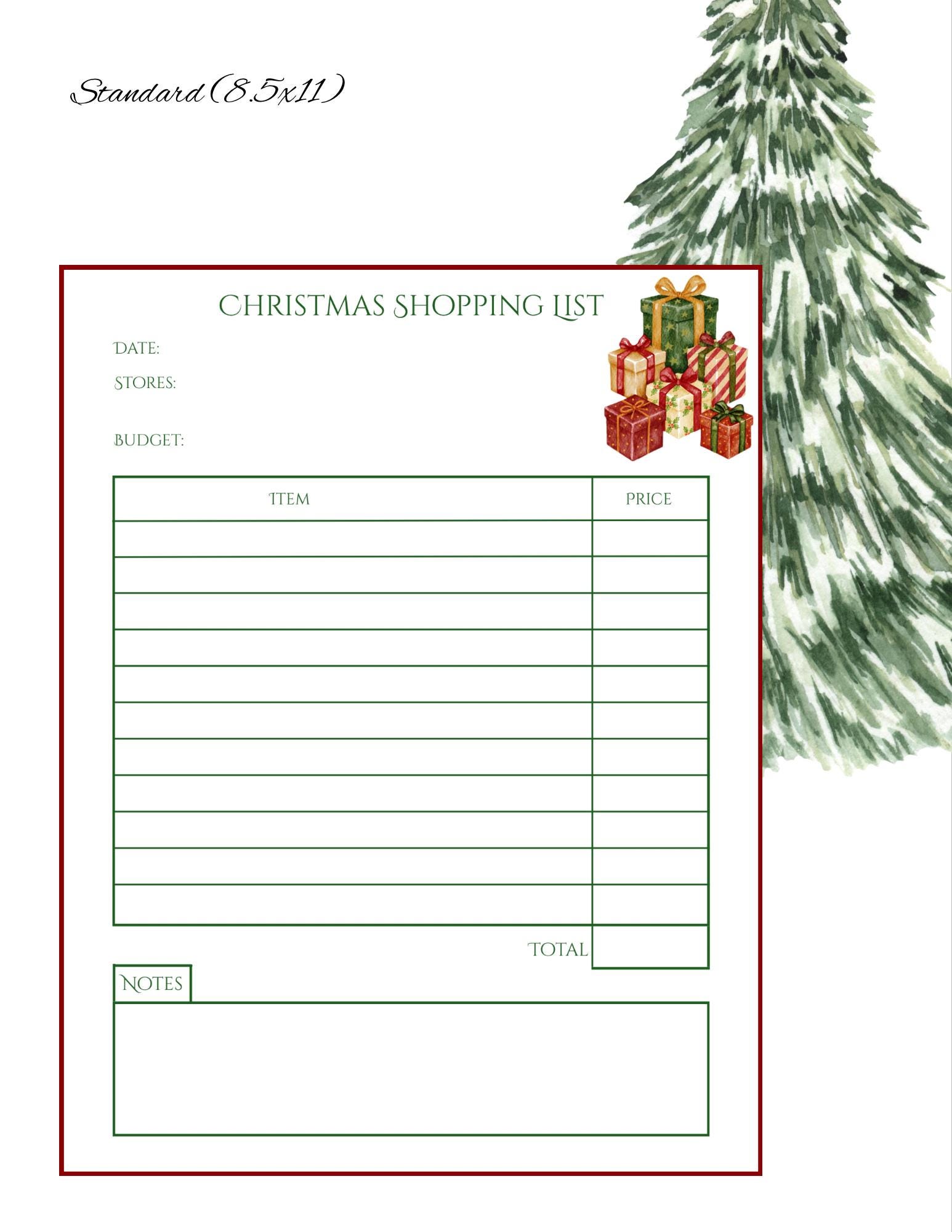 Includes: 1 Christmas Gift Shopping List printable 3 sizes — Standard (US Letter), A5, and Passport