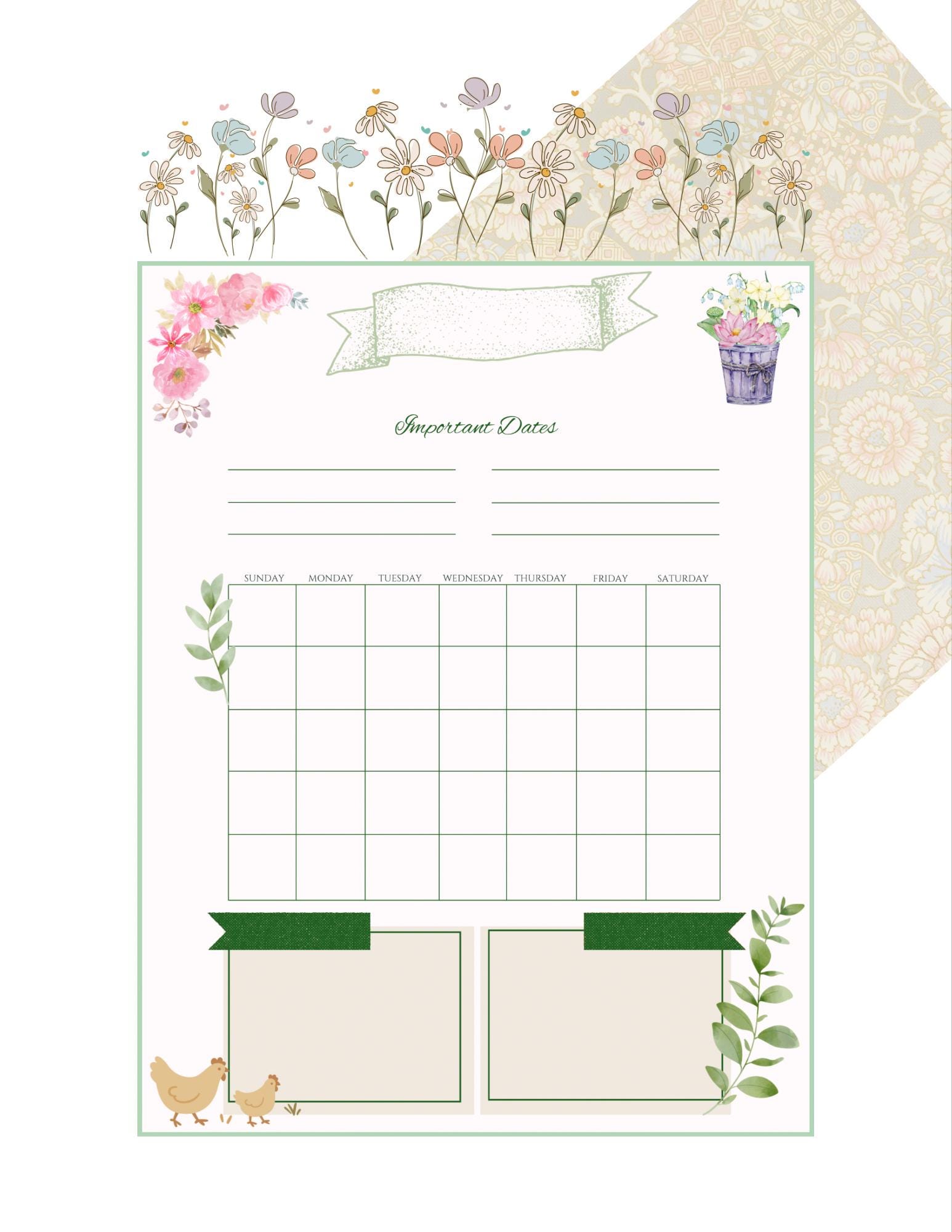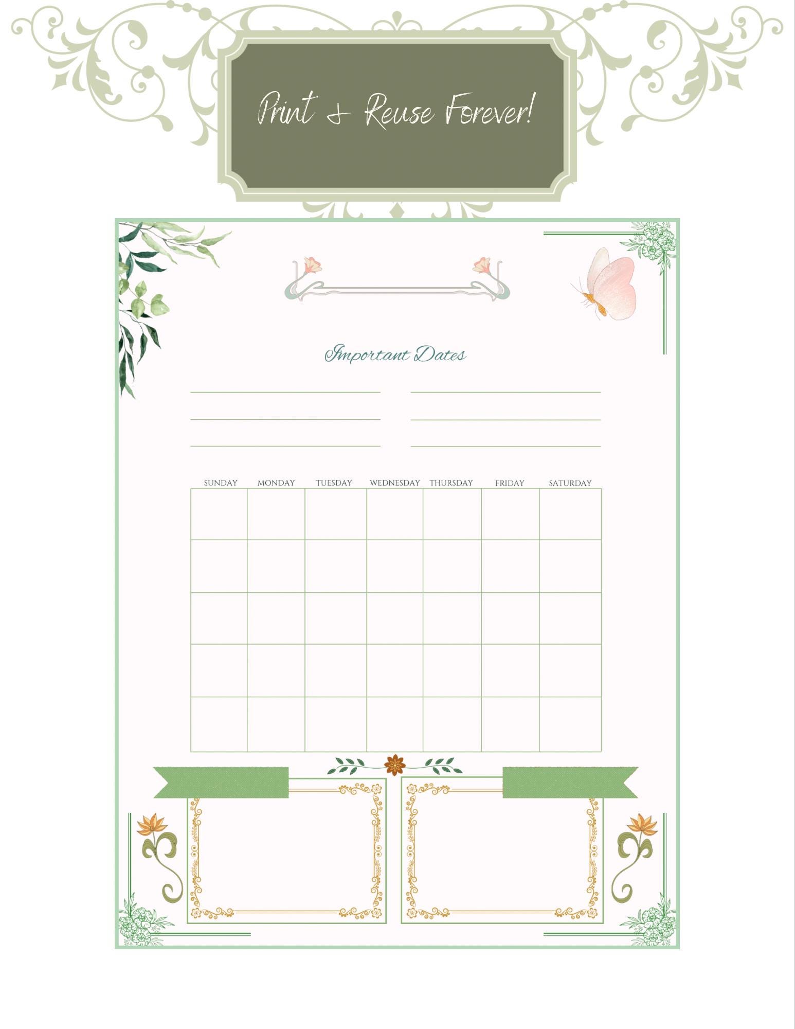 Layout Overview: Write-in month header Six lines for important dates Undated monthly calendar Two notes sections below