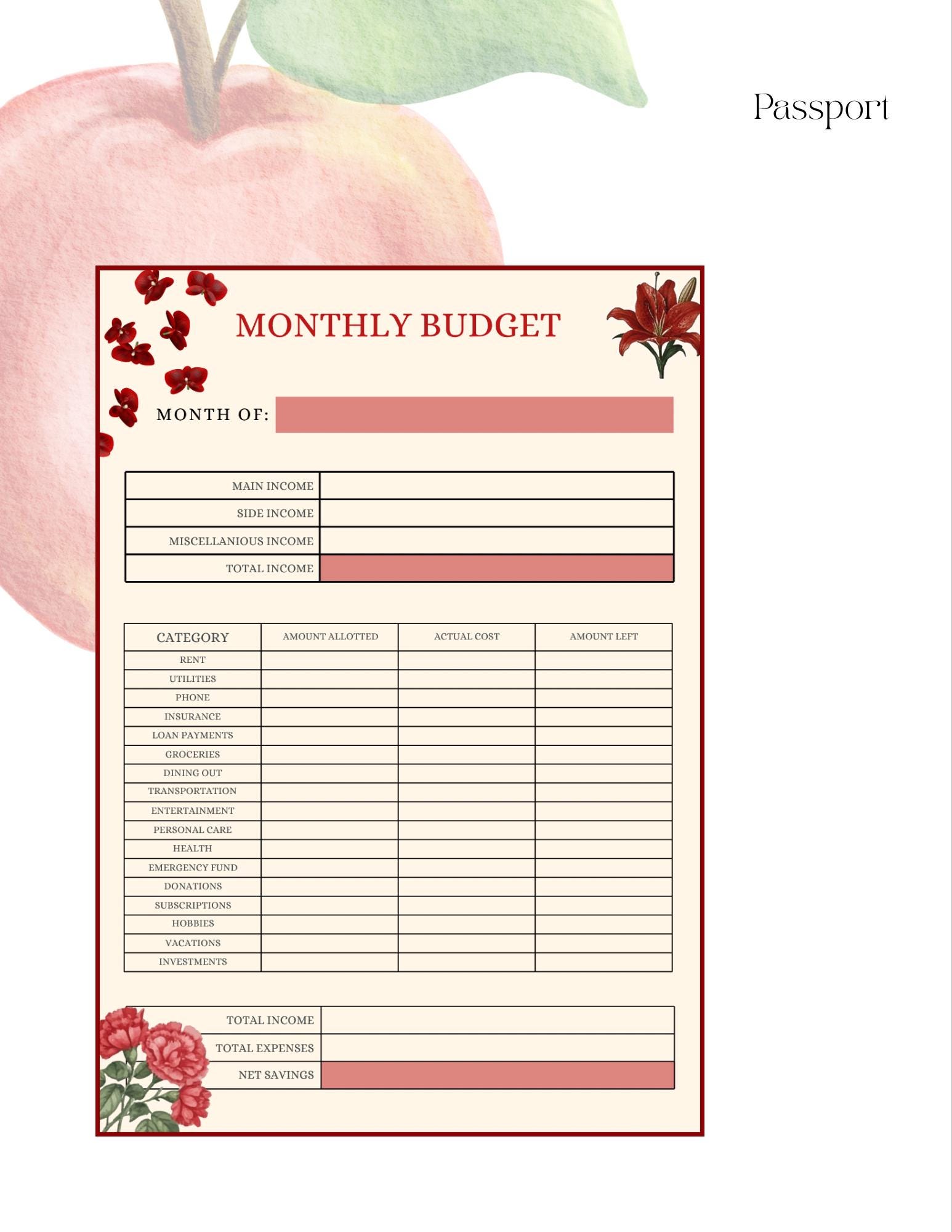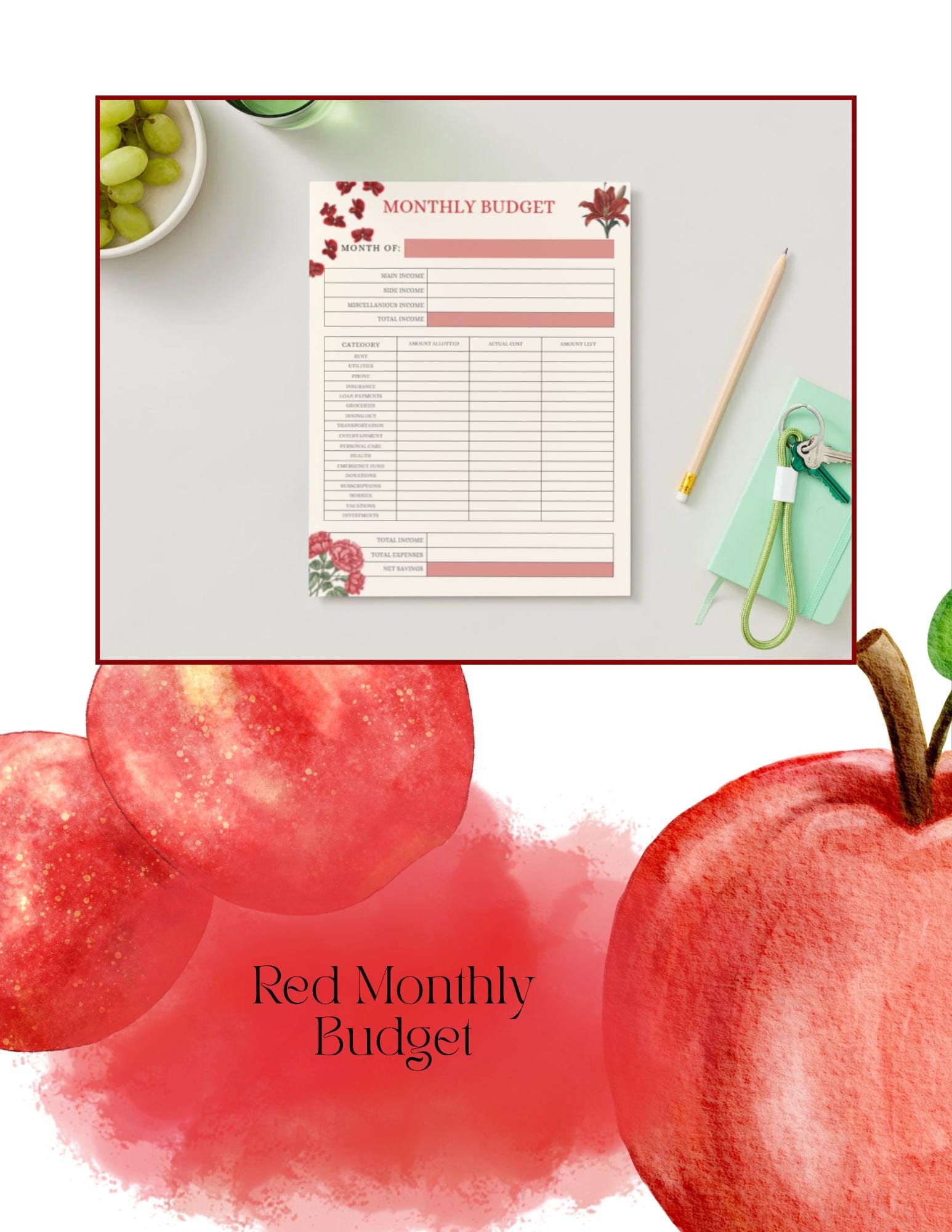 Includes: 1 Red Monthly Budget Planner printable 3 sizes — Standard (US Letter), A5, and Passport