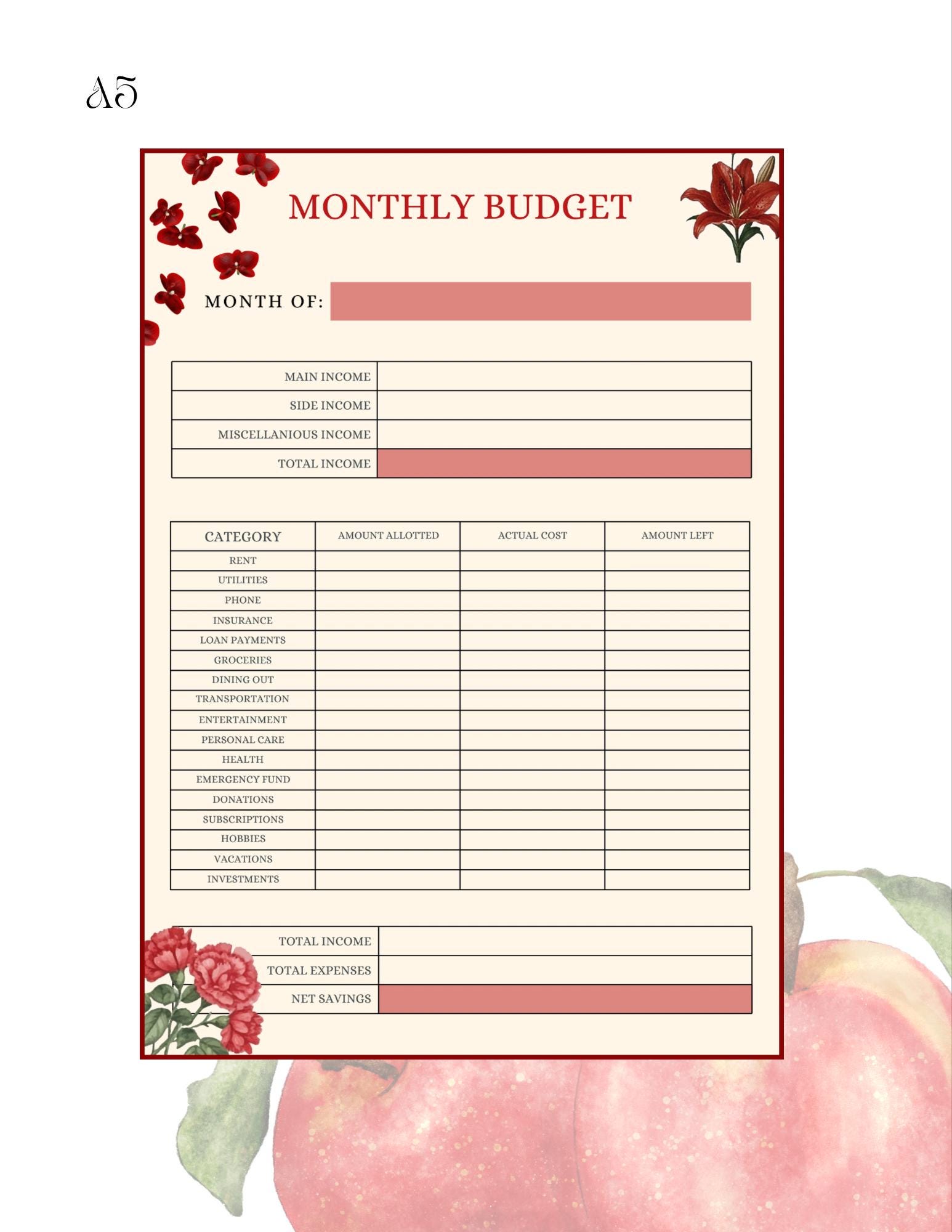 Add warmth and charm to your finances with this floral Red Monthly Budget Planner — a cozy printable for mindful, organized money tracking.