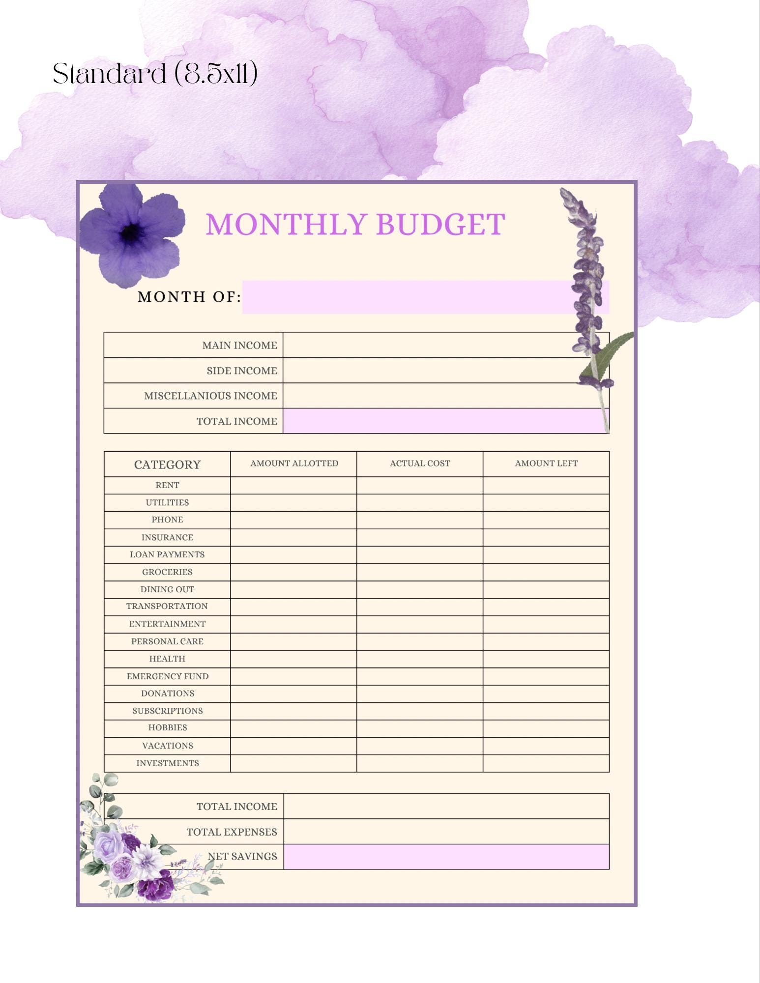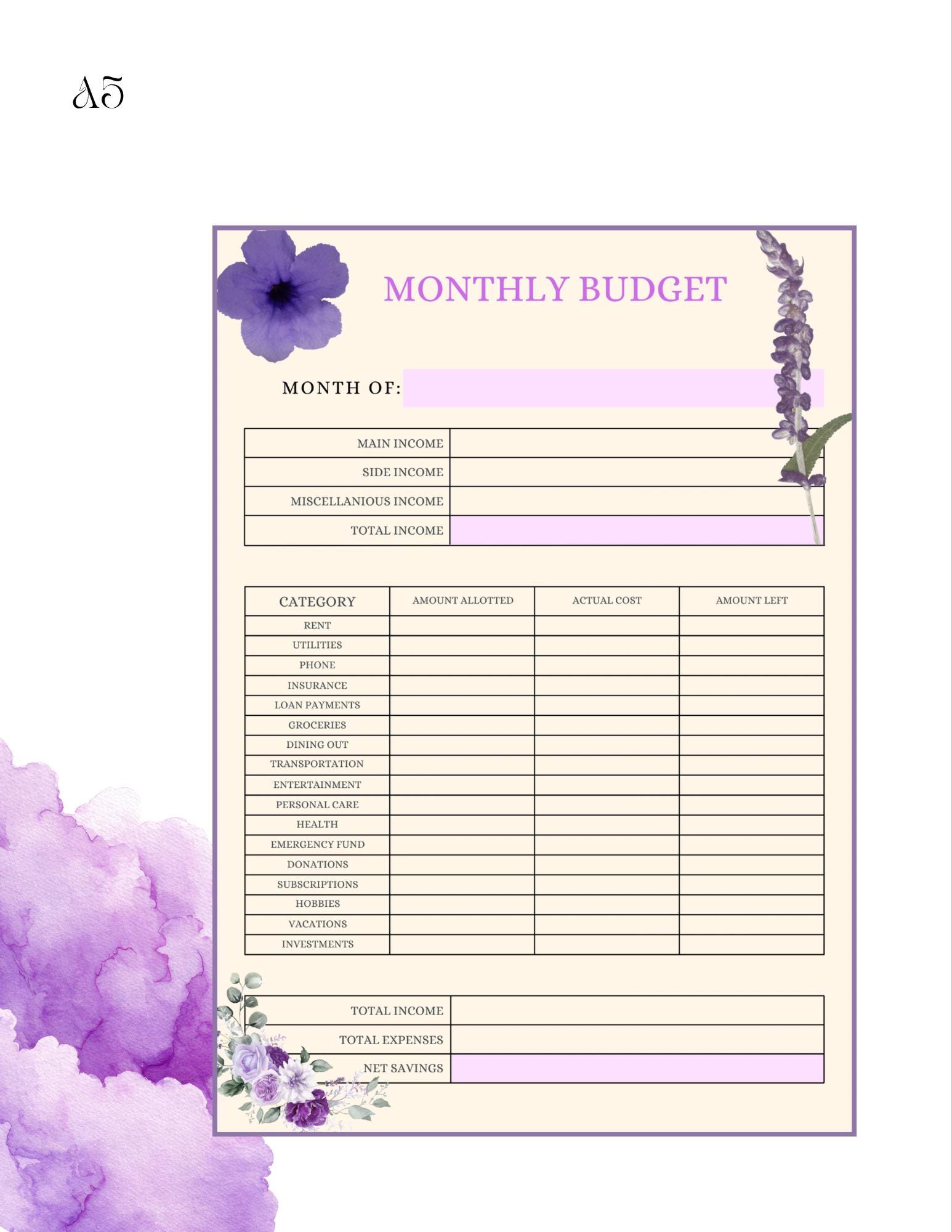Set against a soft cream background with delicate purple watercolor flowers, this planner turns your budgeting routine into a simple, soothing ritual. With clearly labeled spaces for income, expenses, and totals, it helps you track every detail while keeping your workspace beautiful and serene.