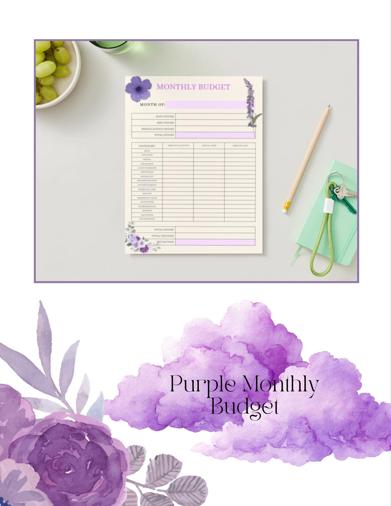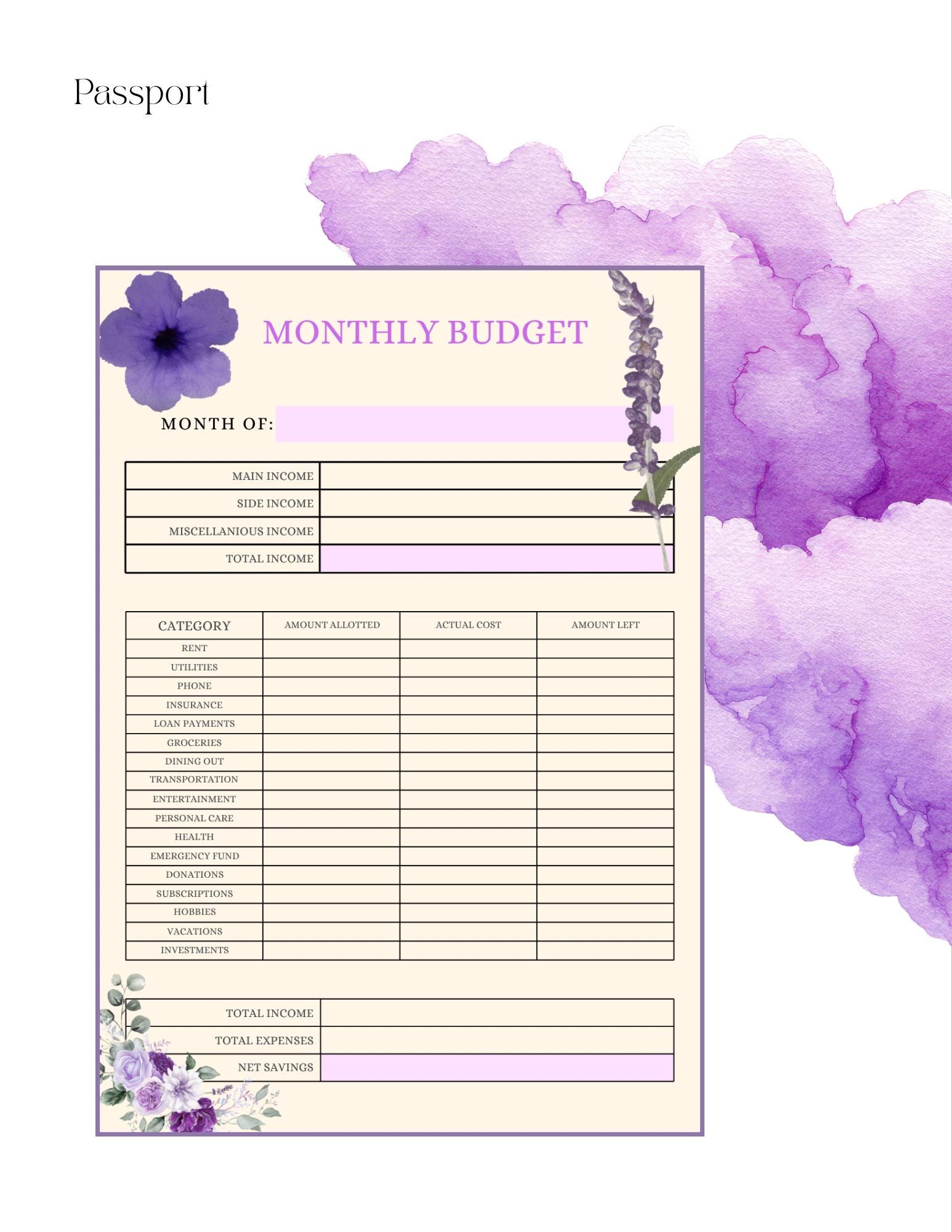 Includes: 1 Purple Monthly Budget Planner printable 3 sizes — Standard (US Letter), A5, and Passport