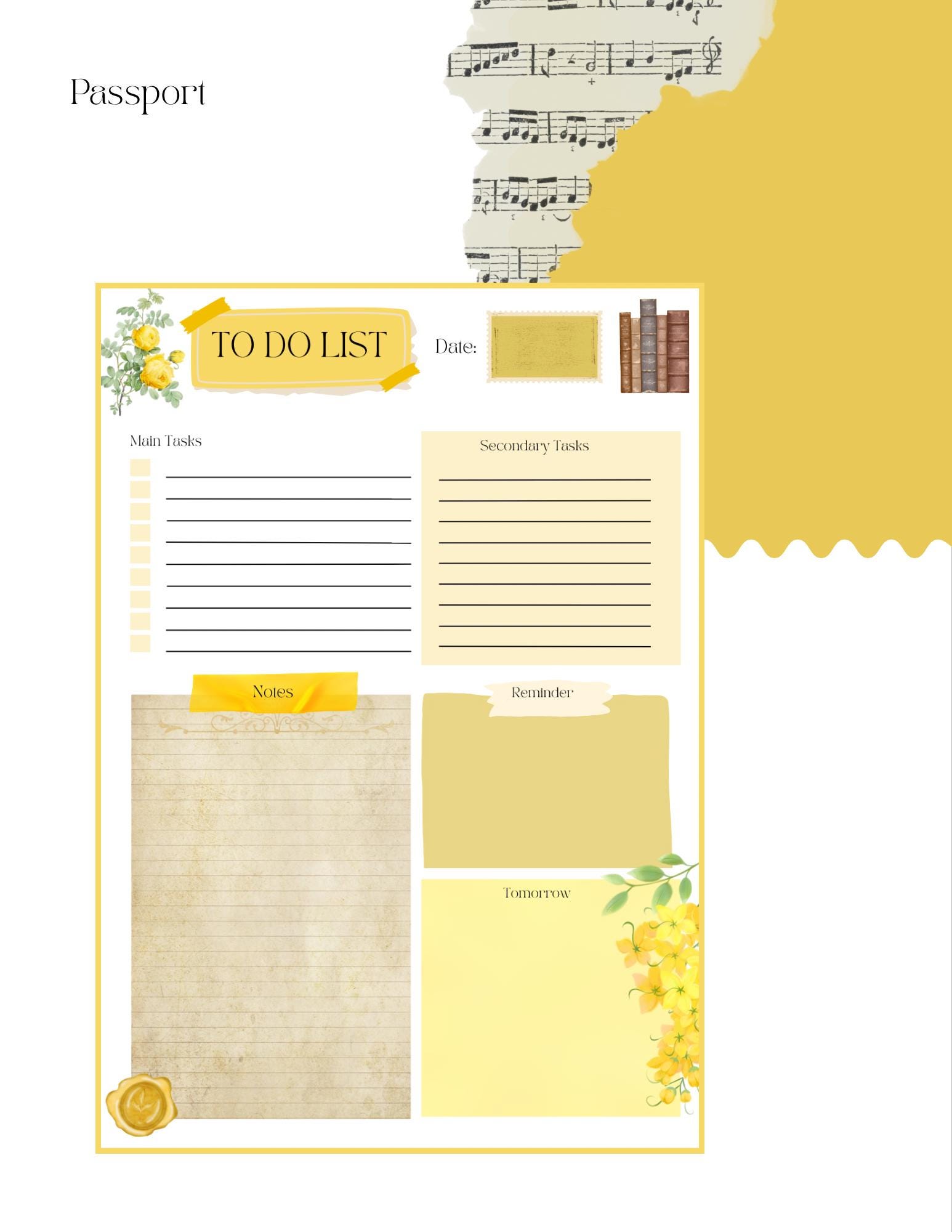 Includes: 1 Yellow Antique To-Do List printable 3 sizes — Standard (US Letter), A5, and Passport