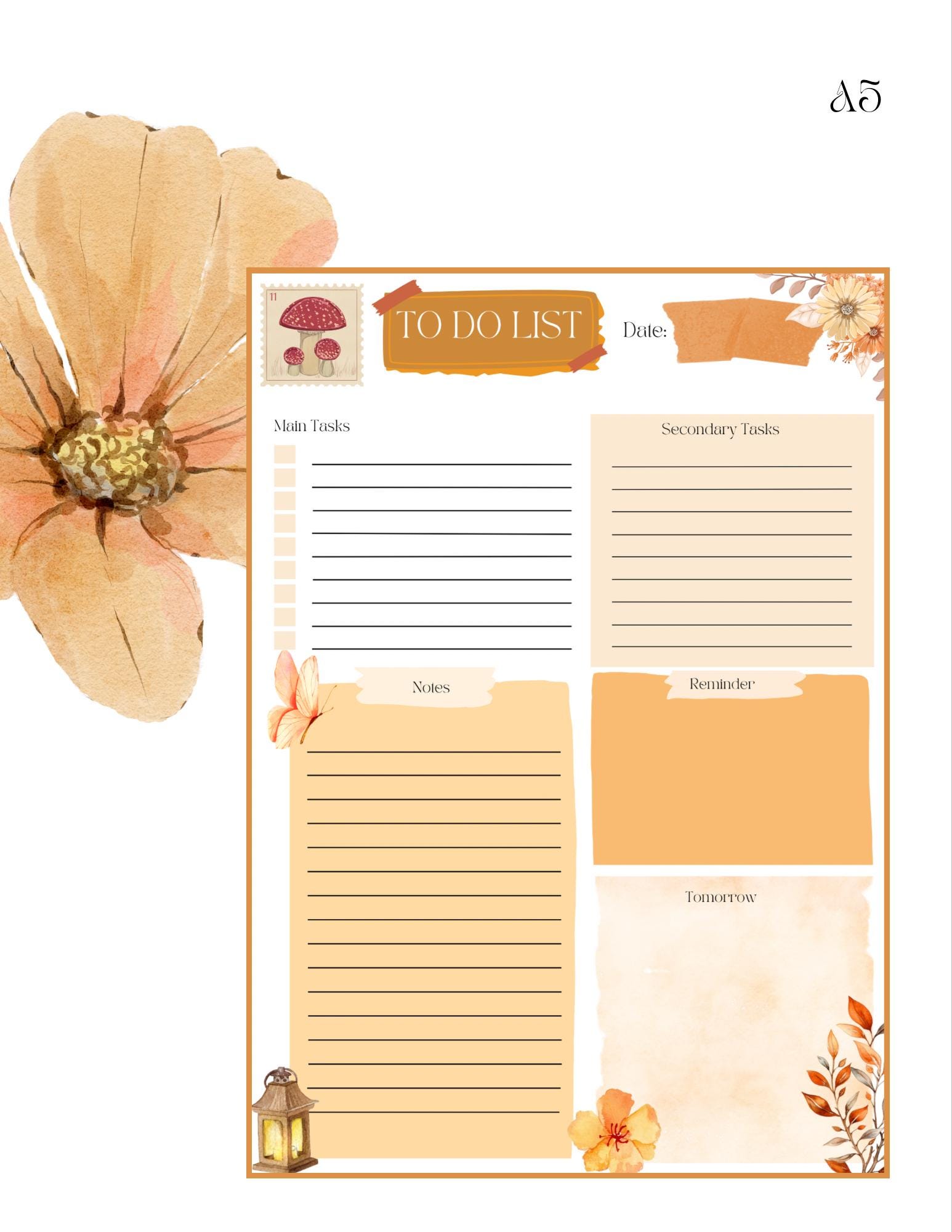 Designed with a soft antique paper background and warm orange tones, this printable combines timeless beauty with practicality. At the top, you’ll find space for the date, followed by dedicated areas for main tasks and secondary tasks. The bottom includes a notes section and space to plan tomorrow’s tasks — helping you end each day with focus and calm.