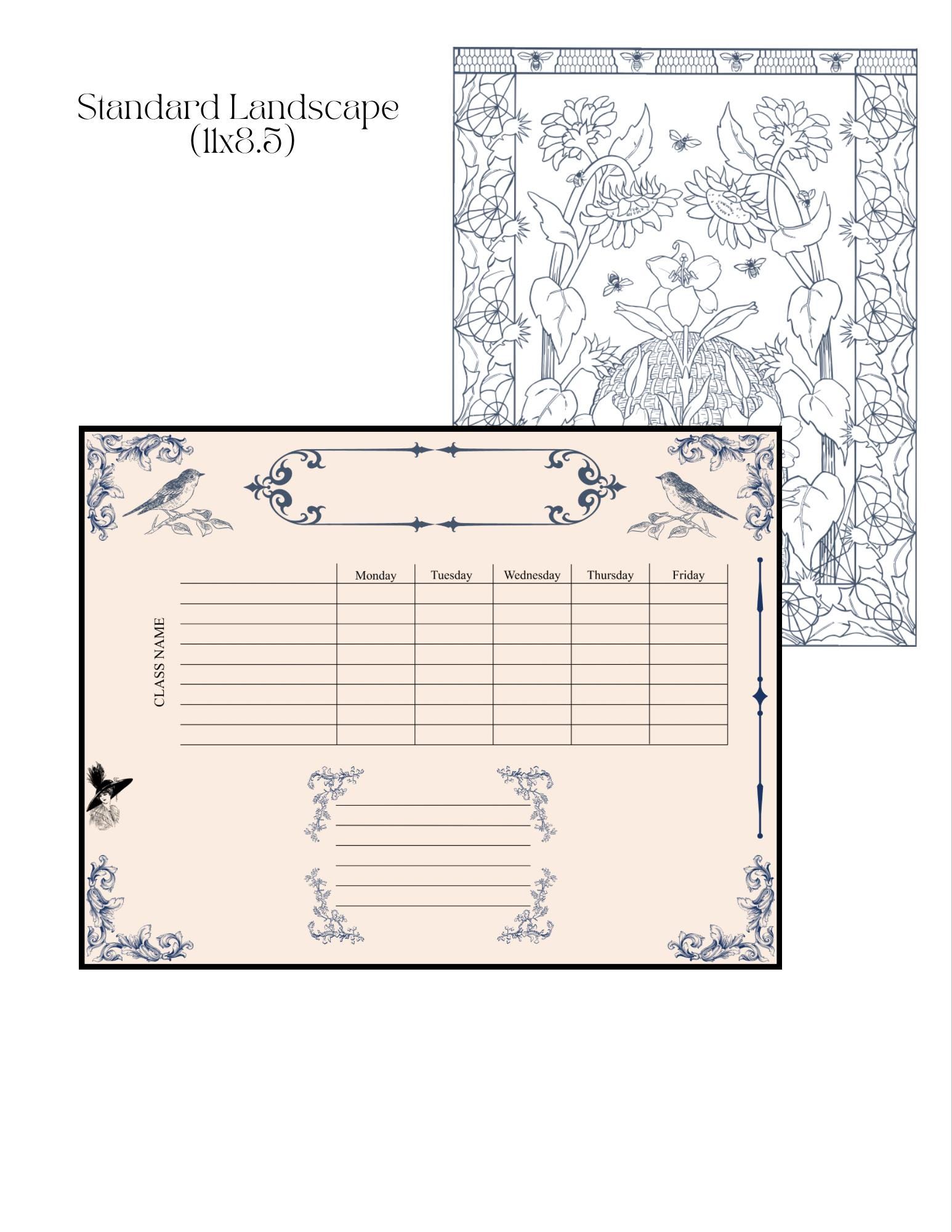 Includes: 1 Blue Victorian Art Deco Class Schedule printable 3 sizes — Standard (US Letter), A5, and Passport (Landscape)