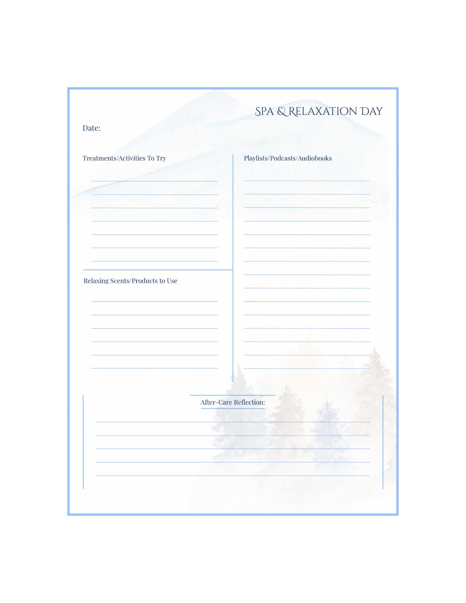 13 wellness pages (water tracker, meal log, movement & mindfulness, sleep, spa, weekly review)