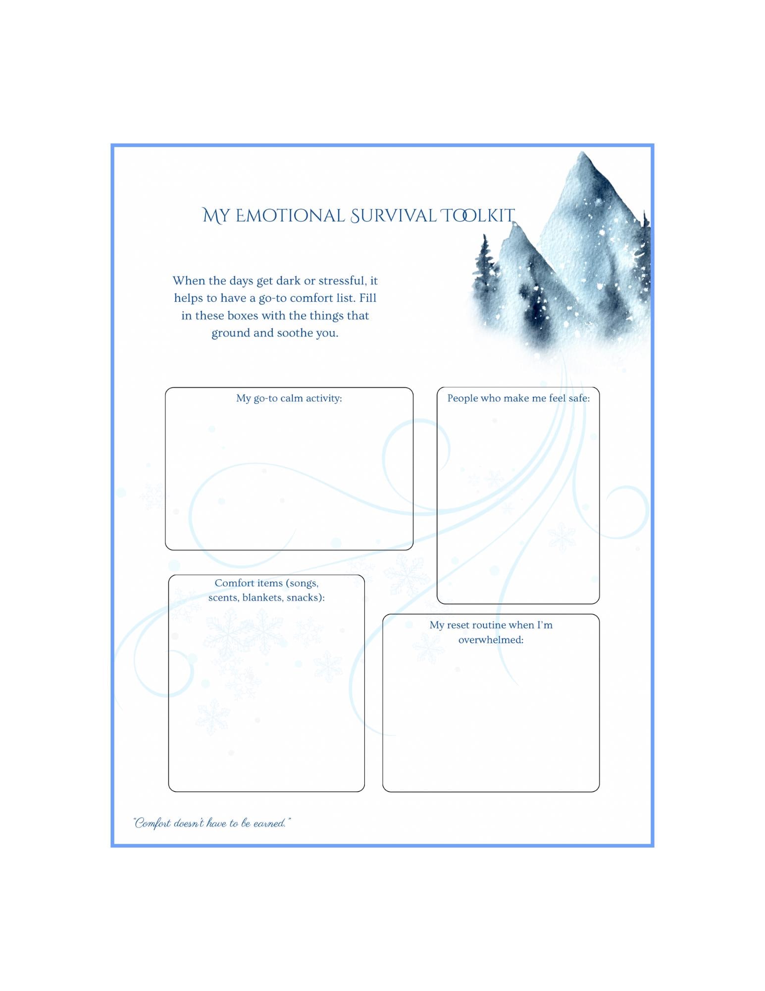 This gentle guided journal is your cozy companion for surviving the holidays and long winter months. Designed to bring calm, reflection, and small moments of joy, it helps you stay grounded when the season feels heavy.