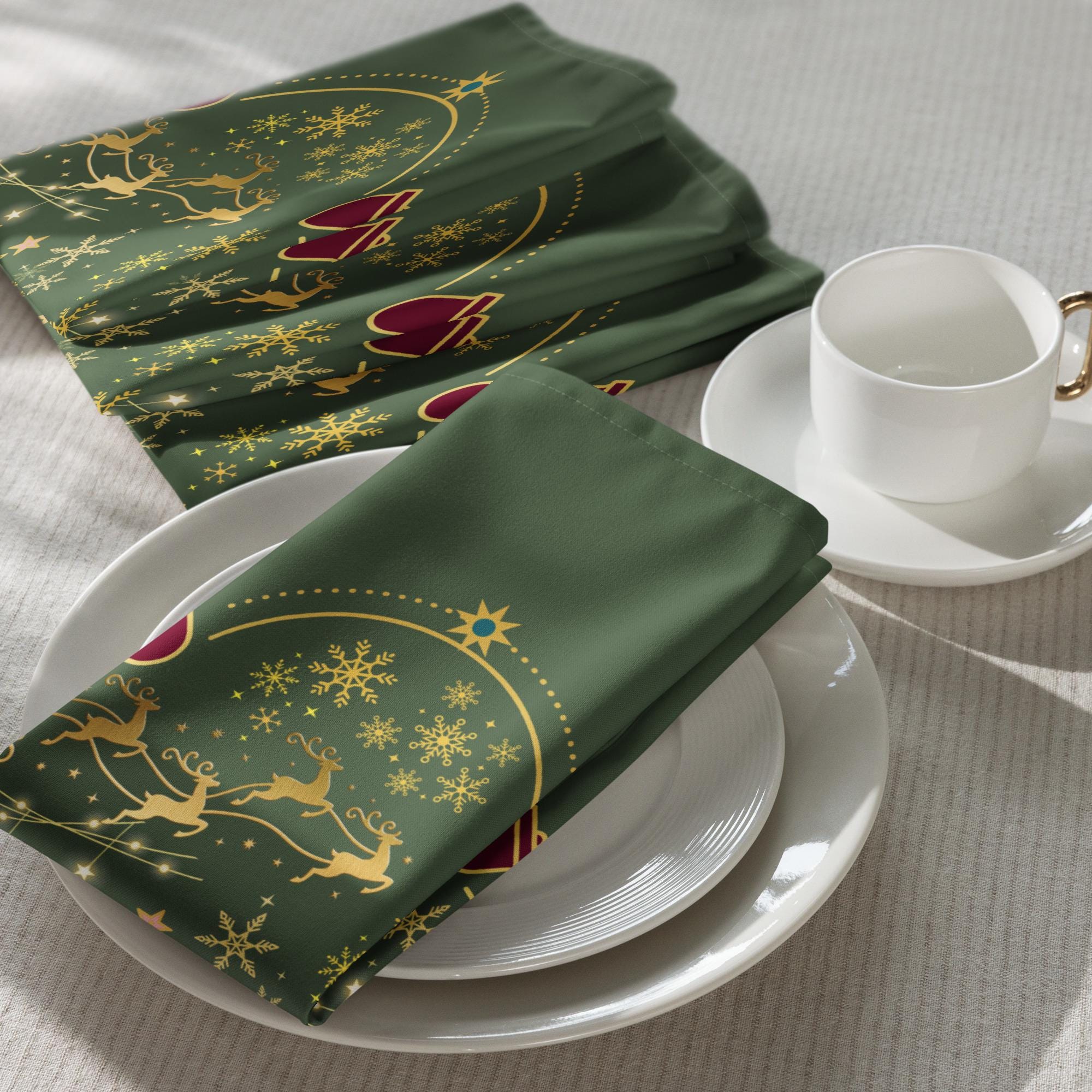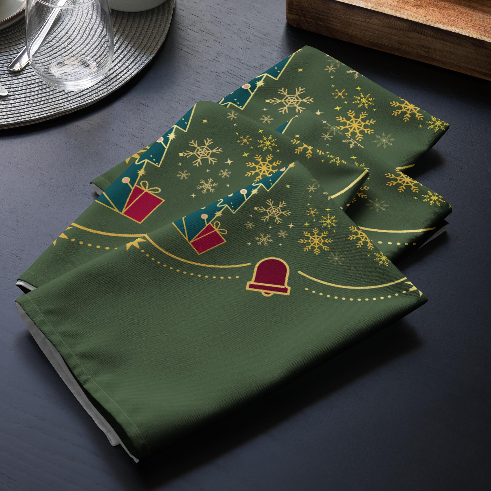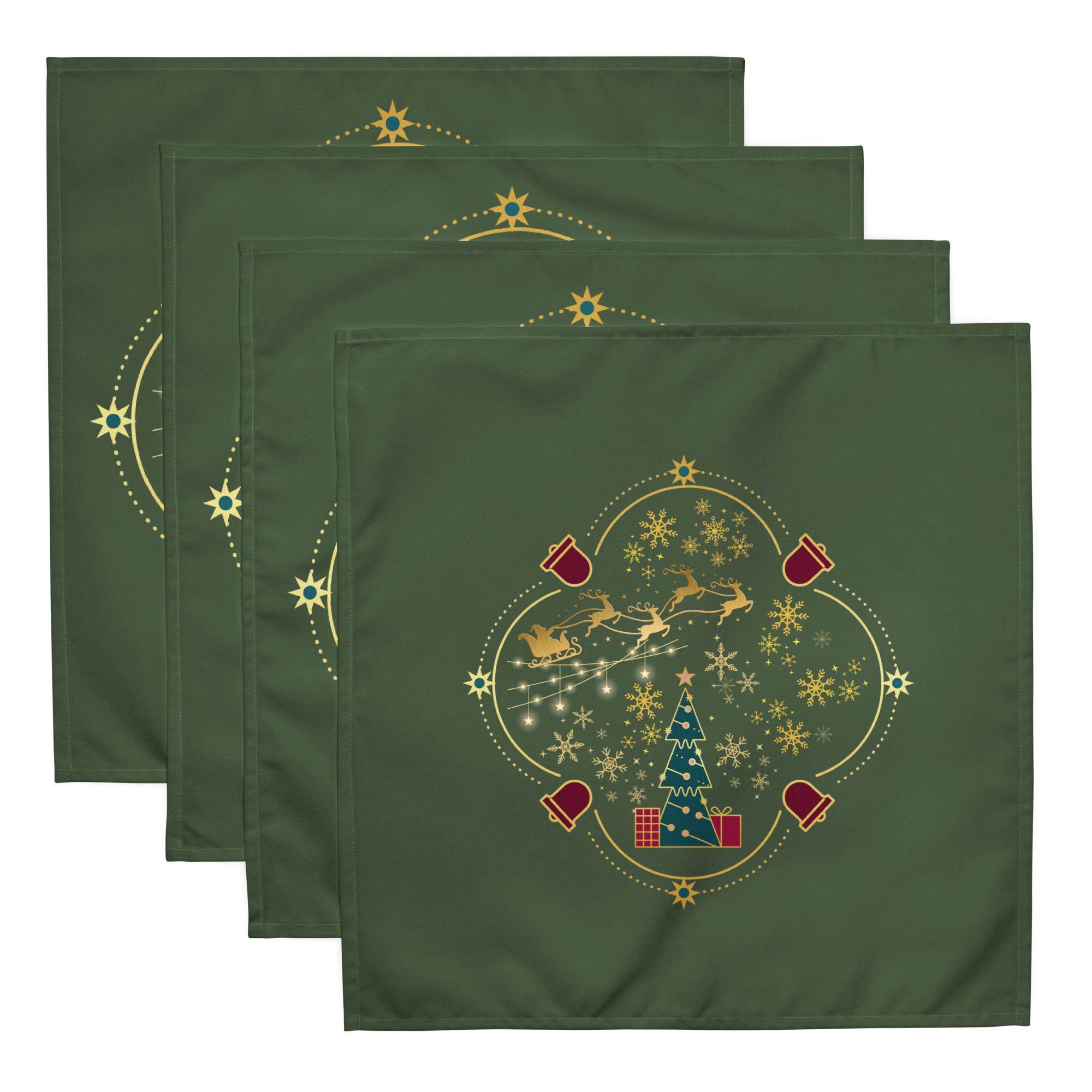 Add warmth, elegance, and festive charm to your holiday table with this set of four 20" × 20" cloth napkins, beautifully printed with a shimmering gold Christmas design on deep evergreen.