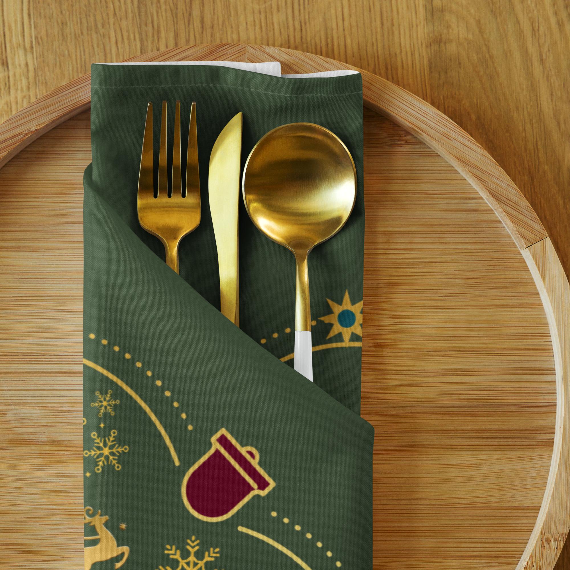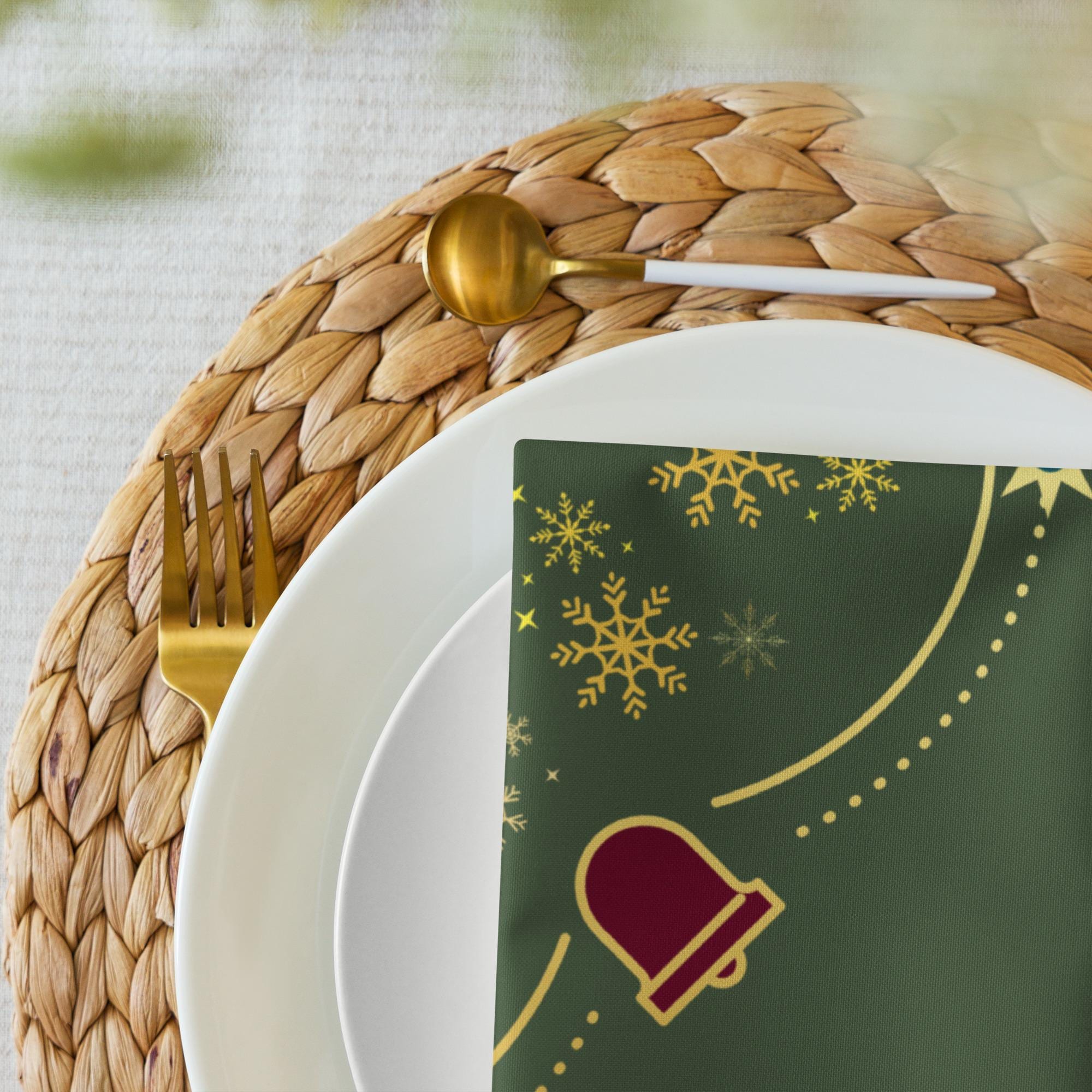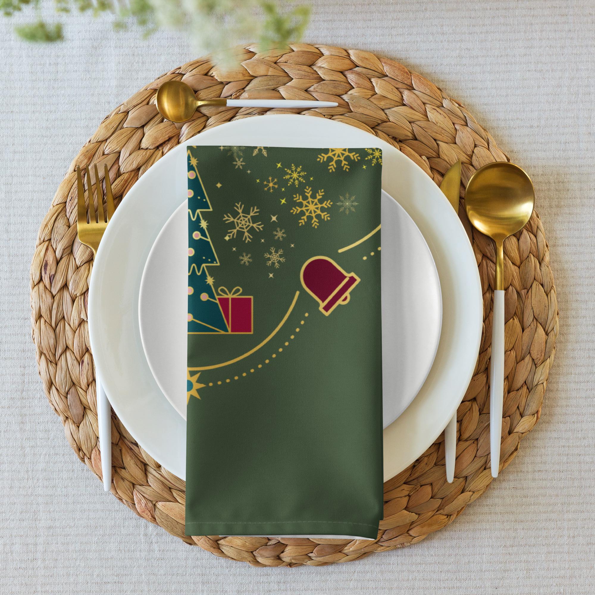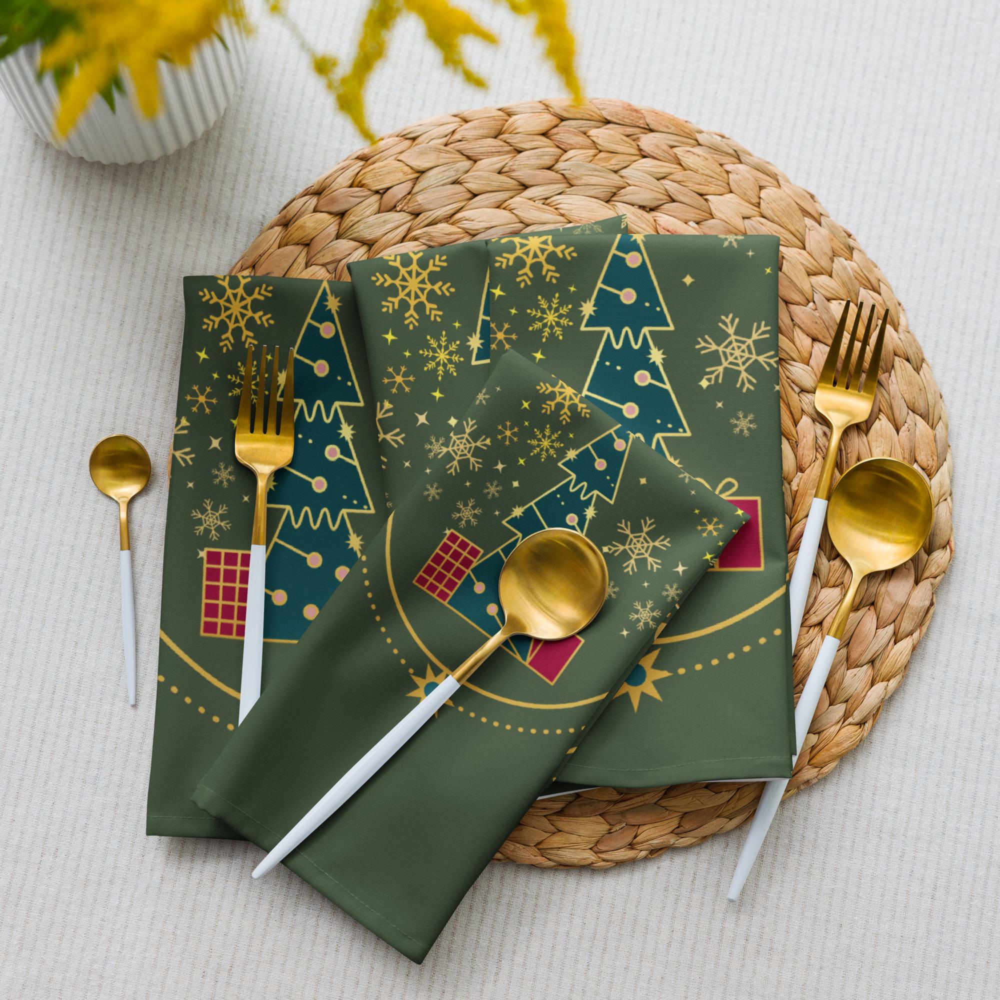 Add warmth, elegance, and festive charm to your holiday table with this set of four 20" × 20" cloth napkins, beautifully printed with a shimmering gold Christmas design on deep evergreen.