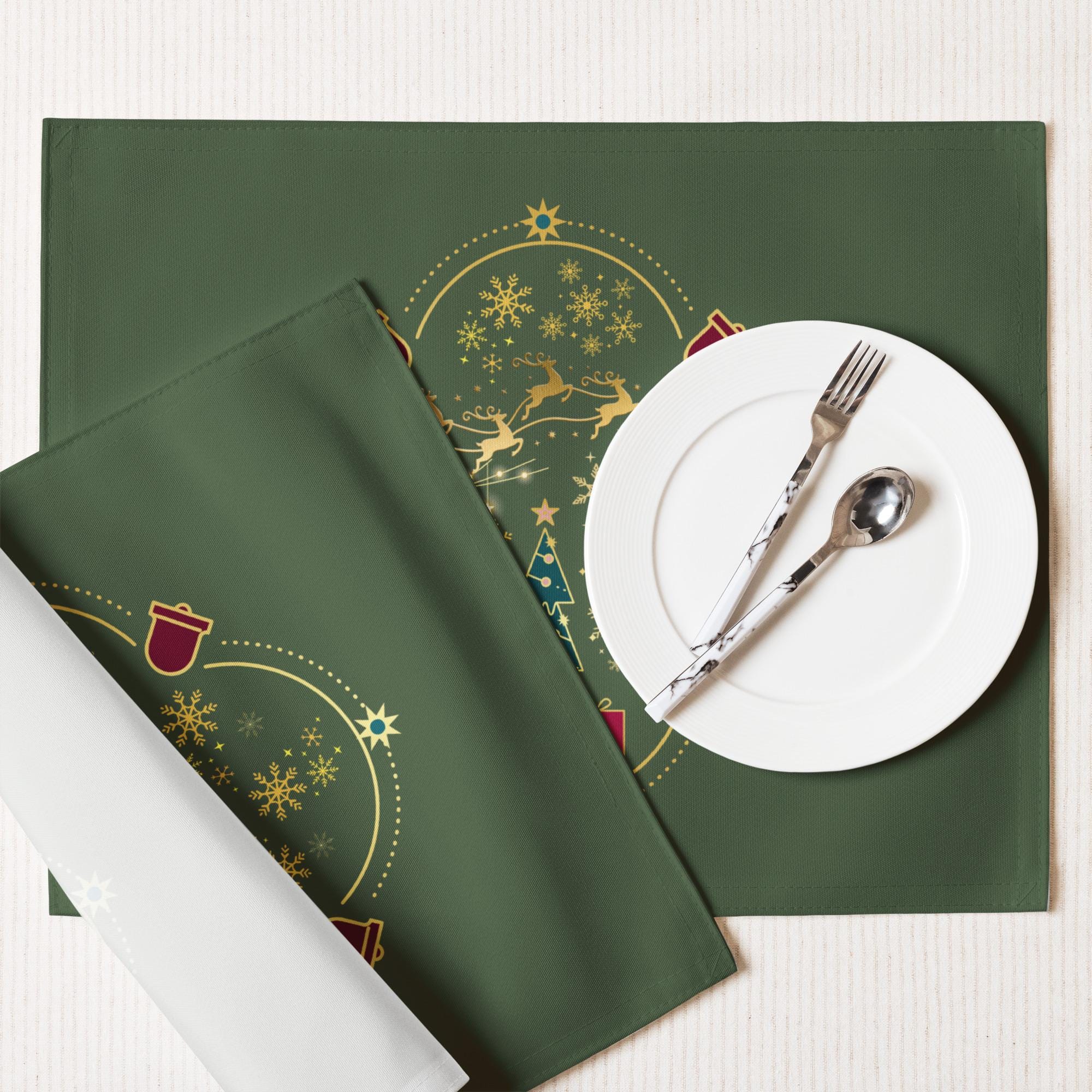 Cozy, festive water-resistant placemats in green and gold — perfectly matched to the Golden Christmas Planner Bundle.