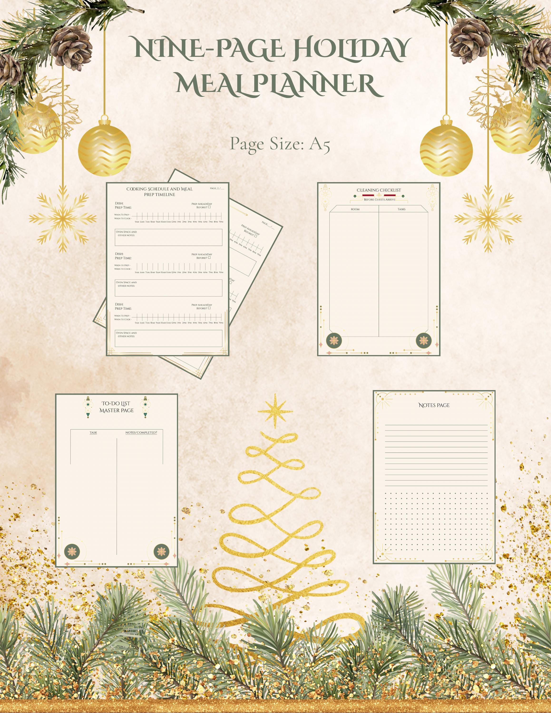 Make your holiday cooking calm, organized, and beautifully festive with this Holiday Meal Planner. This focused mini-bundle includes all the essential pages for planning Thanksgiving or Christmas meals, grocery lists, prep timelines, and cooking tasks — all wrapped in warm gold-on-green seasonal artwork.