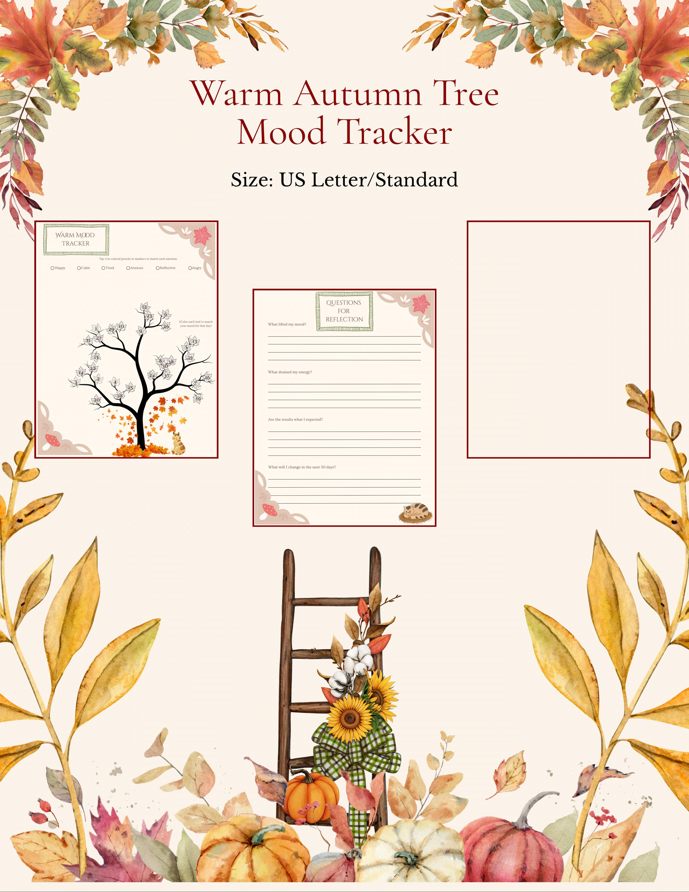 Curl up with a cup of tea and reflect with your cozy cat companion. This whimsical fall-themed mood tracker features 30 numbered leaves on a tree, each waiting for your daily mood color. A cat rests beneath golden leaves as you record your reflections, calm your mind, and dream freely.